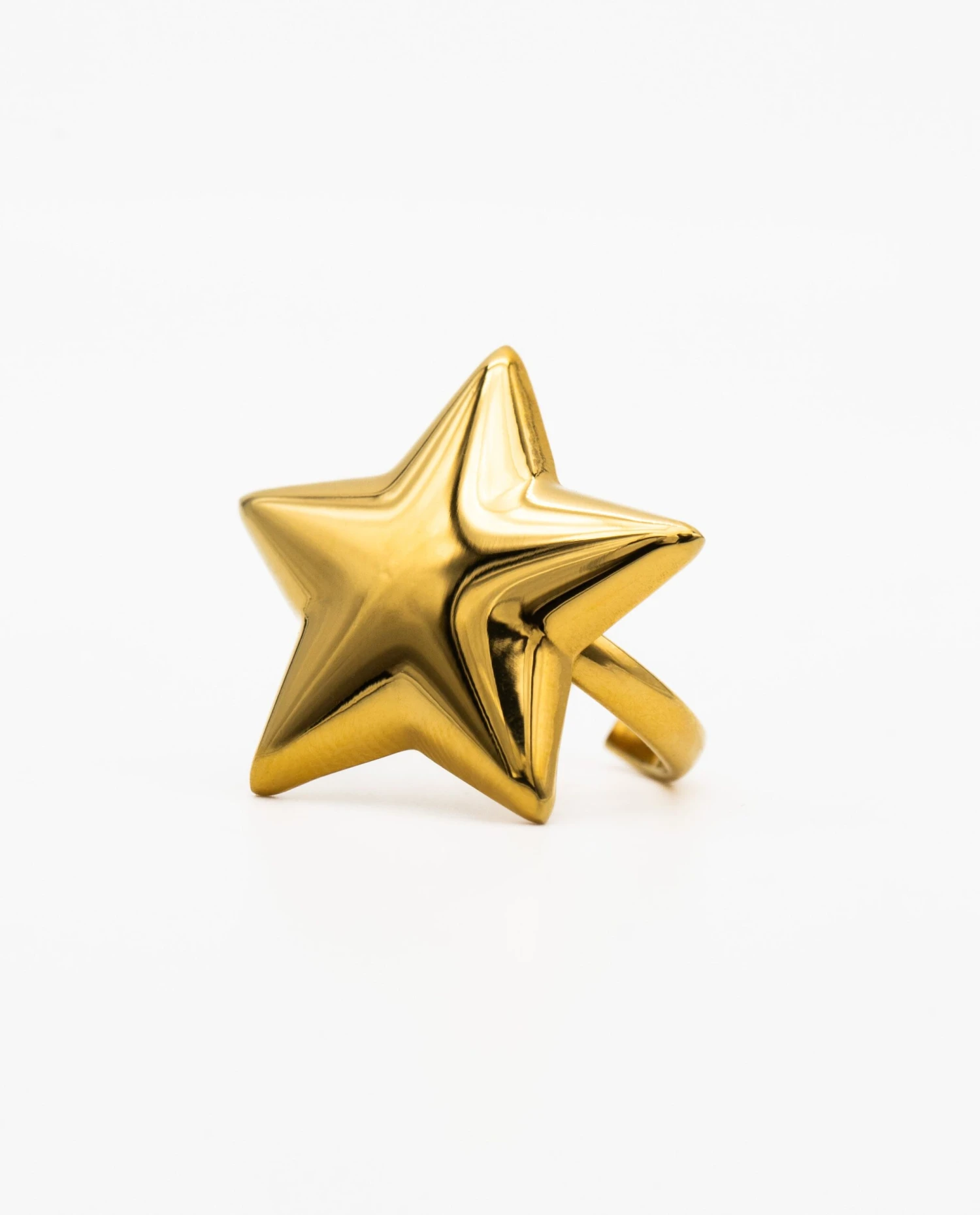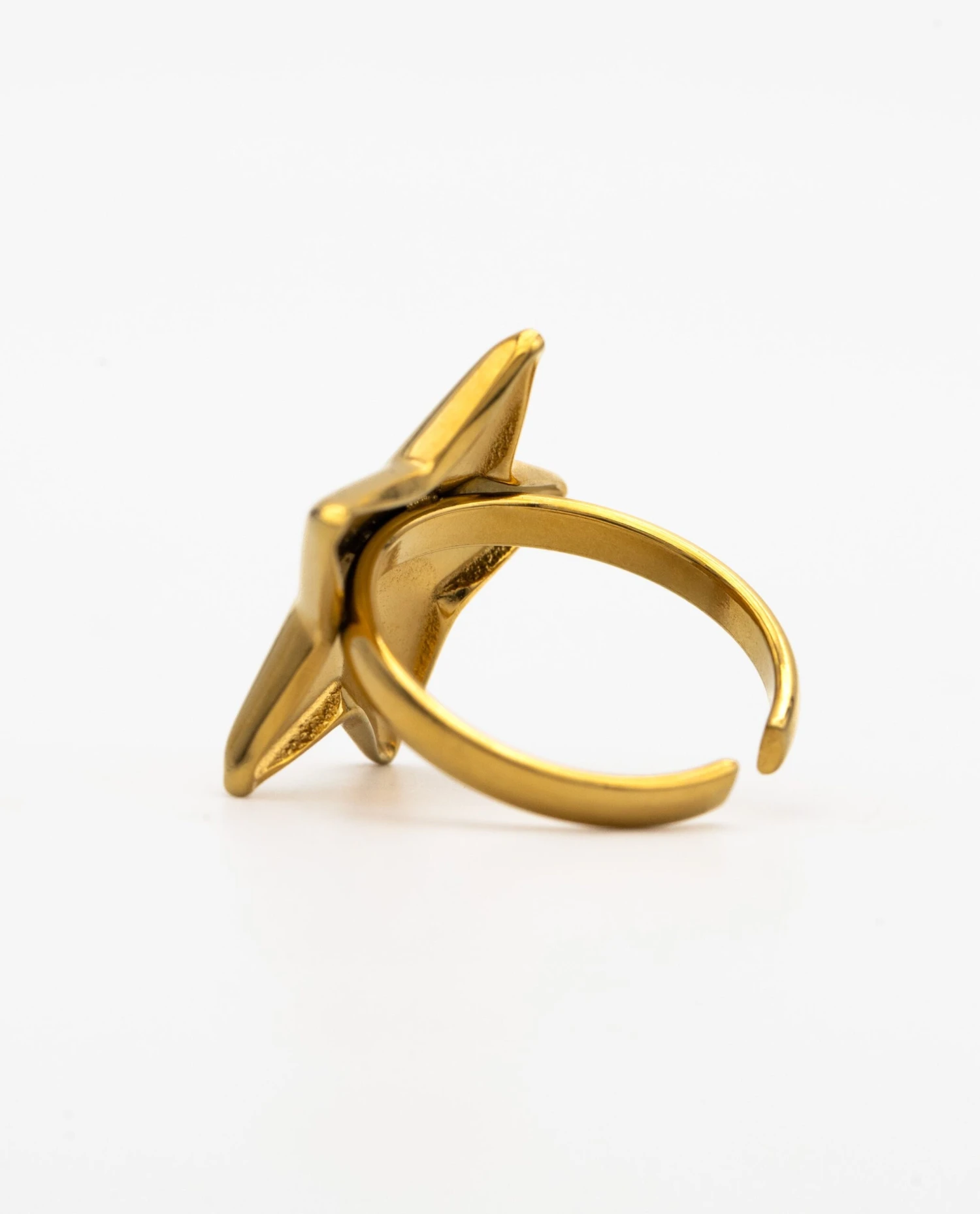 Anillo de estrella dorado.[readmore]⭐Una de nuestras joyas favoritas de esta colección.⭐ Este anillo en forma de estrella está hecho de Acero Inoxidable y bañado en Oro de 18kt para que, además de resistente, tenga un brillo especial. La forma es ligeramente abombada para que resalte el volumen. ¿Lo mejor? Lo puedes ajustar a tu medida. ¡Nos parece un detalle muy especial para regalar(te)!
