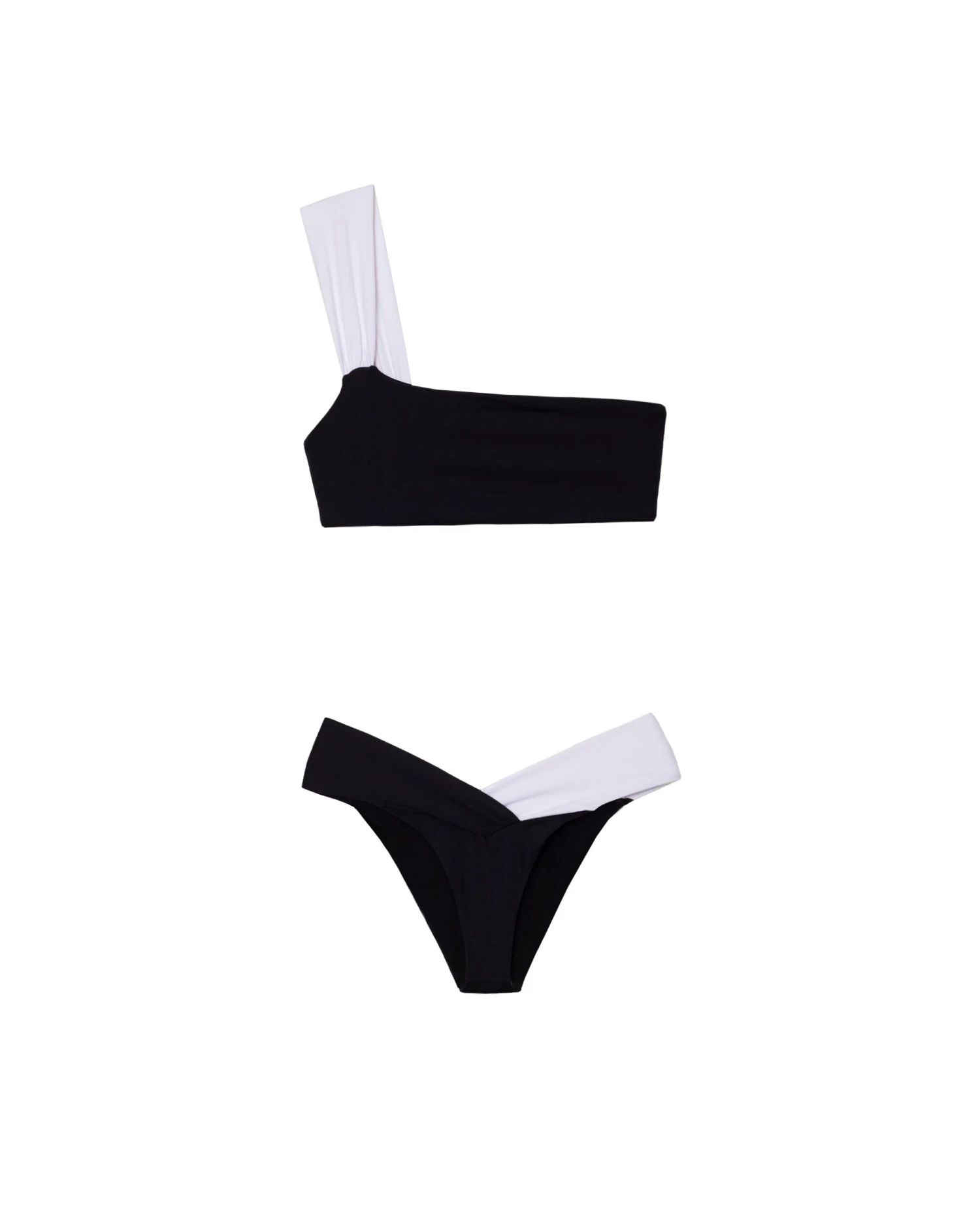 Bikini negro y blanco con tirantes y braguita fruncida.[readmore]Diseñamos el Bikini Mahón inspirándonos en esos días de playa que no quieres que terminen nunca, combinando el negro y blanco para que se convierta en un básico que no pueda faltar en tu armario. El top asimétrico tiene el tirante fruncido en blanco, muy favorecedor. La braguita es un poco brasileña con el detalle de dos piezas drapeadas en la cadera para potenciar la silueta.