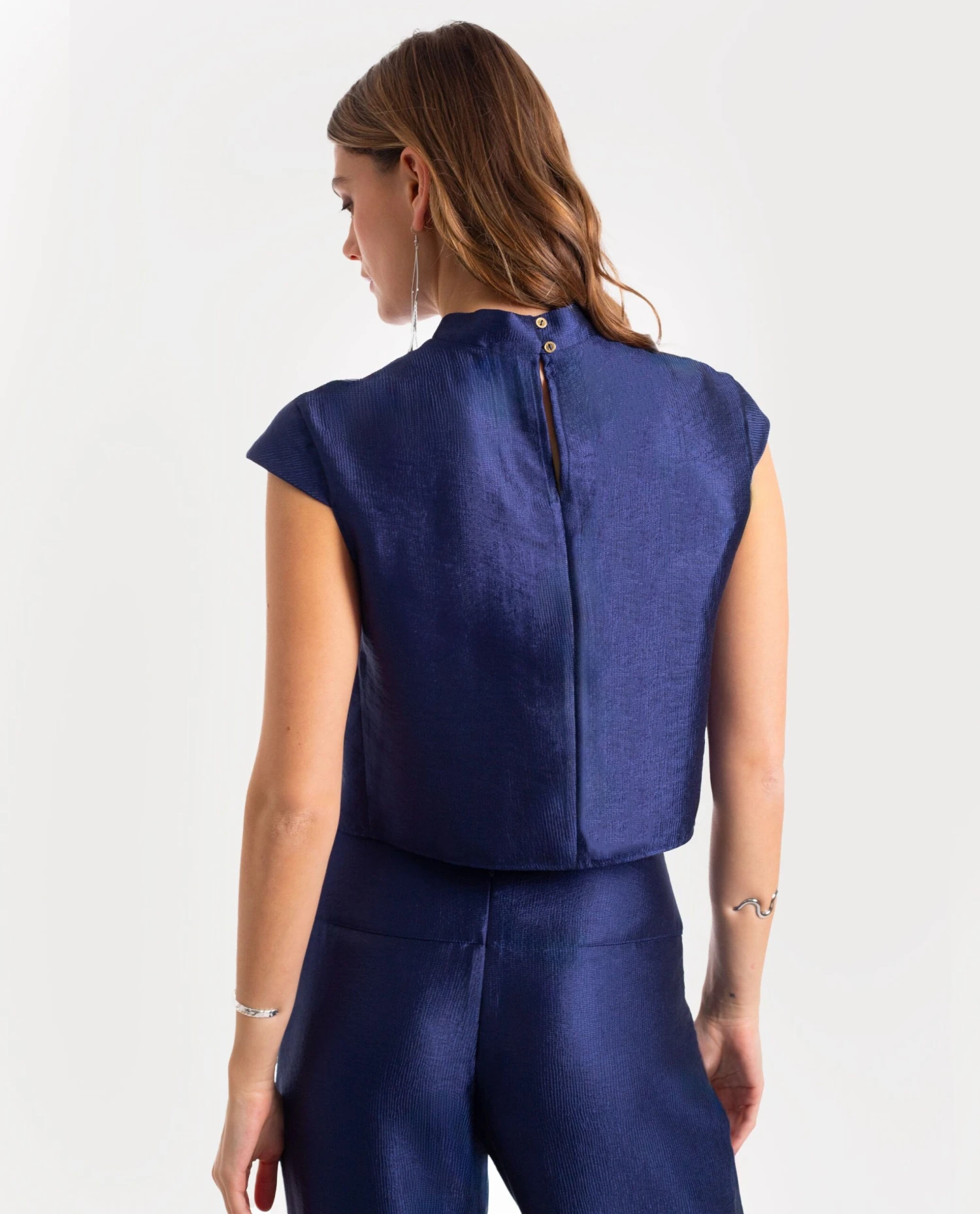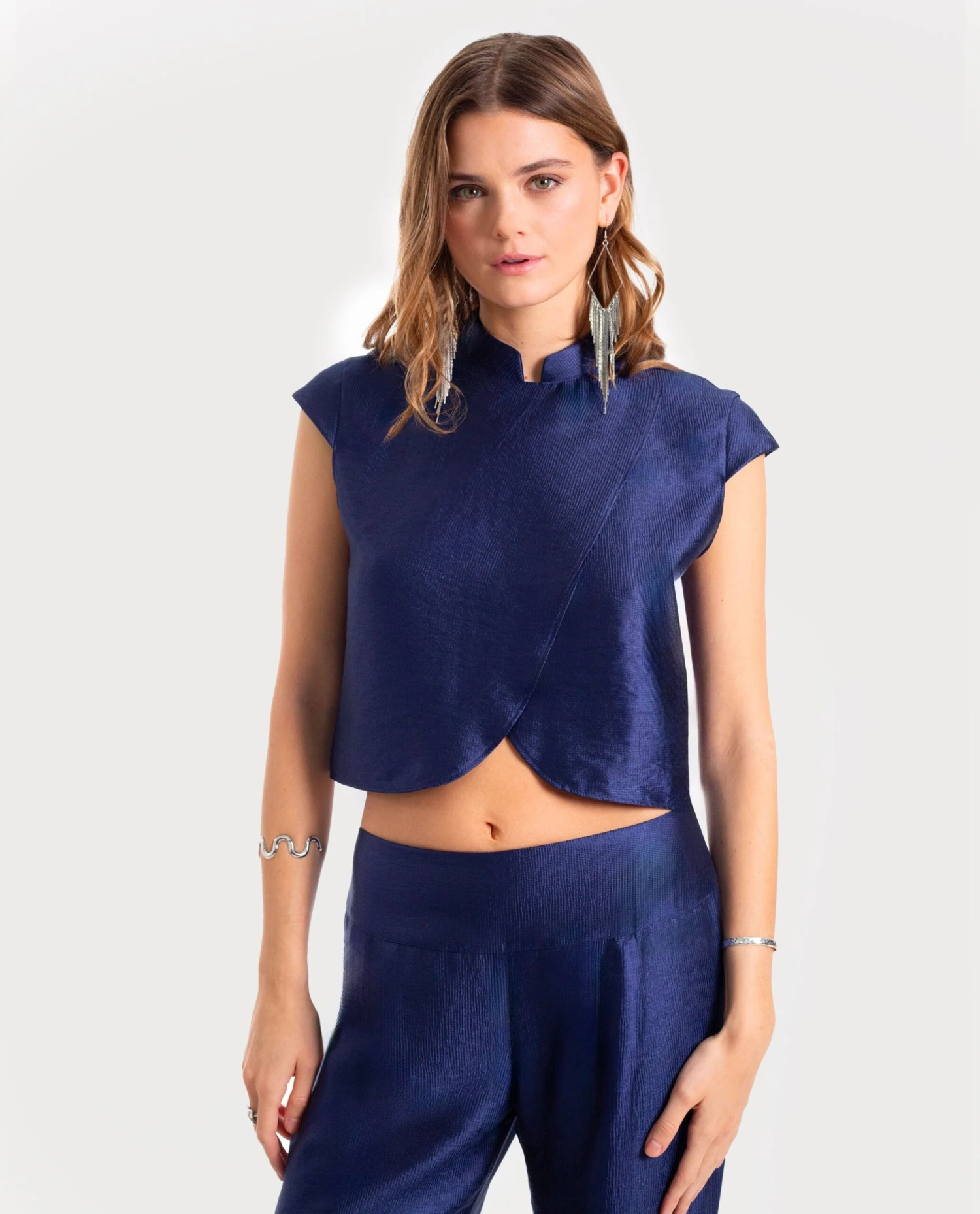 Blusa estilo qipao con manga corta.[readmore]Este conjunto es la elección perfecta para destacar en todos tus planes especiales. Después de mucho trabajo, hemos diseñado la combinación perfecta de blusa y pantalón elegante. La blusa, con cuello mao y cierre de dos botones en la espalda, tiene un diseño cruzado en la parte delantera que estiliza la silueta. Está confeccionada en un tejido satinado con textura que le da un toque sofisticado. Es el total look con el que arrasarás en cualquier evento de la temporada!