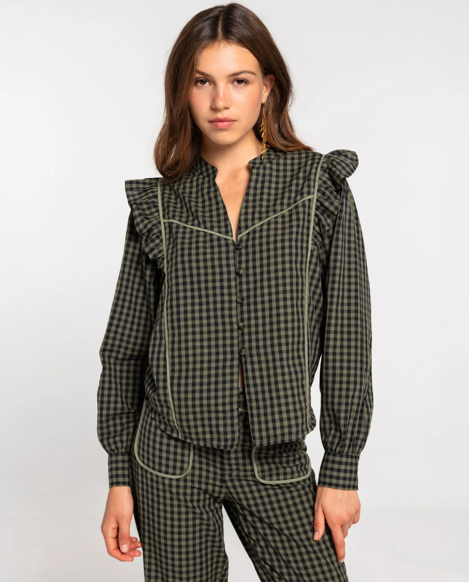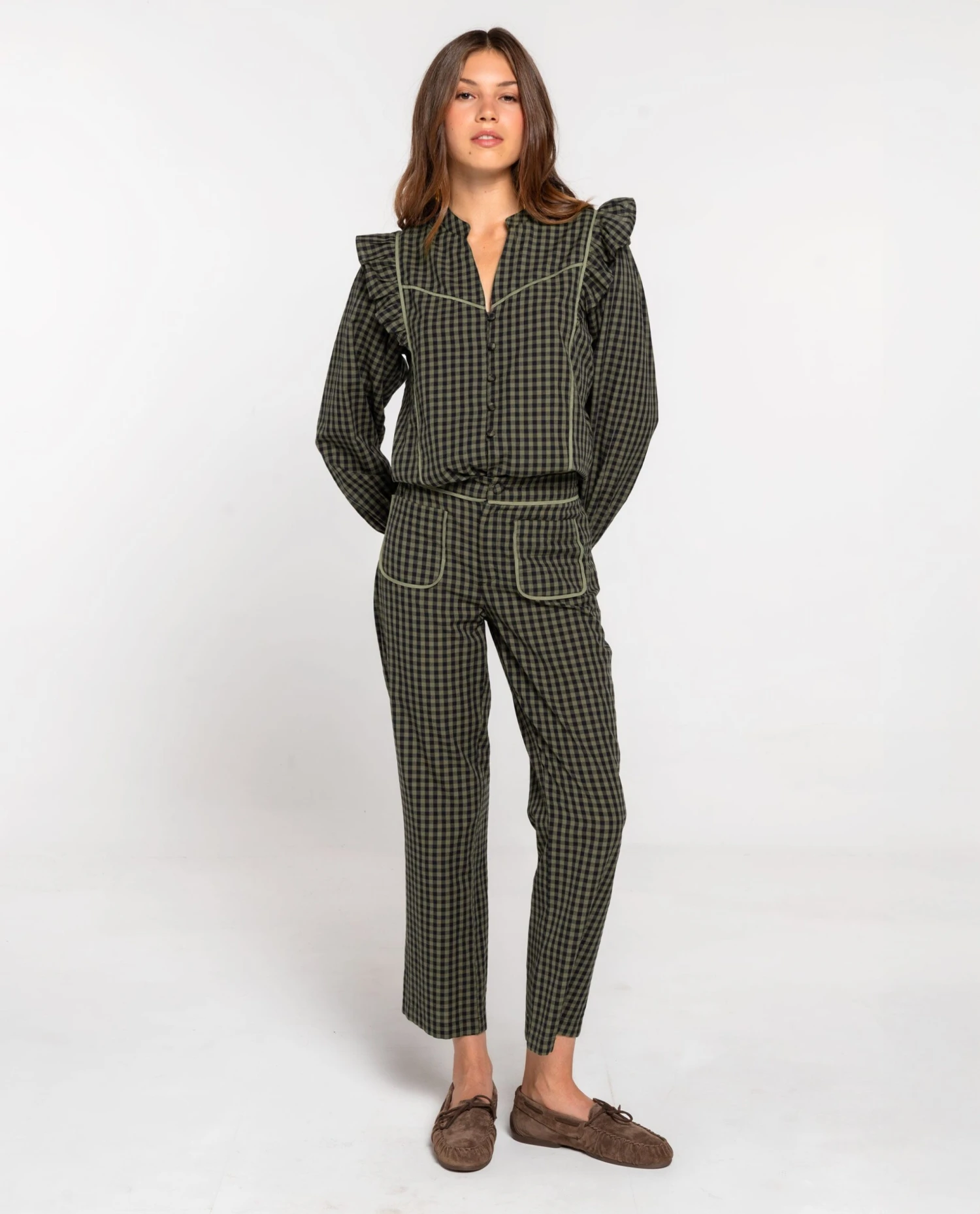 Blusa con bieses y estampado de cuadros vichy verde[readmore]Blusa de cuadros vichy en verde militar, con bieses en liso. Cierre delantero con botones forrados. Manga larga con puño abotonado y volantes en los hombros. Forma parte del total look con pantalón a conjunto.