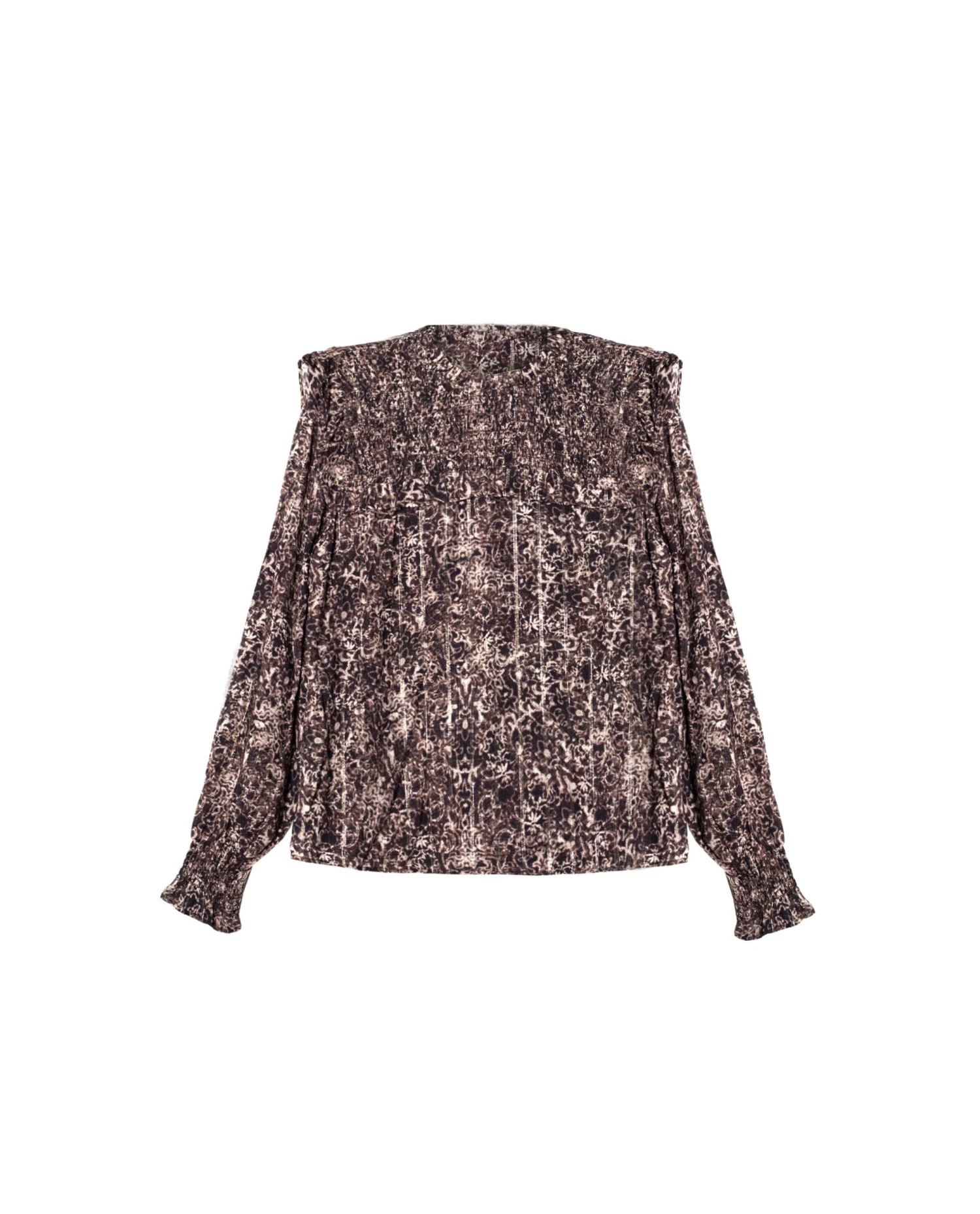 Blusa marrón estampada con volantes y nido de abeja.[readmore]Blusa estampada con nido de abeja en el delantero y volantes alrededor del canesú. Manga larga con puños rematados en volante y abertura trasera en forma de gota con botón. Combínala con la falda a conjunto para hacer un total look o con vaqueros.