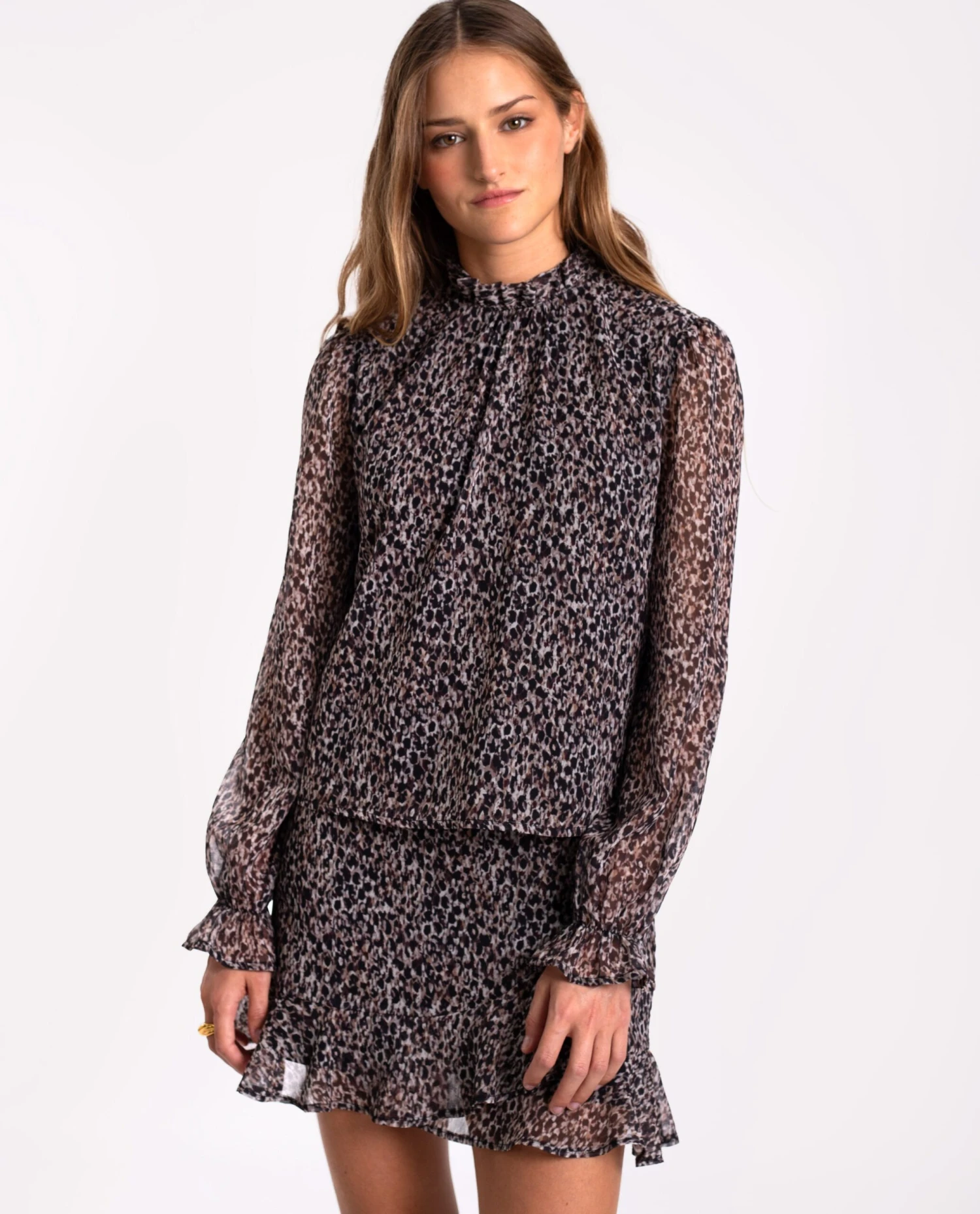 Blusa con volante y estampado jaspeado animal print.[readmore]Nos encantan los conjuntos de dos piezas que te pondrías para todo y que puedes llevar tanto junto como por separado. Está confeccionado en una gasa con un estampado jaspeado en tonos beige y negros. La blusa tiene el detalle del cuello alto y mangas con volantes, se anuda al cuello con una lazada y tiene las mangas ligeramente abullonadas que aportan un toque romántico al look ¡Combínala con la Falda Many Reasons, ponte tus botas favoritas y lista!
