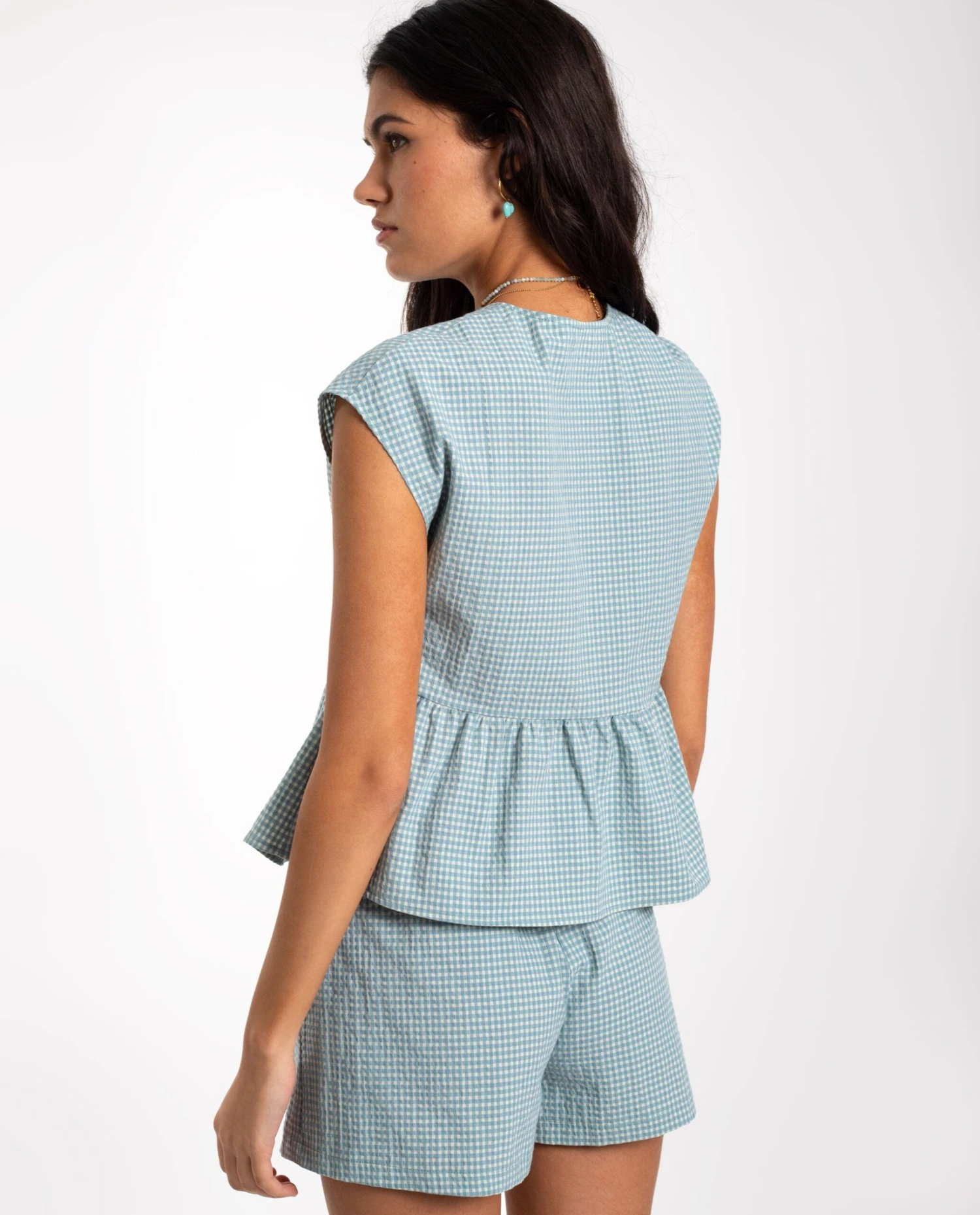 Blusa con lazos y estampado vichy.[readmore]Un diseño especial y confeccionado para que se quede mucho tiempo en tu armario. Un diseño ligero, fresco y súper especial. Los lazos en la parte delantera le dan un aire romántico y desenfadado, mientras que el volante en el bajo aporta movimiento y un extra de estilo. Su escote en pico y mangas cortas hacen que sea una opción ideal para cualquier plan. Llévala con sus shorts a conjunto para un total look.