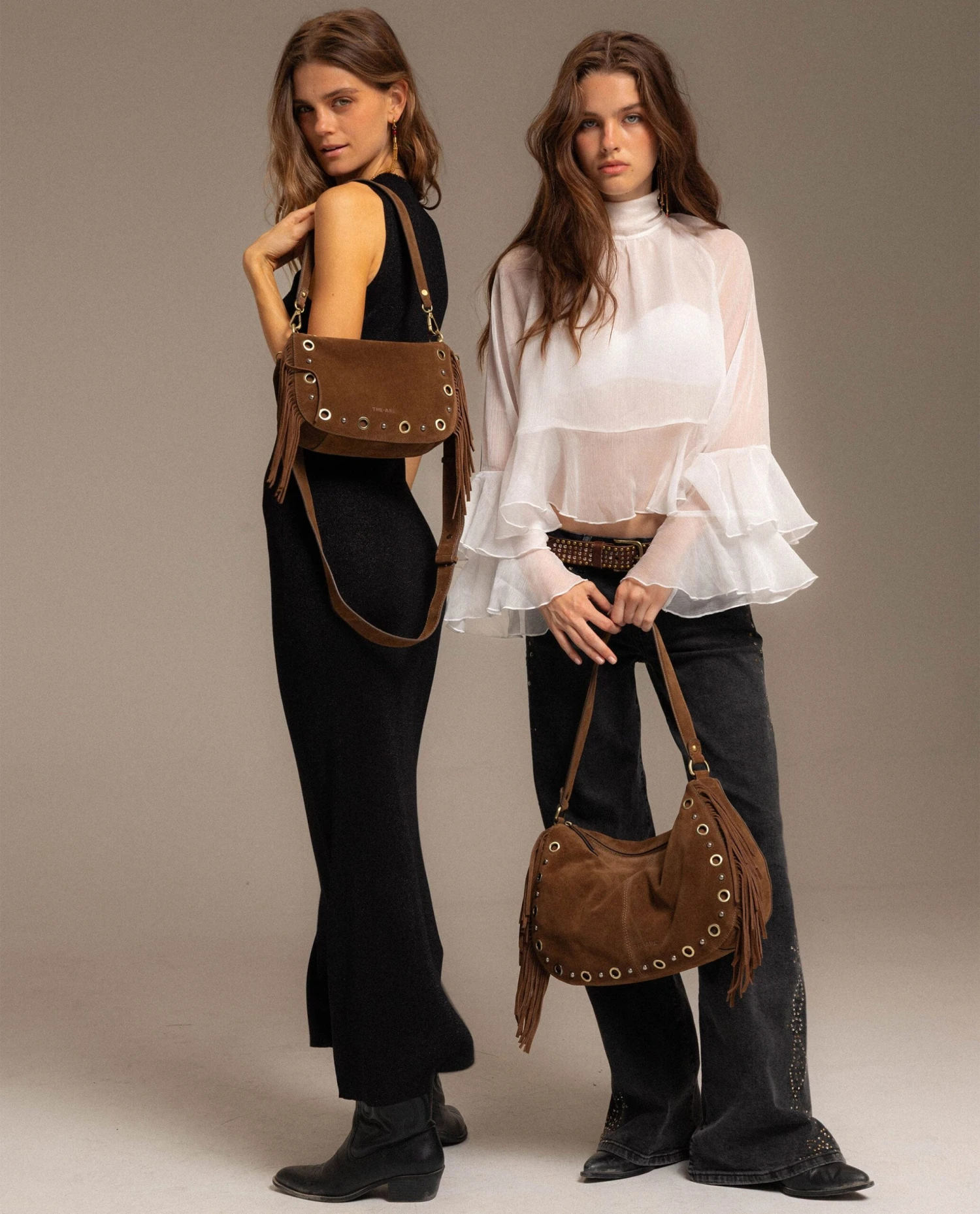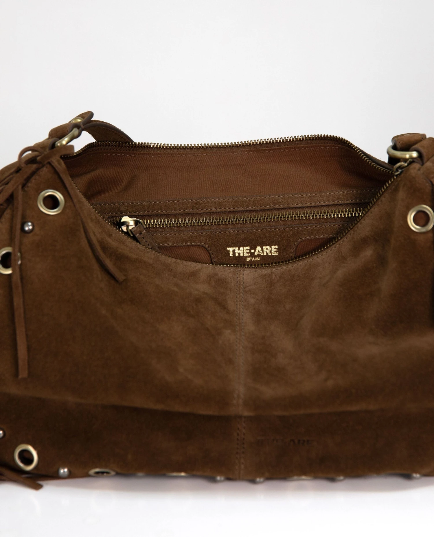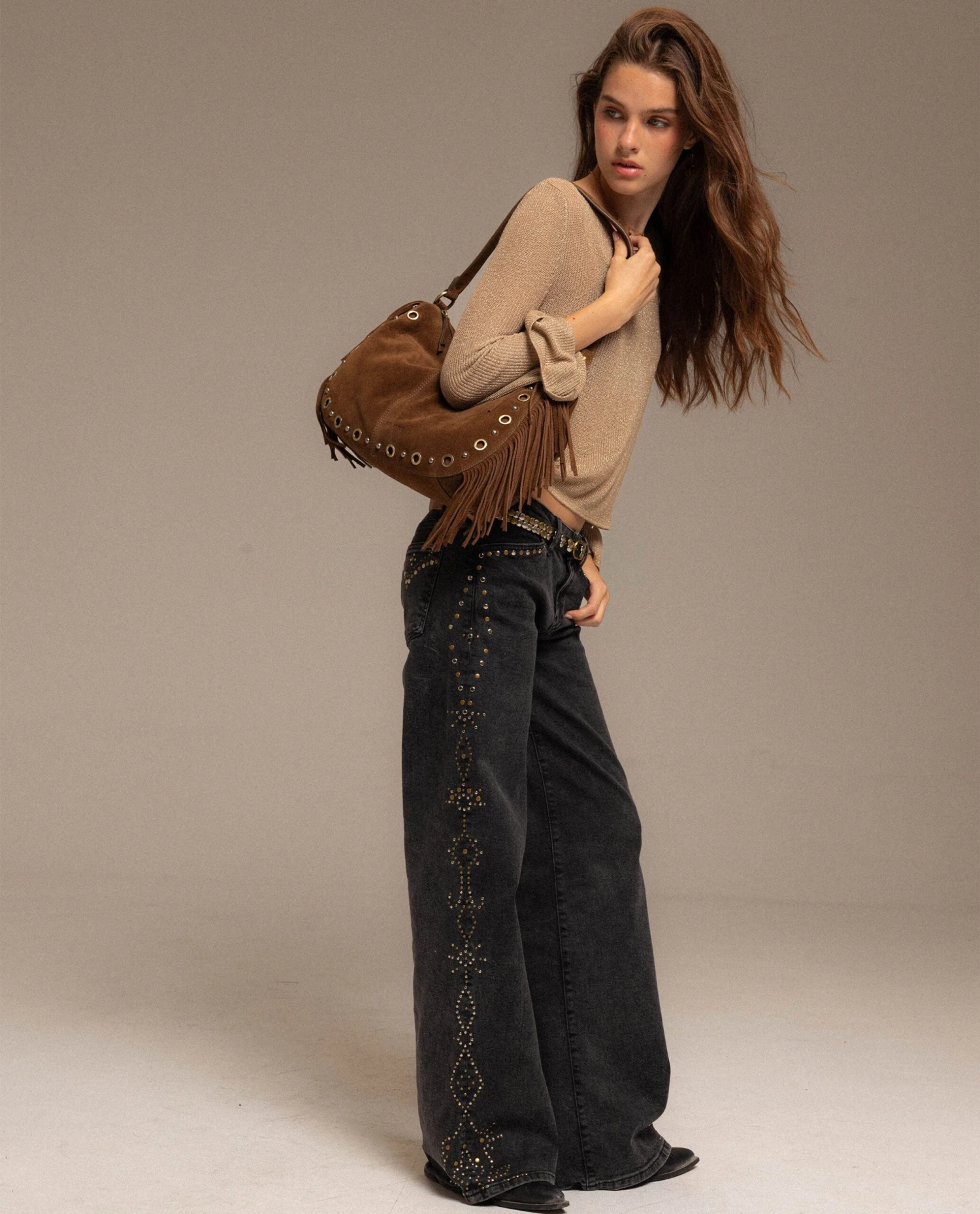 - Bolso 100% piel de ante marrón con flecos y tachuelas doradas.