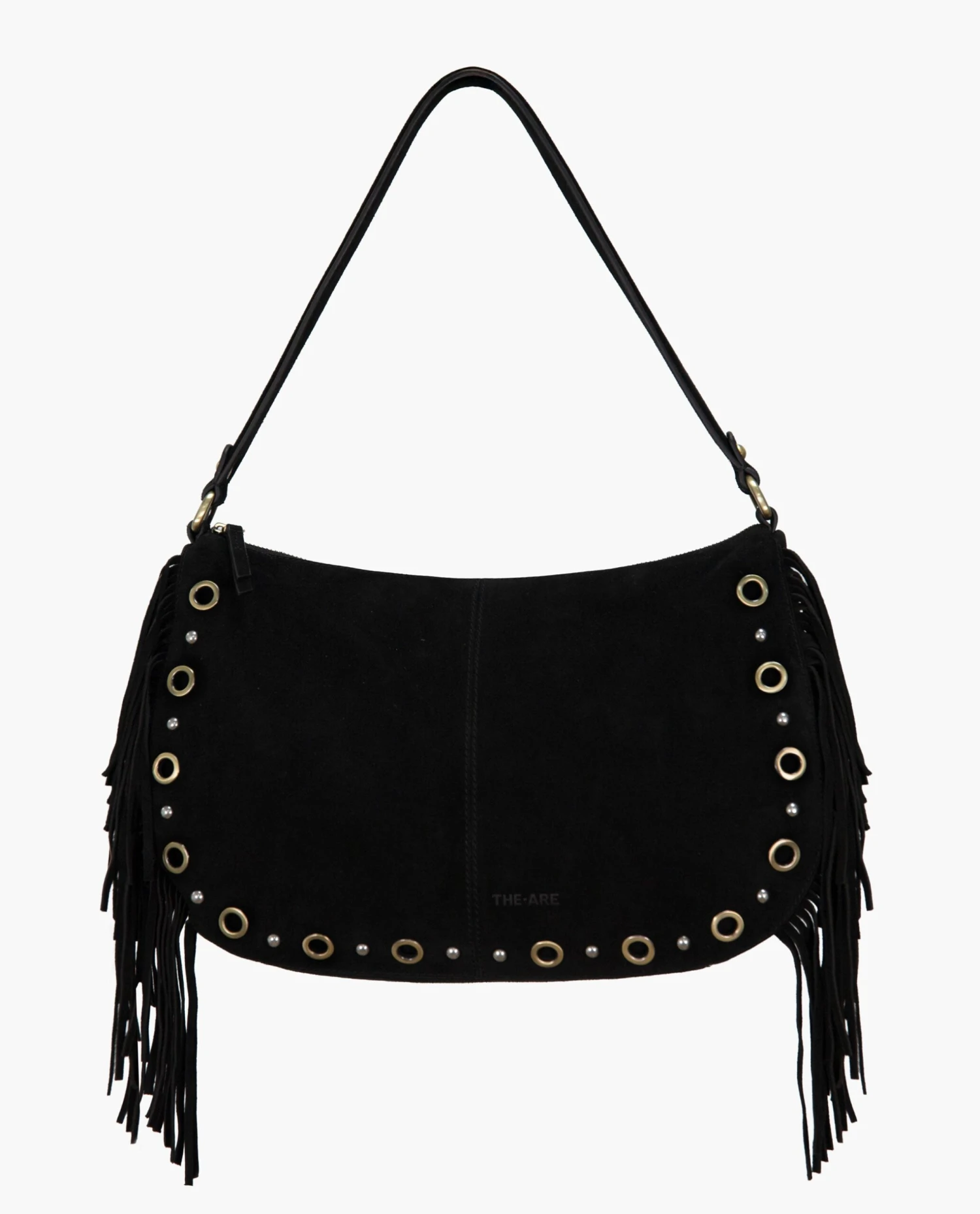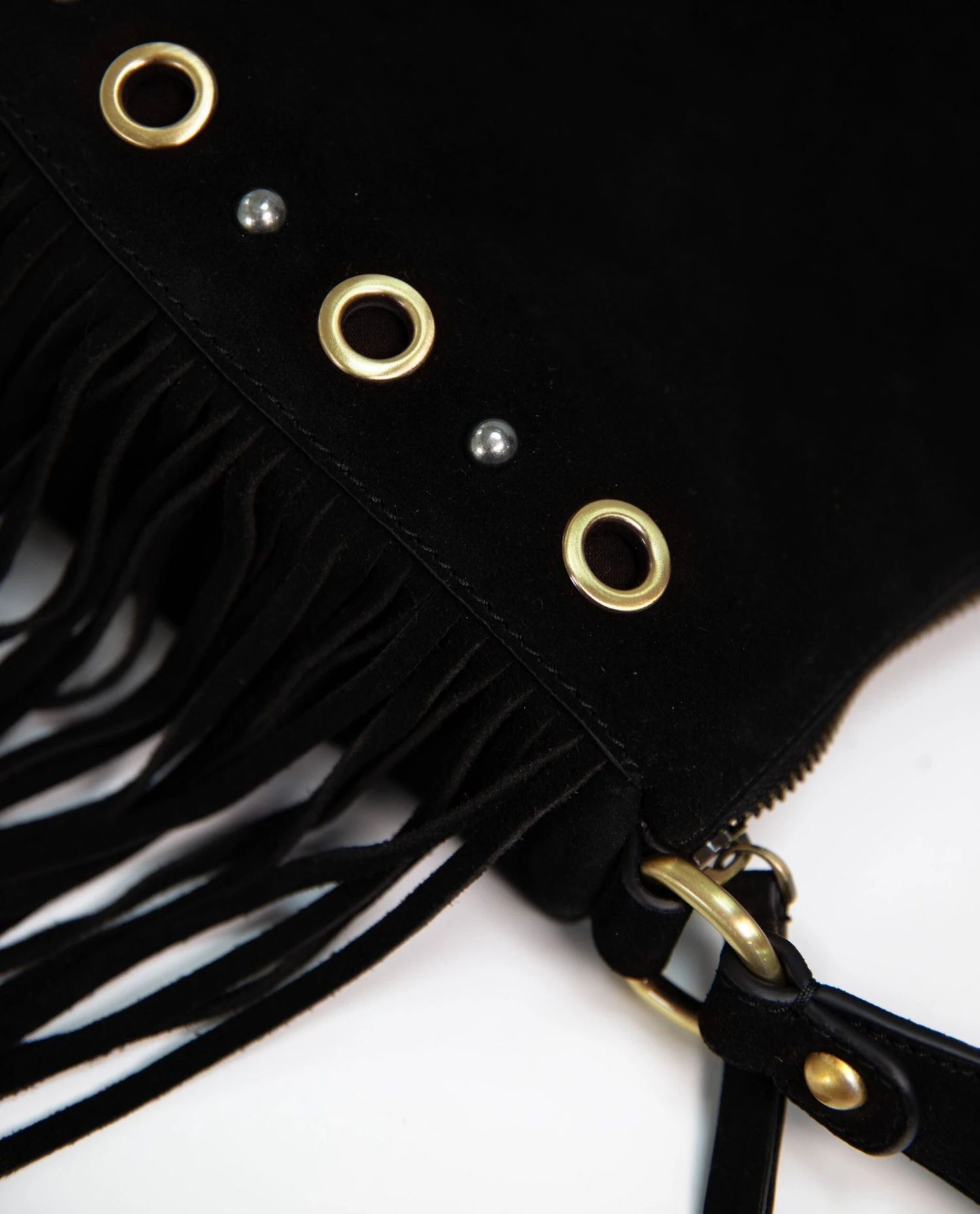 - Bolso 100% piel de ante negra con flecos y tachuelas doradas.