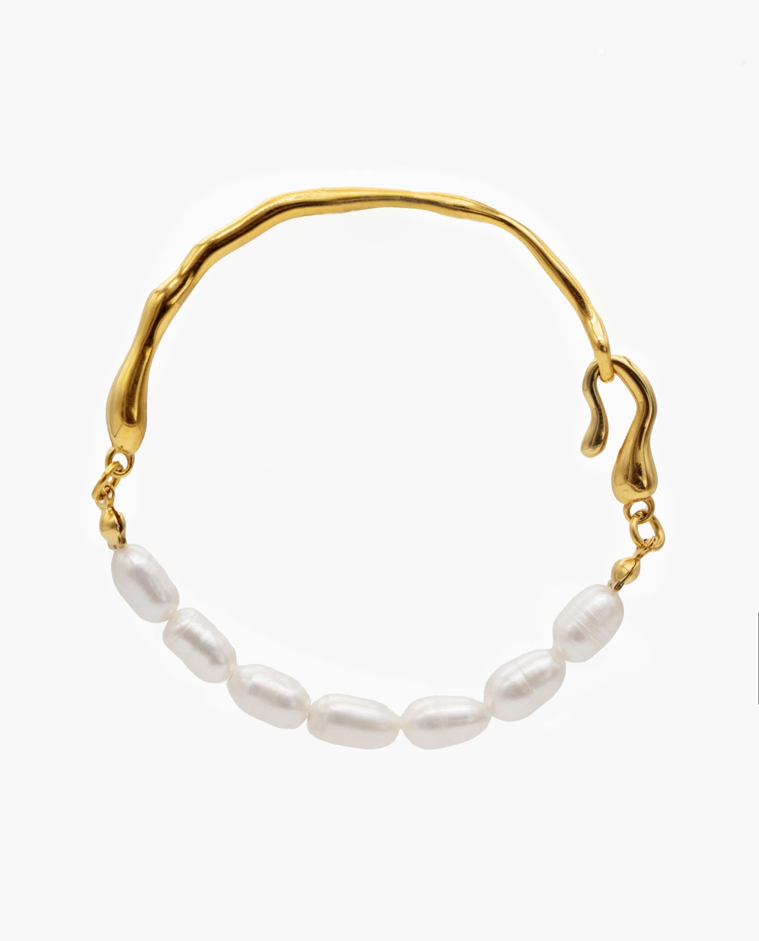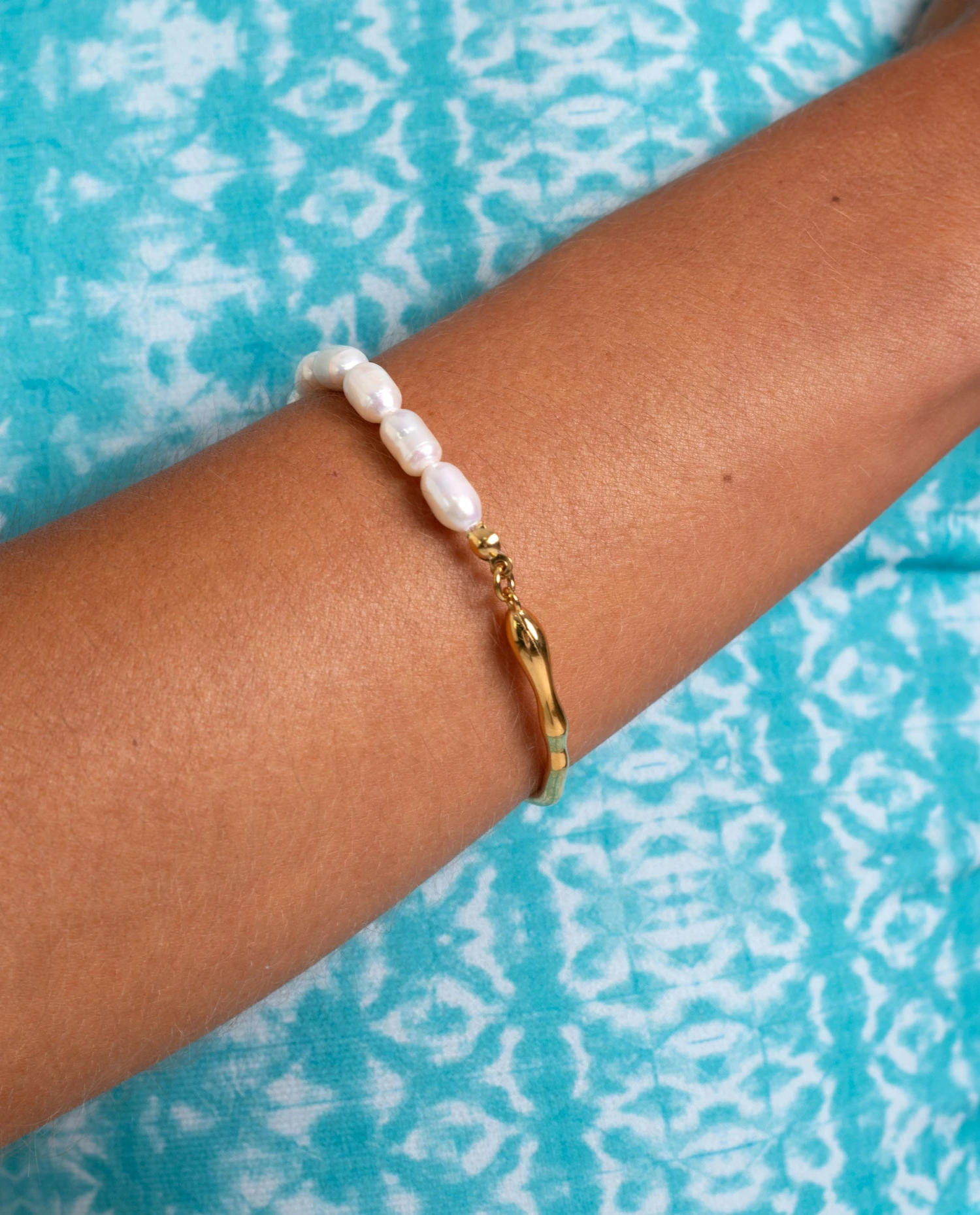 Pulsera mitad hilo dorado y mitad perlas.[readmore]Una pulsera de perlas con una cadena irregular de acero inoxidable bañada en Oro de 18kt. Una pulsera o brazalete elegante a la vez que versátil gracias a su diseño multiposición. Se convertirá en tu próximo básico para llevar a todas partes!