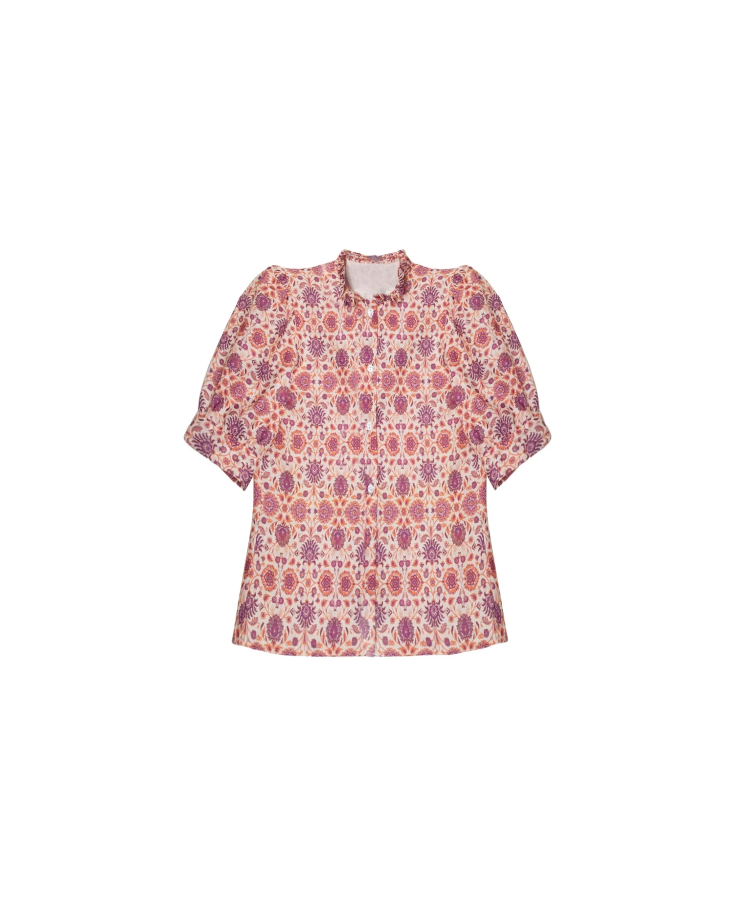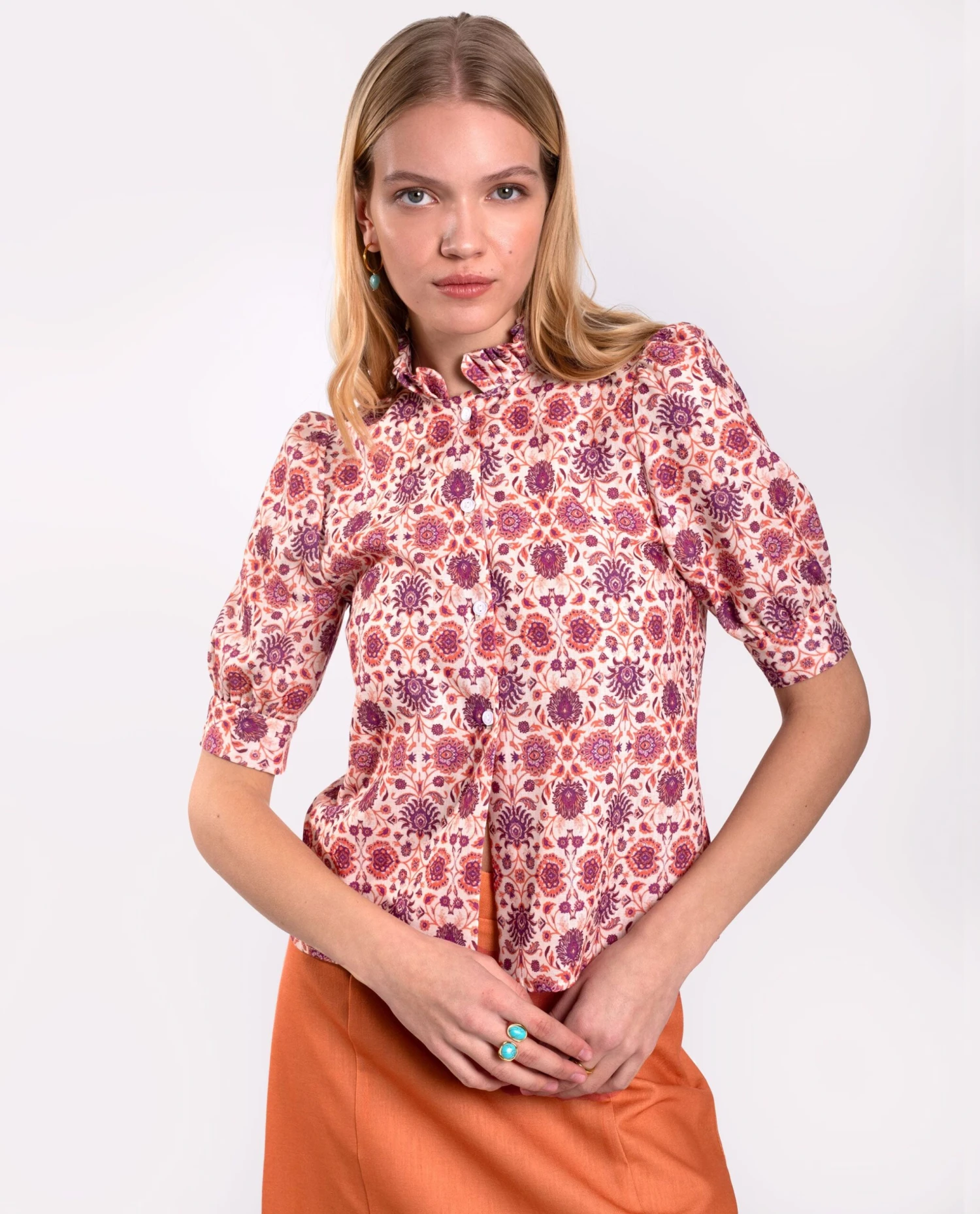 Camisa de manga 3/4 con estampado floral.[readmore]Un diseño especial gracias a su cuello alto con pliegues y el estampado original diseñado por nosotras en tonos rosas y naranjas. Las mangas ligeramente abullonadas terminan en puños con botones, y su silueta entallada favorece muchísimo. Una camisa perfecta para combinar con faldas o pantalones de tiro alto. Ideal para darle un toque diferente a cualquier look.