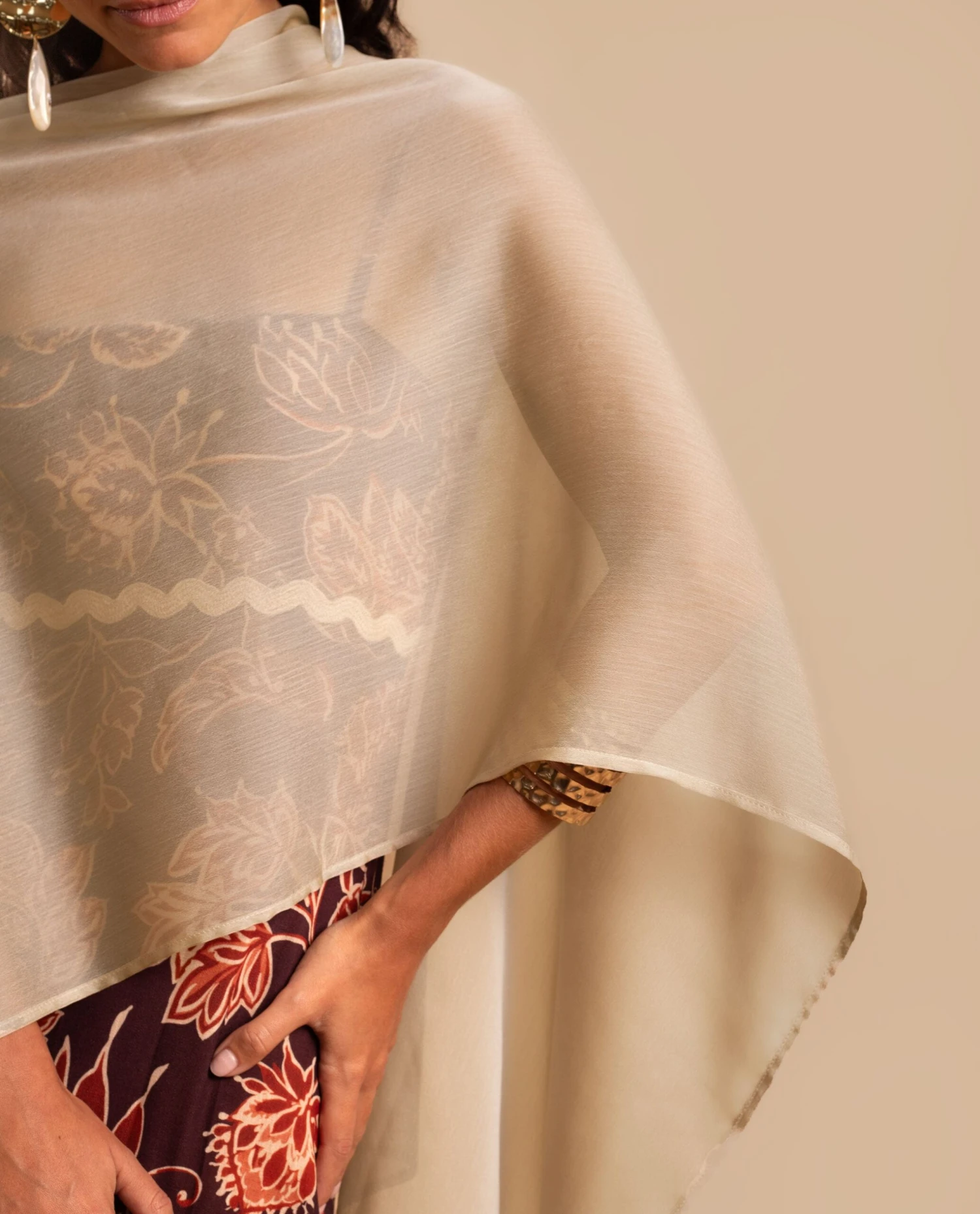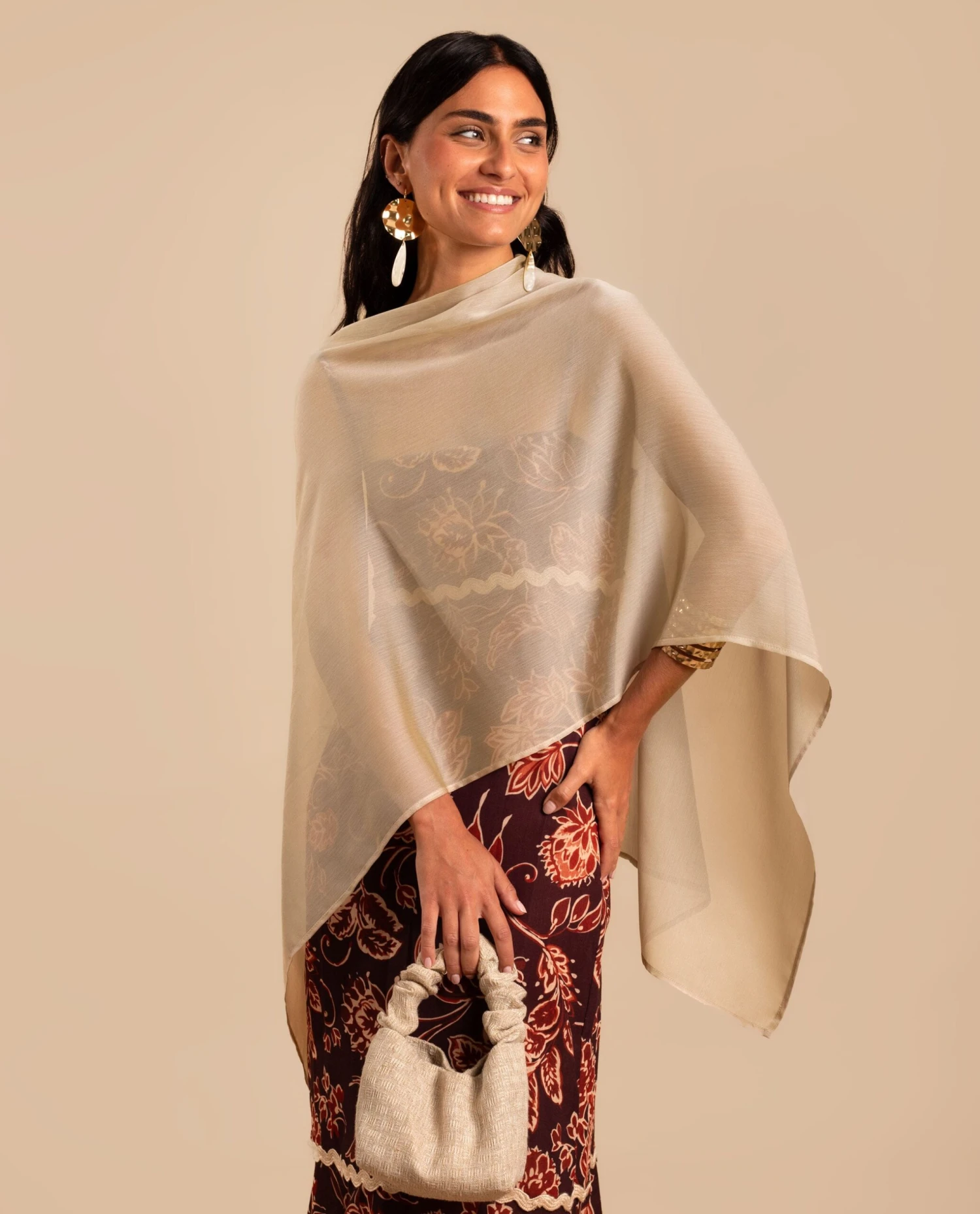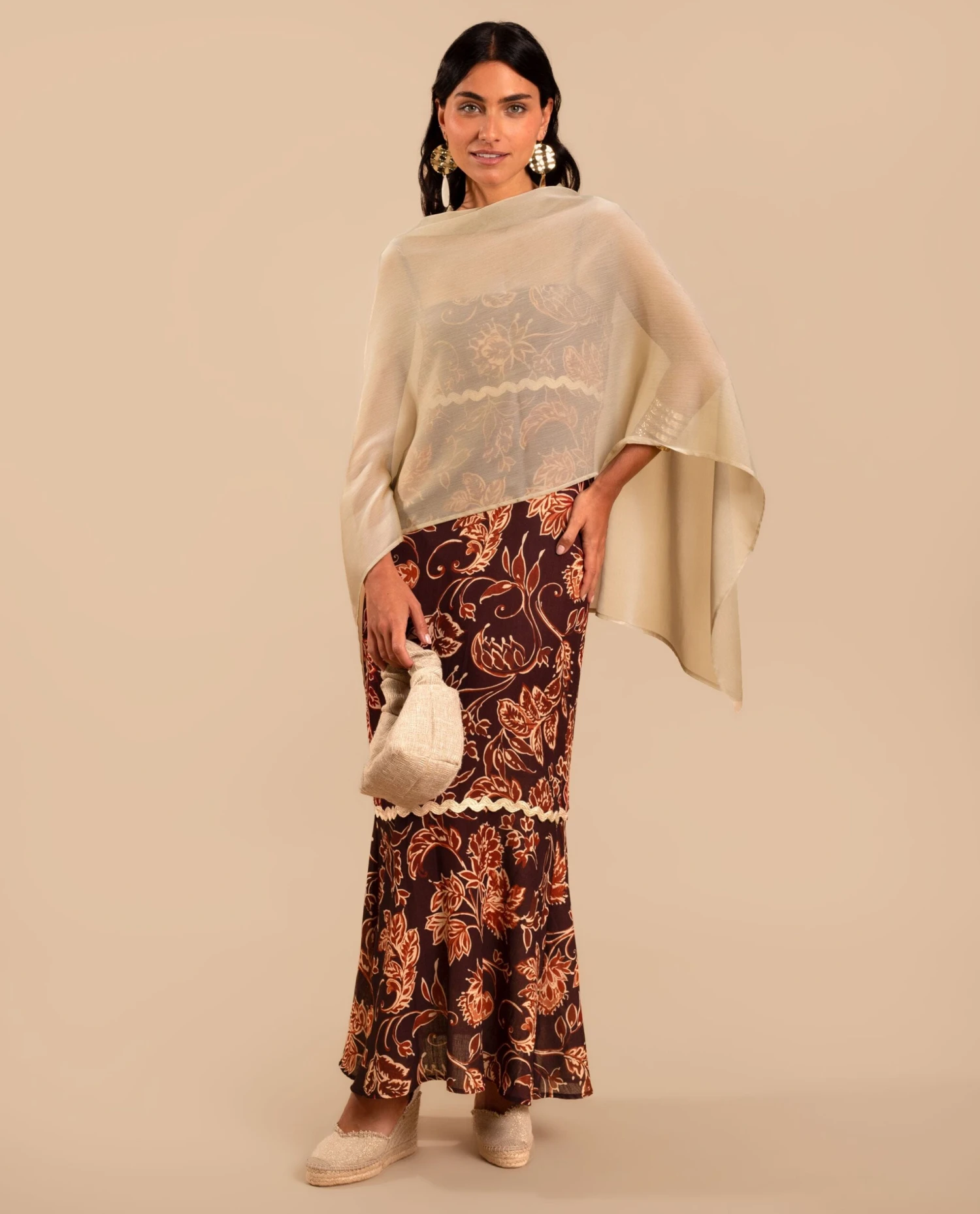 Echarpe de gasa para eventos.[readmore]Uno de los complementos más buscados para eventos por su versatilidad y funcionalidad. Esta capa de invitada unida está confeccionada en un tejido de gasa fluido, sedoso y agradable al tacto que elevará cualquier look a otro nivel. Elegimos el color champagne con un poco de brillo por lo elegante y favorecedor que sienta. Ideal para combinar con cualquier vestido, mono o conjunto de invitada.
