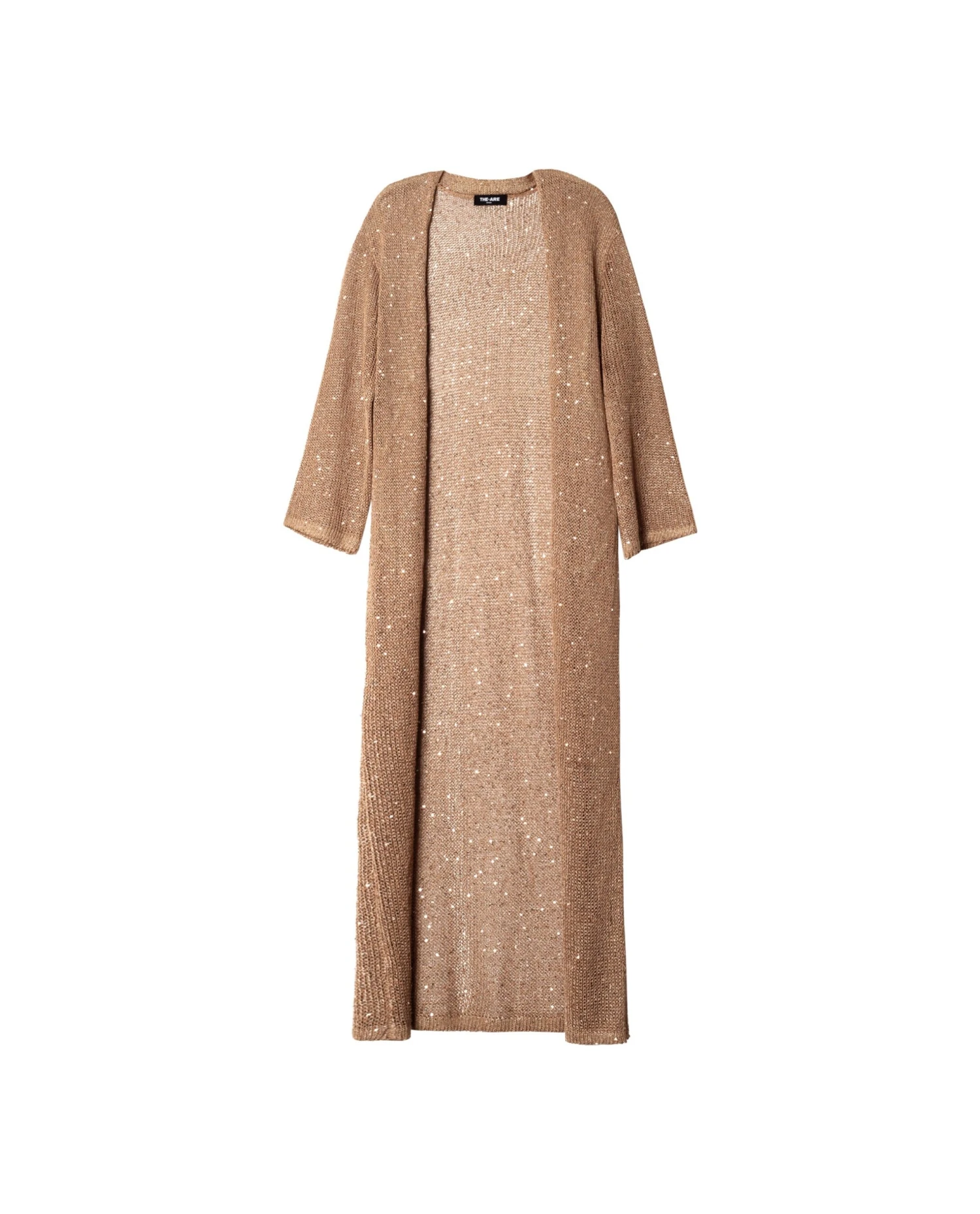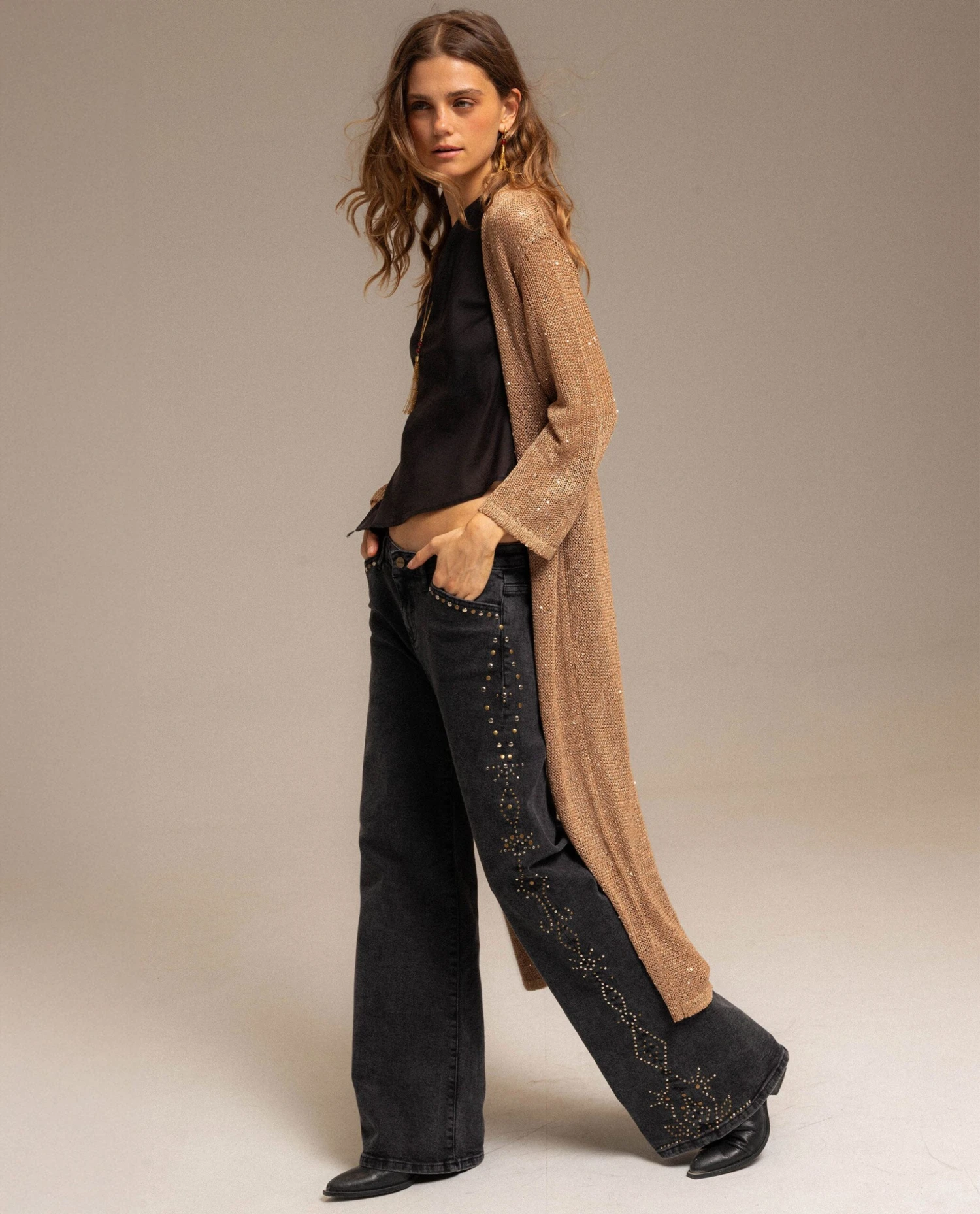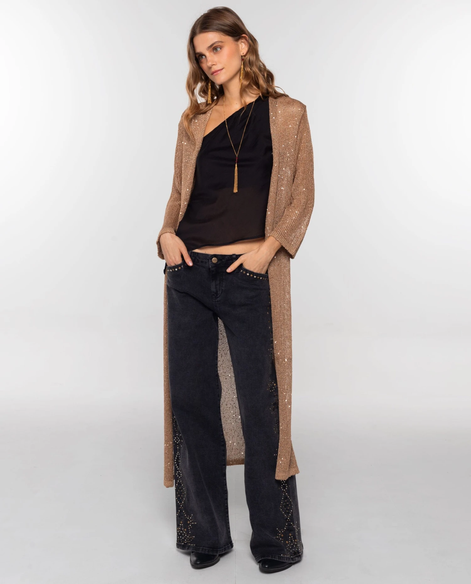 Cárdigan largo de punto con lentejuelas y manga larga.[readmore]El cárdigan largo es una de las tendencias que vienen pisando más fuerte esta nueva temporada, y si son como este, largo y con lentejuelas integradas en el tejido, no te lo querrás quitar!. Confeccionado para que sea una prenda que te abrigue pero también aporte ese toque de estilo que todo look necesita. Su tejido de punto incorpora pequeñas lentejuelas que aportan un brillo sutil y sofisticado, ideal para destacar con discreción. Una opción versátil para estilismos de noche, eventos o looks más casual pero súper trendy!.