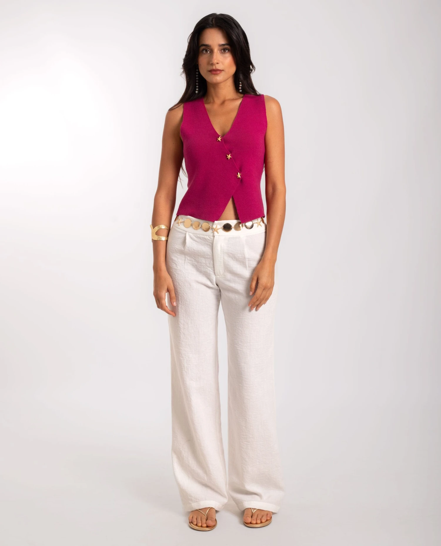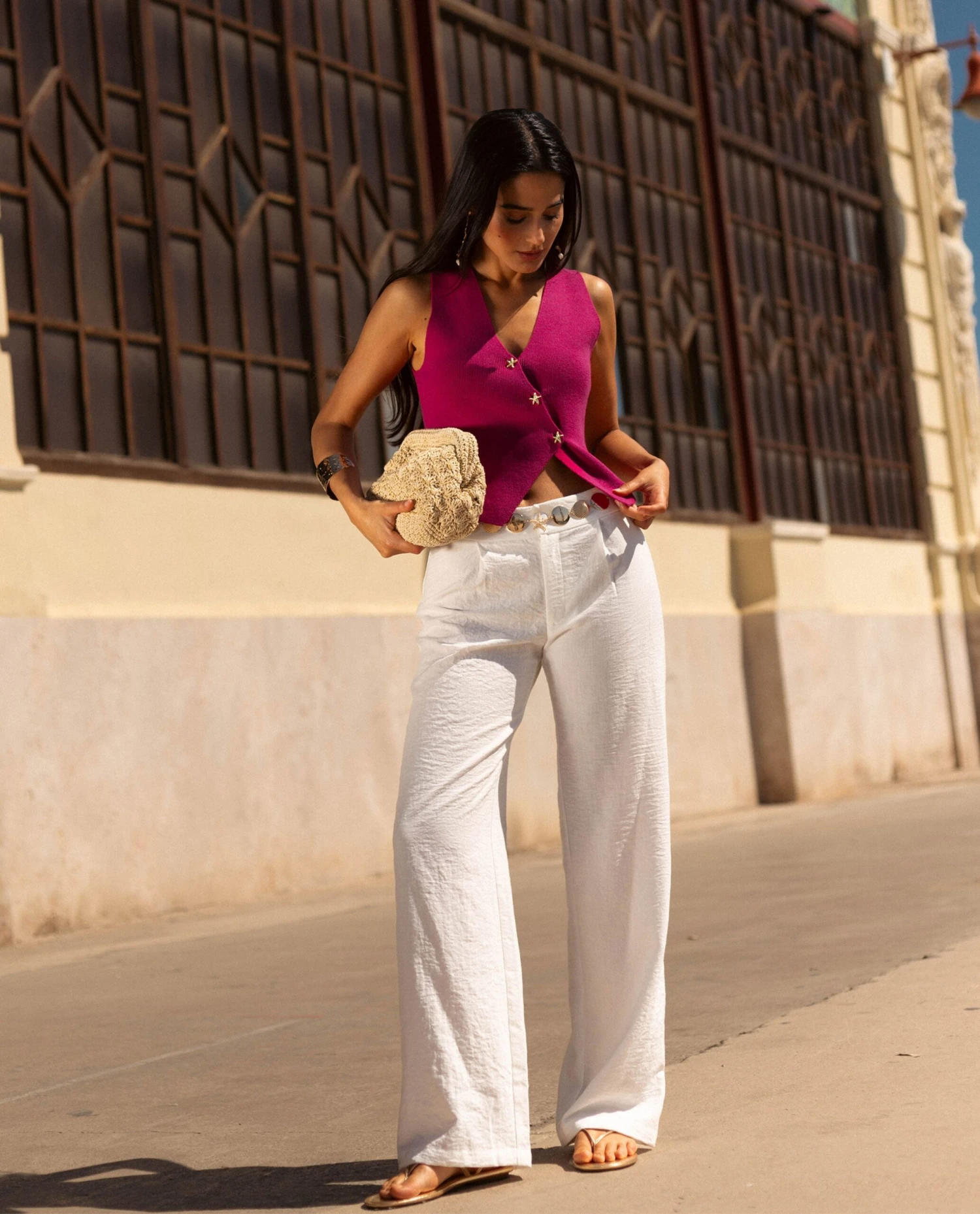 Chaleco con cierre cruzado y botones de estrella.[readmore]Este chaleco se convertirá en tu imprescindible por su versatilidad y sus detalles especiales que lo hacen único. Con un diseño de cierre cruzado y asimátrico en el delantero crea una silueta súper especial y favorecedora, mientras que el escote en pico le da un toque sofisticado. El estlo crop lo hace fácil de combinar y los botones en forma de estrella de mar marcan la diferencia. Llévalo con pantalón, falda o unos shorts para un look más casual.