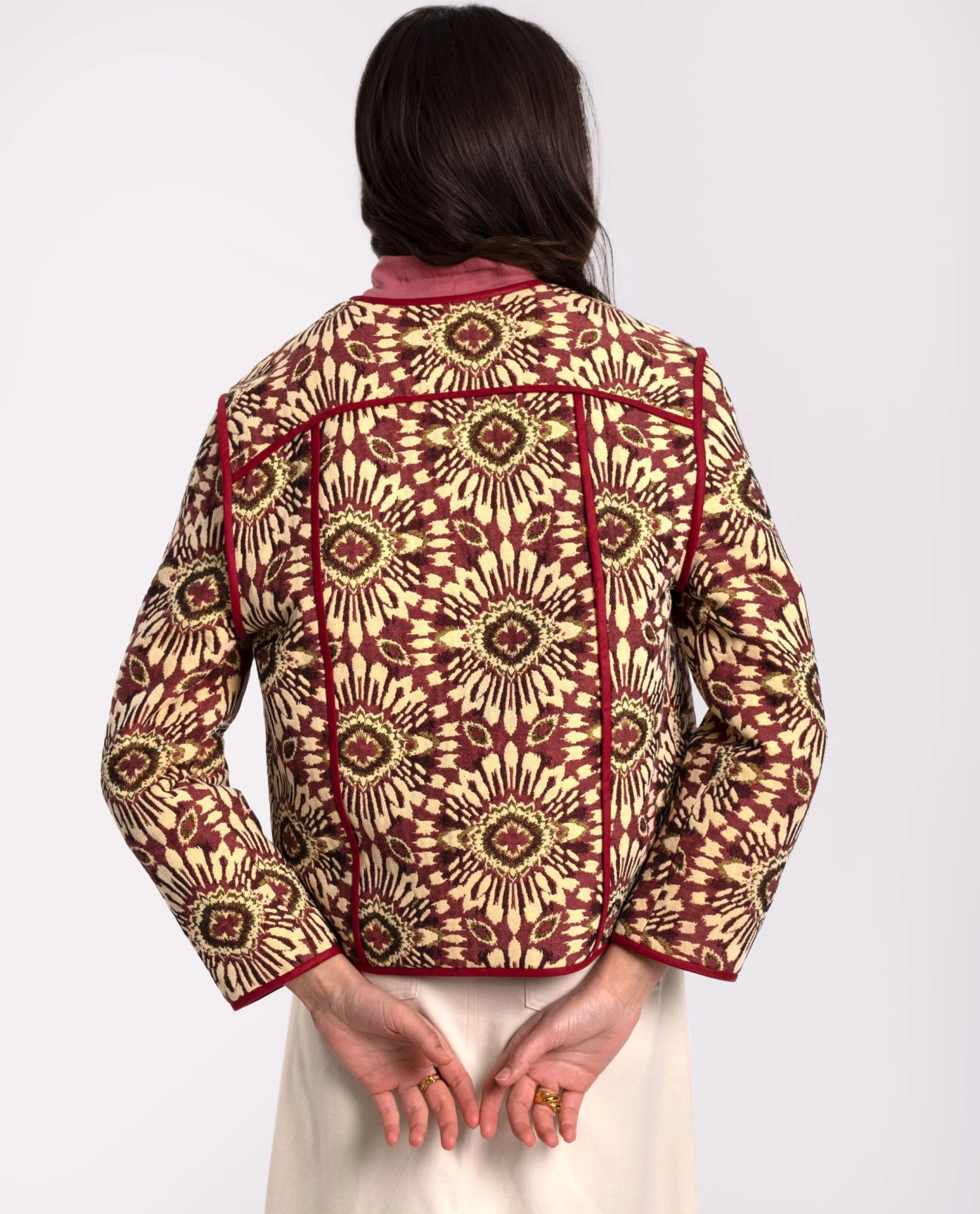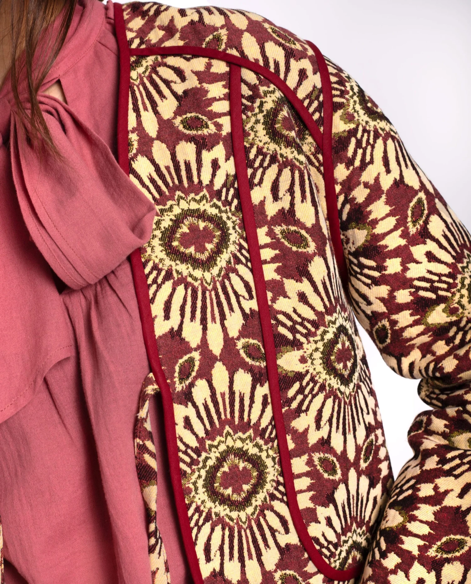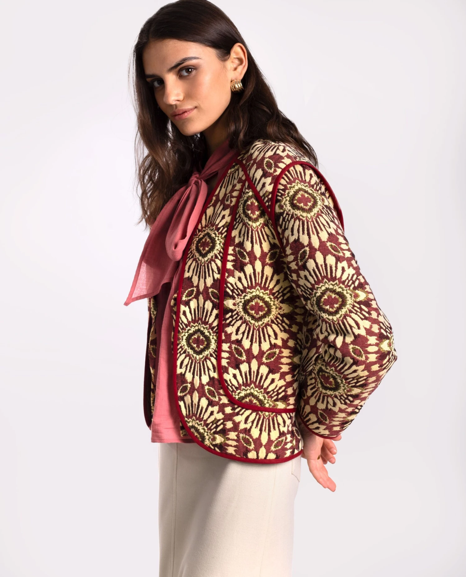 Chaqueta de jacquard con lazadas y detalle en contraste.[readmore] Un diseño con mucha personalidad que transforma cualquier look al instante. Su tejido jacquard de inspiración floral y el forro acolchado la convierten en la prenda perfecta para entretiempo. Las costuras en contraste burdeos añaden un toque especial, y las lazadas delanteras permiten ajustarla como más te guste. Ideal para llevar con básicos y darle un toque original a tus looks del día a día.