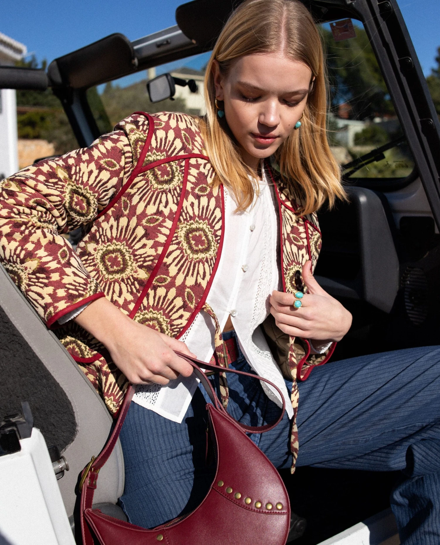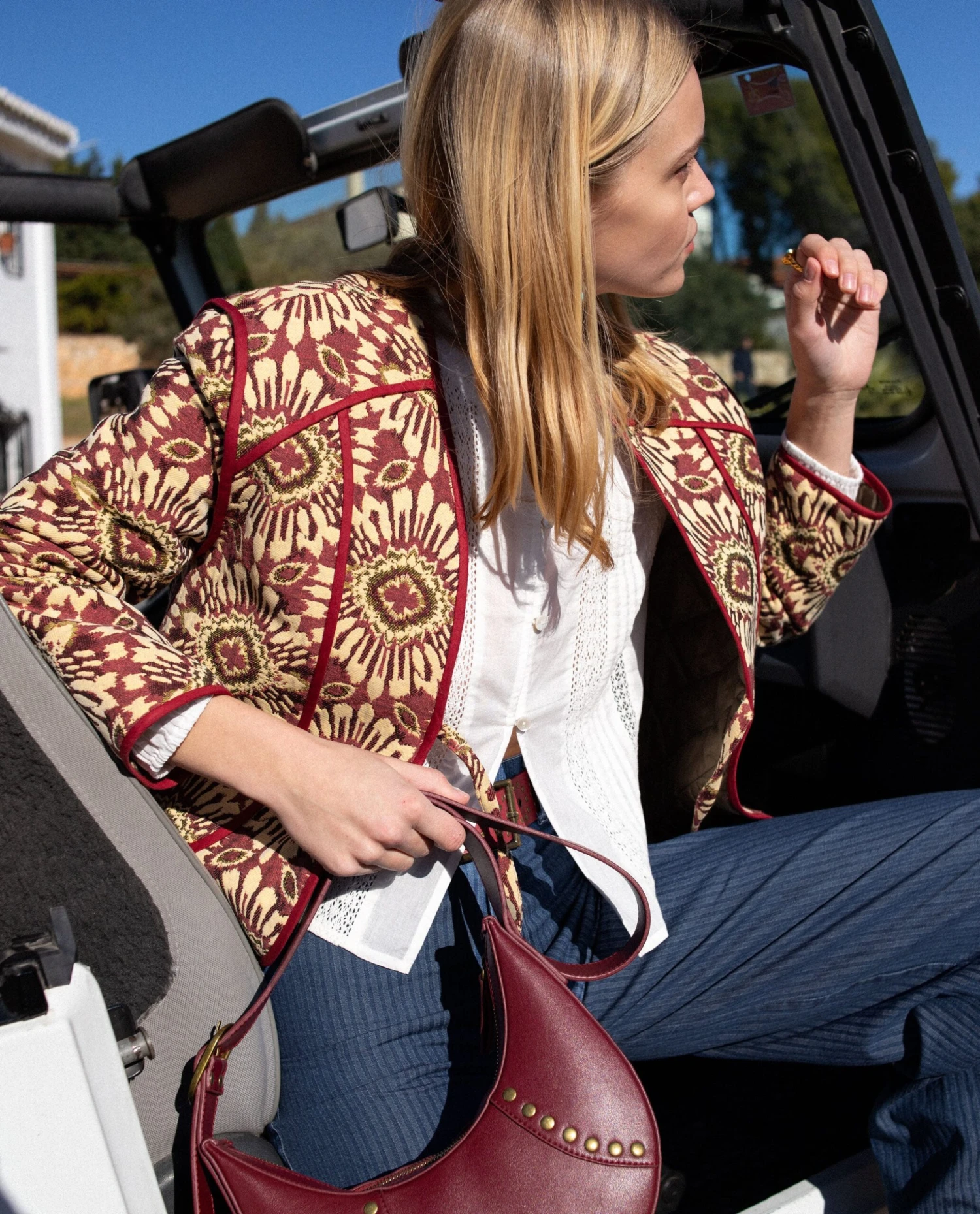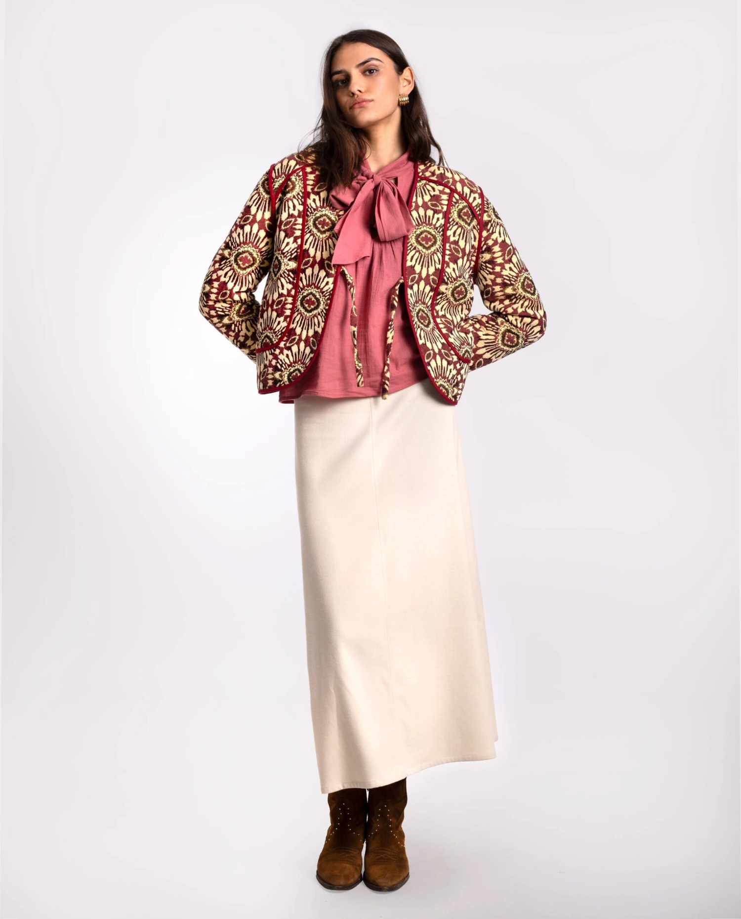 Chaqueta de jacquard con lazadas y detalle en contraste.[readmore] Un diseño con mucha personalidad que transforma cualquier look al instante. Su tejido jacquard de inspiración floral y el forro acolchado la convierten en la prenda perfecta para entretiempo. Las costuras en contraste burdeos añaden un toque especial, y las lazadas delanteras permiten ajustarla como más te guste. Ideal para llevar con básicos y darle un toque original a tus looks del día a día.