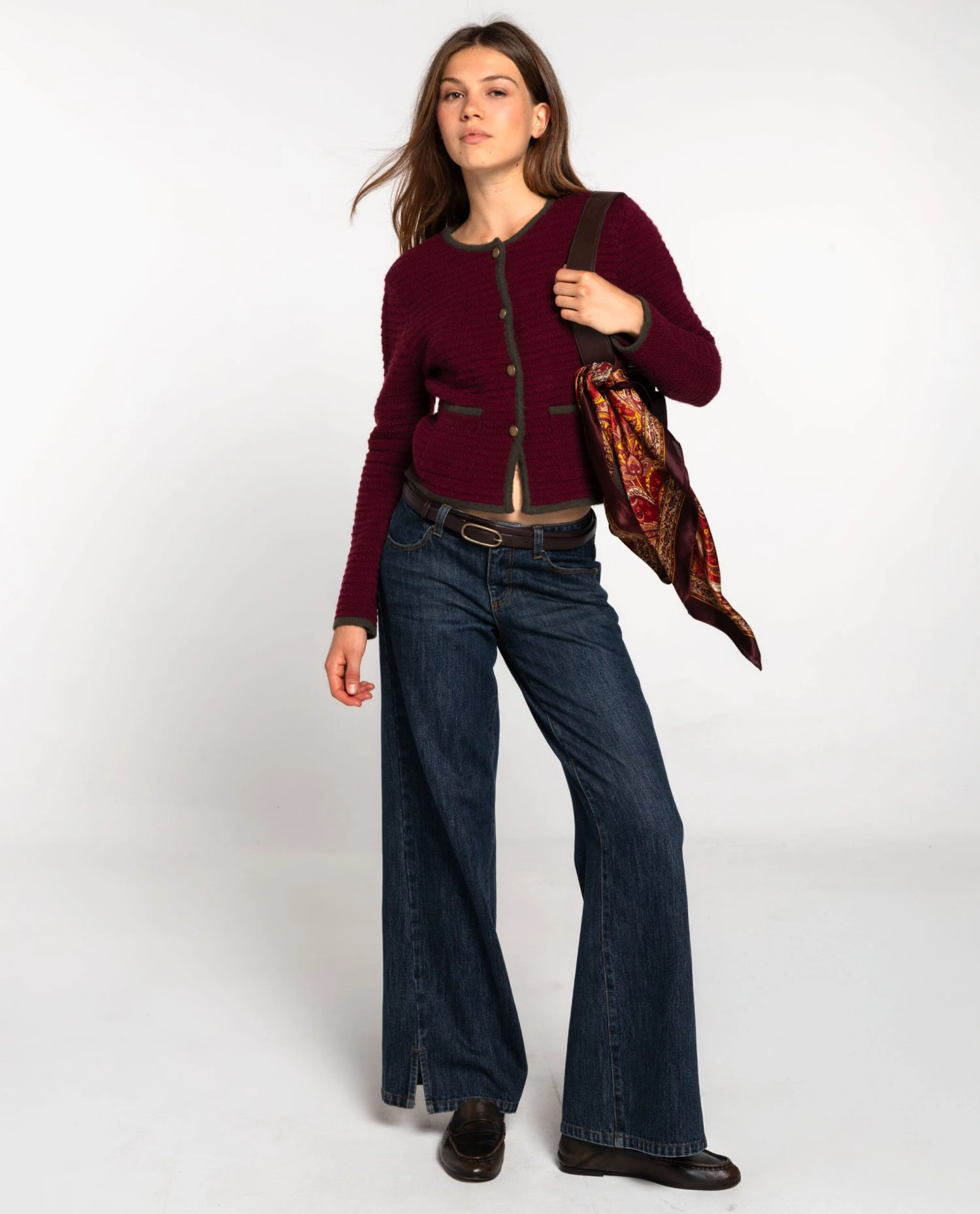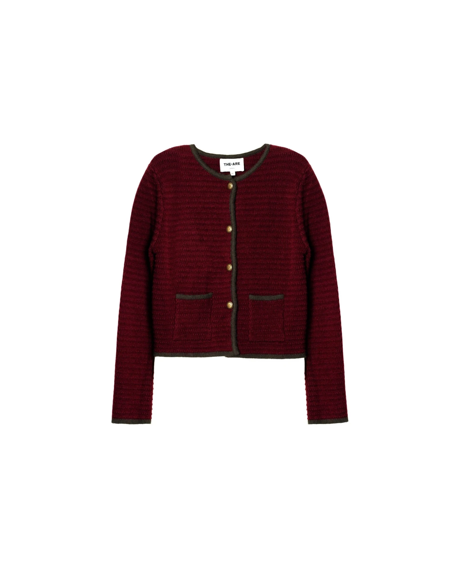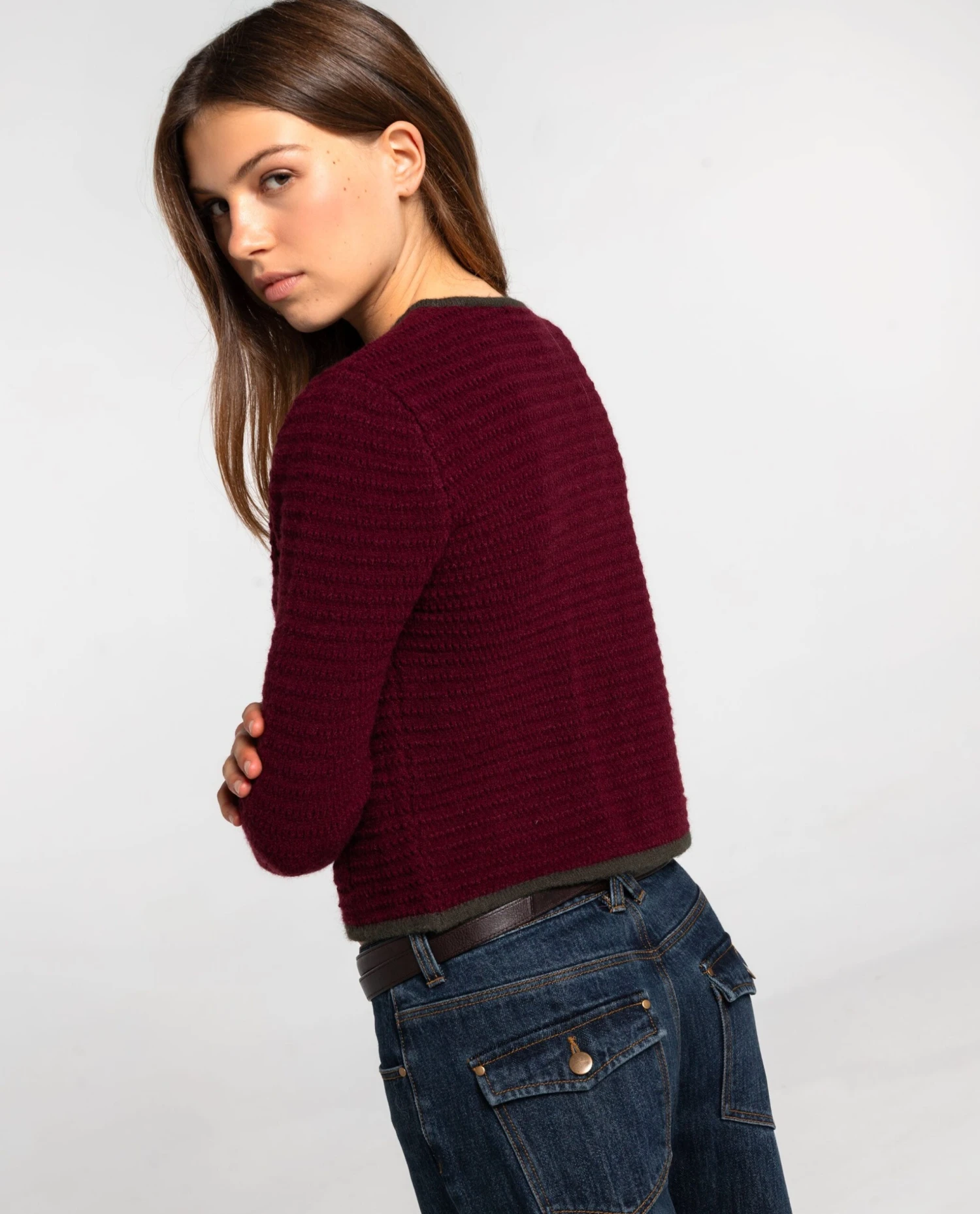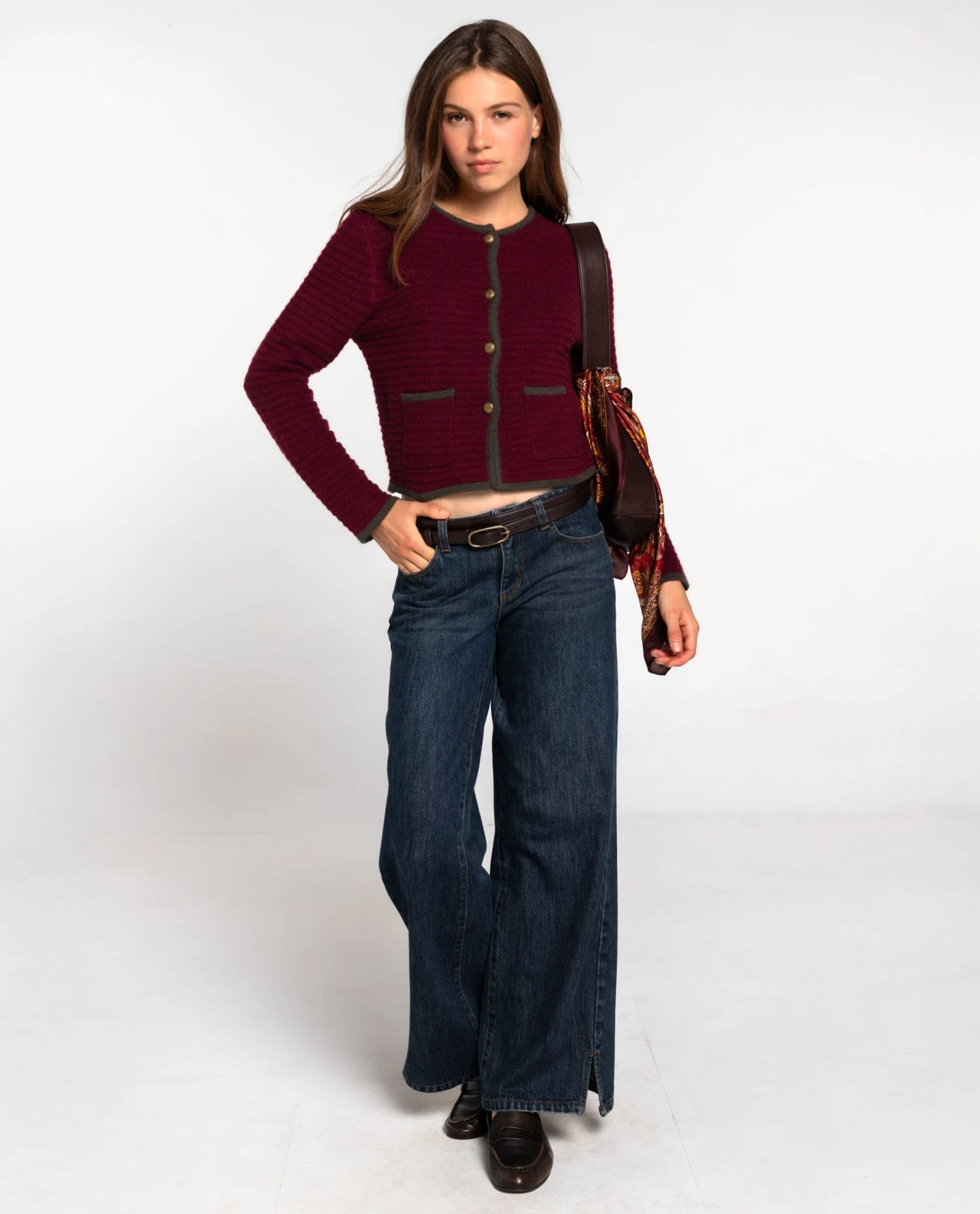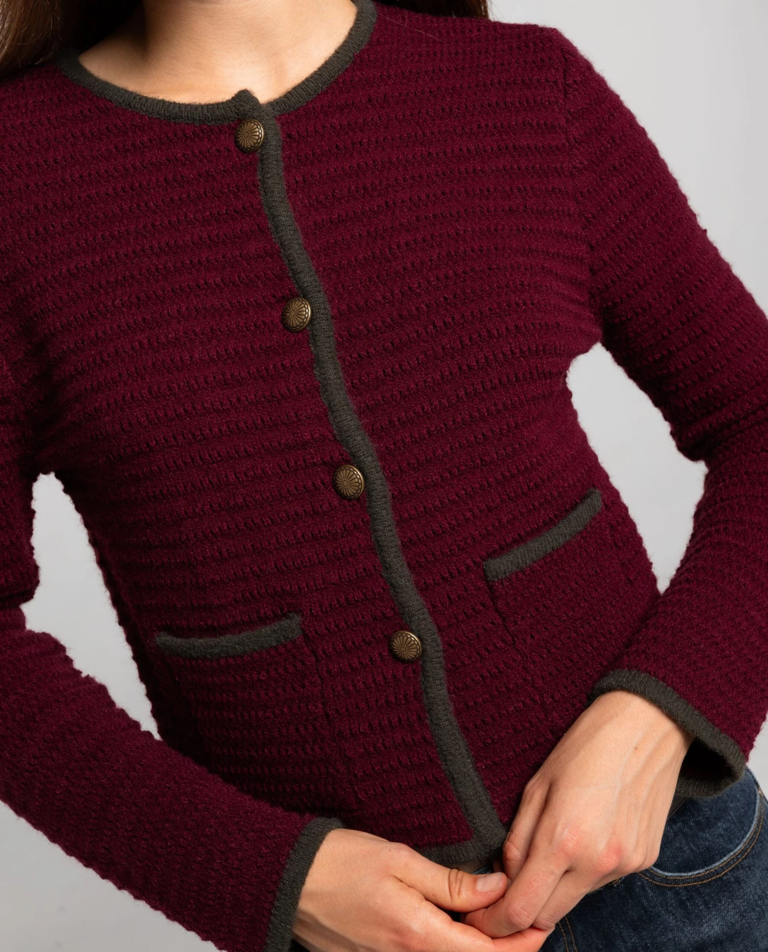 Chaqueta corta de punto burdeos con botones dorados.[readmore]Chaqueta corta de punto en color burdeos. Rib en contraste de color en escote, bolsillos y bajos. Botones dorados metálicos delanteros. [sizes]