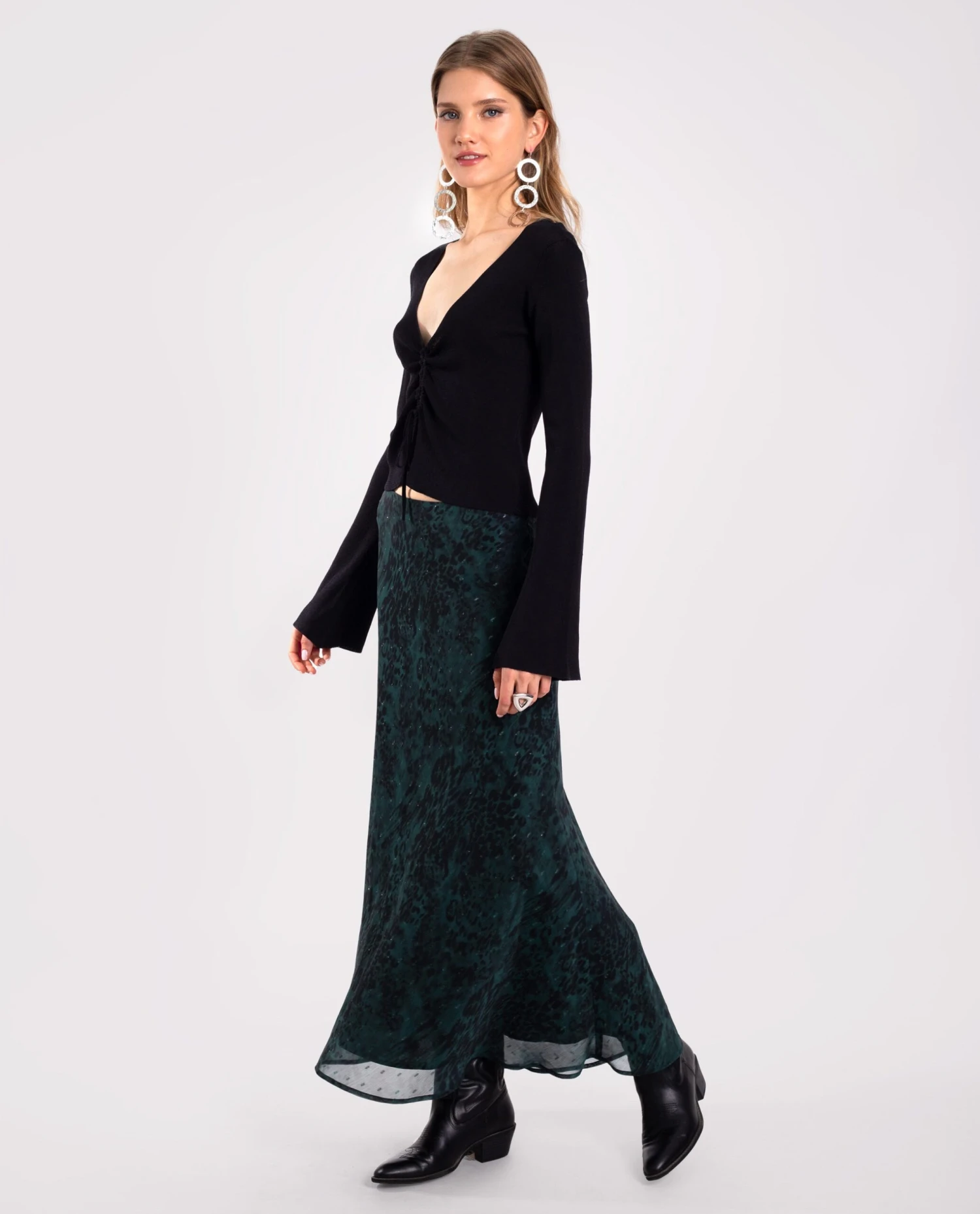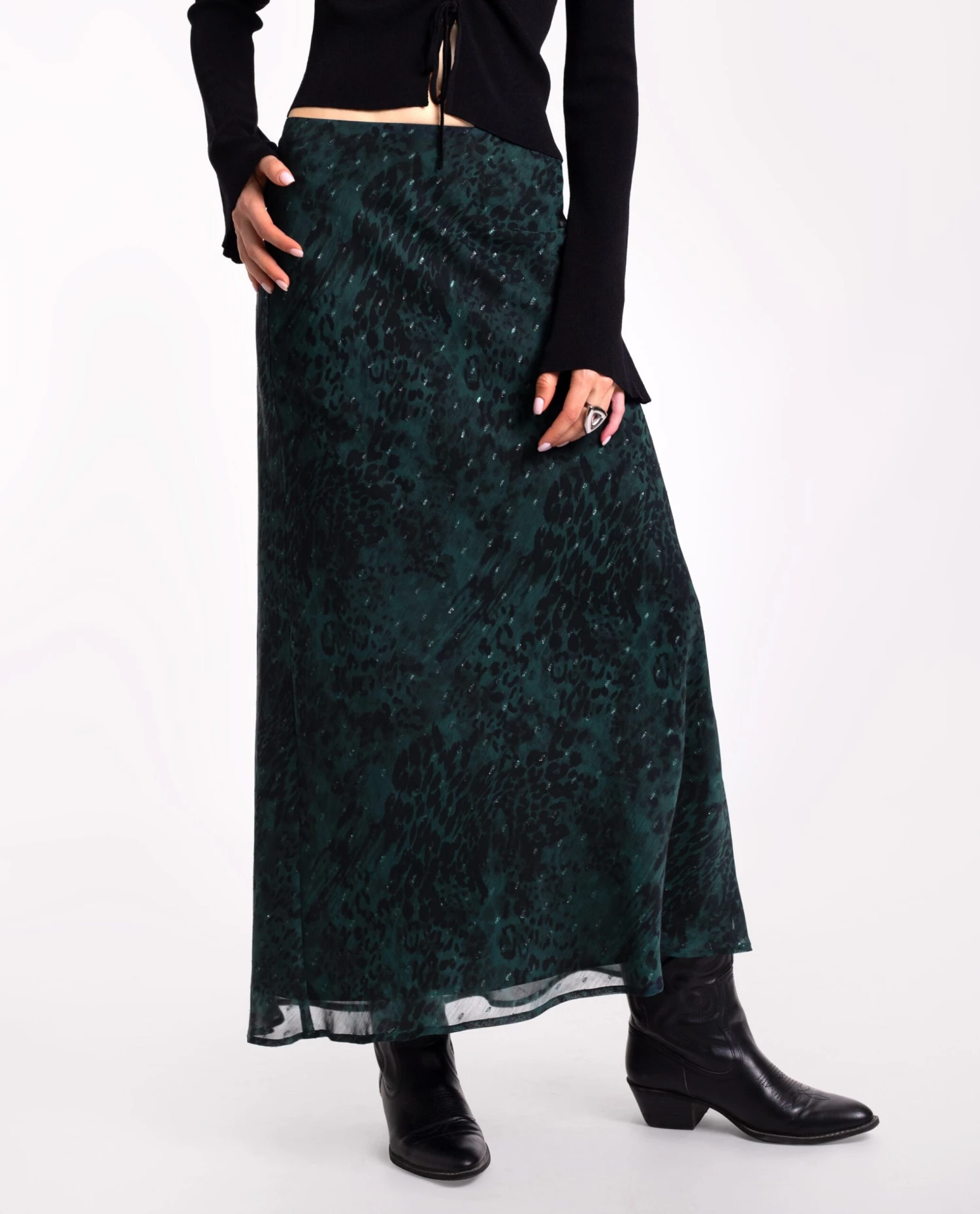 Falda midi con estampado.[readmore]Esta falda tiene el largo midi perfecto para llevarla tanto con botas como con zapatillas, según el estilo que quieras darle. El estampado animal print, creado en tonos verdes y con hilos de lurex, aporta un brillo sutil que hace que este conjunto sea muy versátil y perfecto para llevar a diario y también en ocasiones especiales. ¡Combínala con la blusa a conjunto y consigue el look completo!