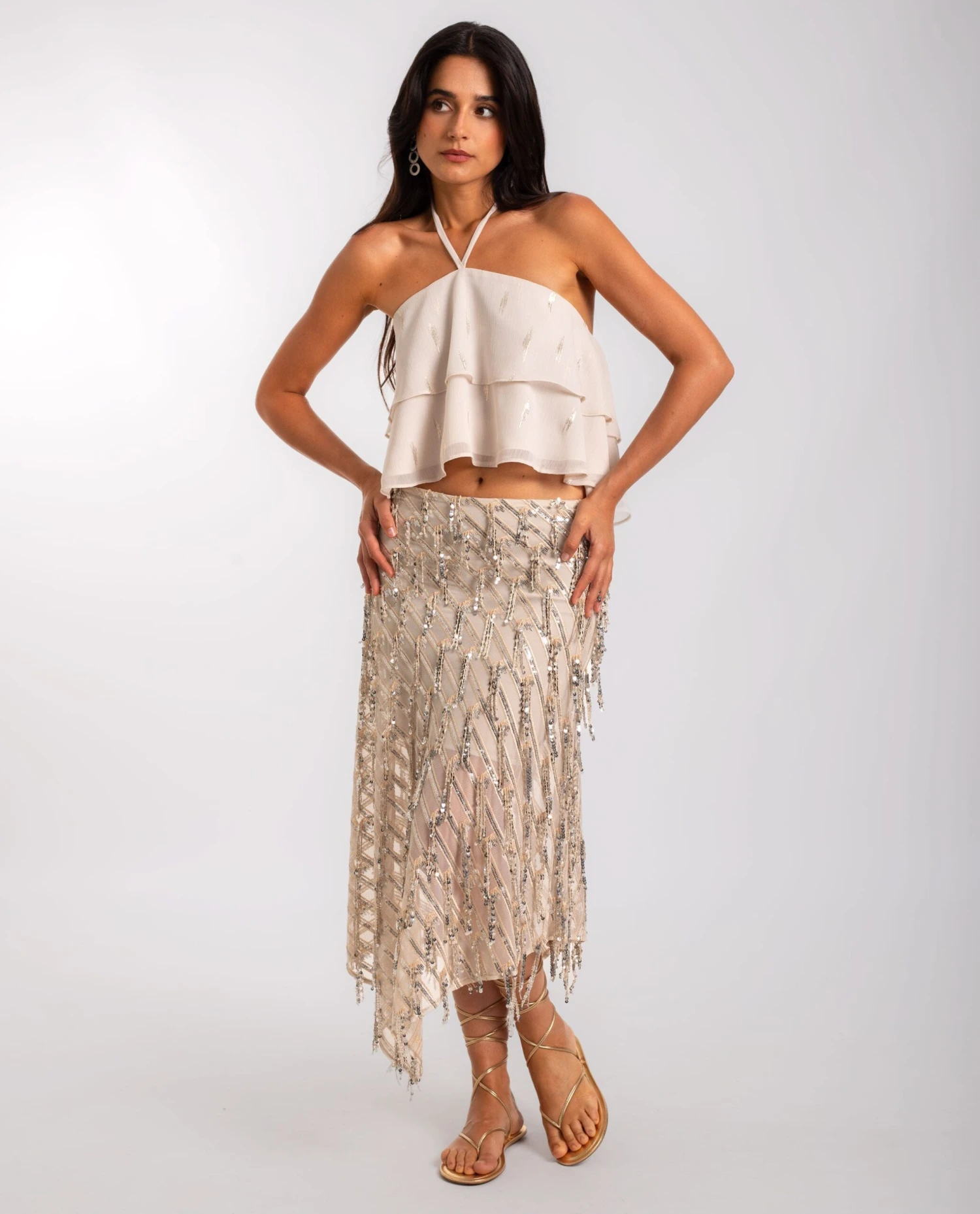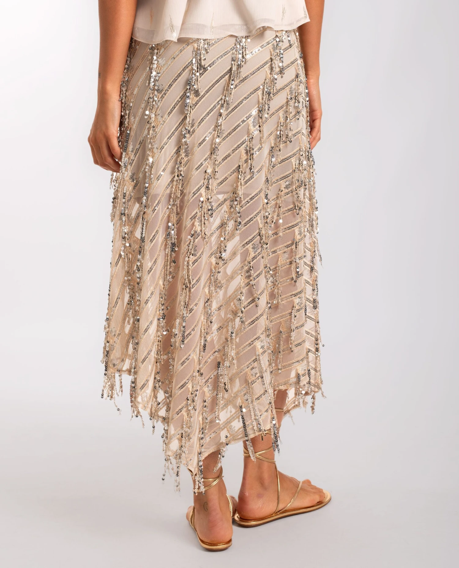 Falda midi con estampado de lentejuelas.[readmore]Esta falda está diseñada para convertirse en la prenda clave de tus planes más especiales este verano. La clave está en su versatilidad: puedes llevarla con una sandala de tacón para un look más arreglado o con unas sneakers o sandalia plana para un look más casual. Confeccionada en un tejido de gasa con lentejuelas en brillo dorado y con forro para que te sientas lo más cómoda posible. Lleva goma elástica en la cintura para un ajuste perfectamente. Es la elección ideal para ser la amiga del grupo con los mejores looks del verano.