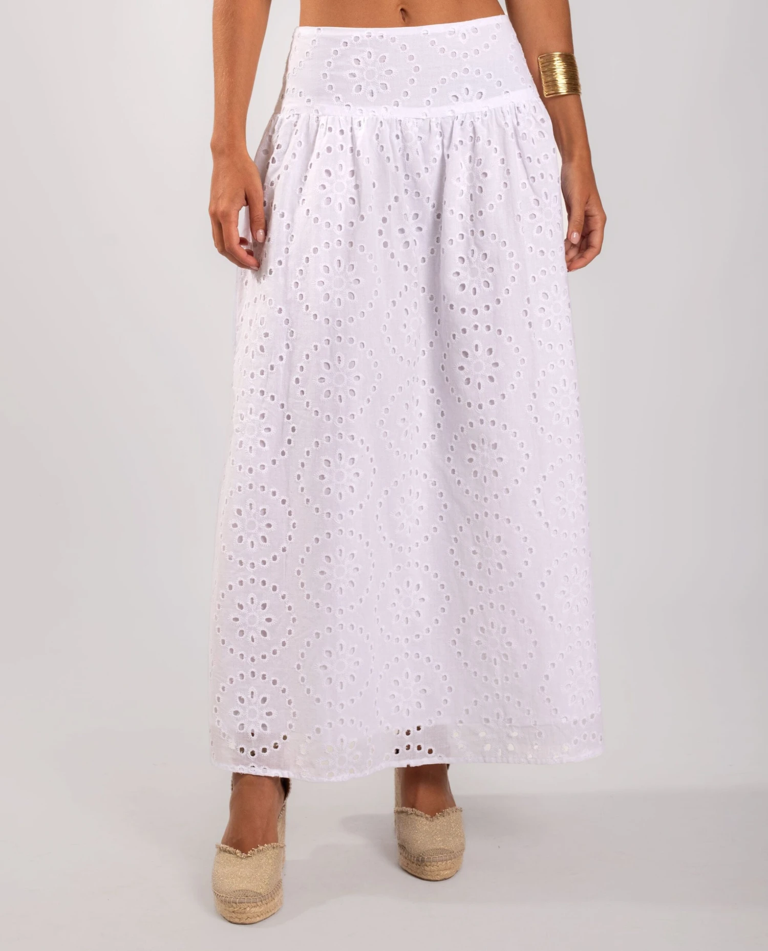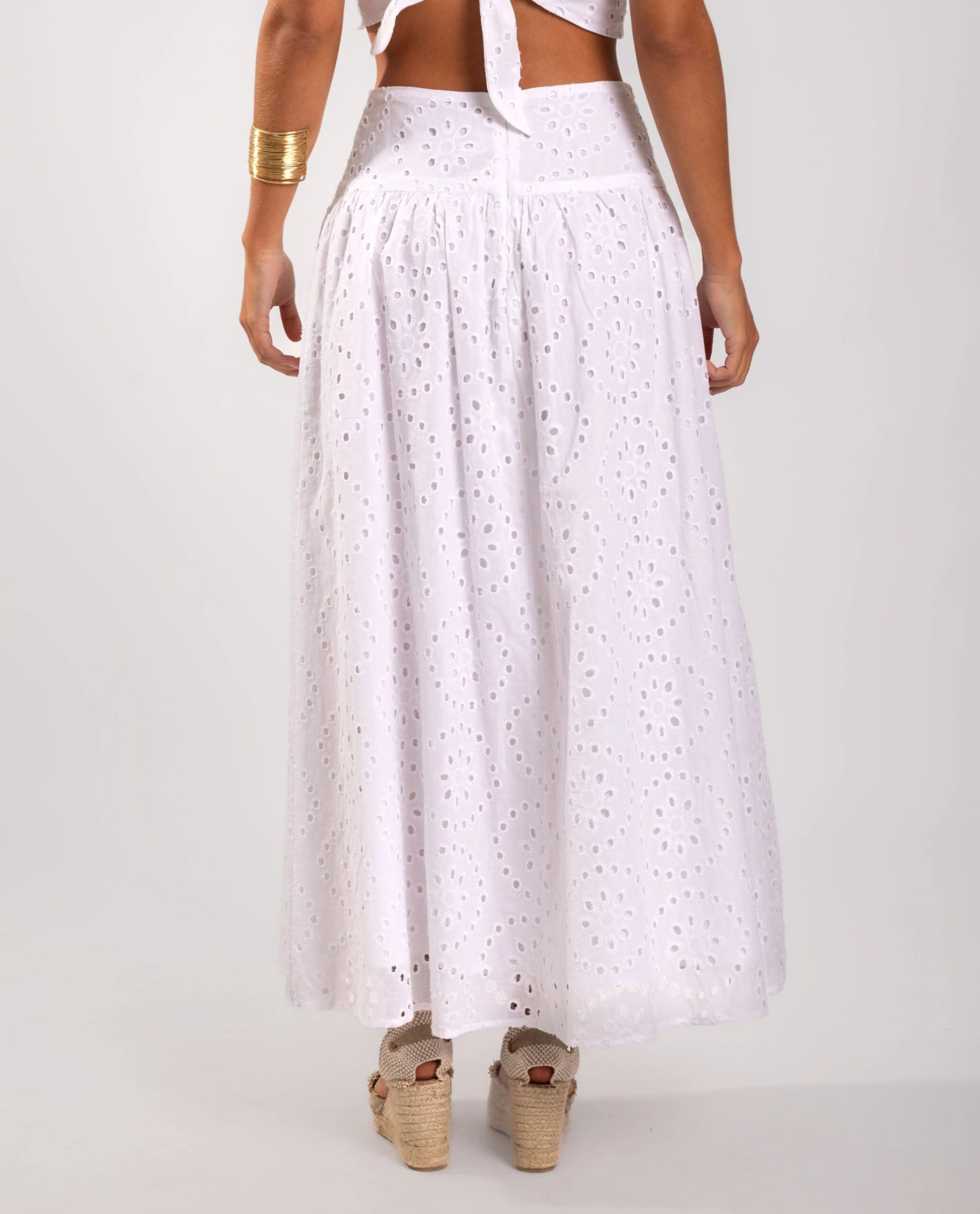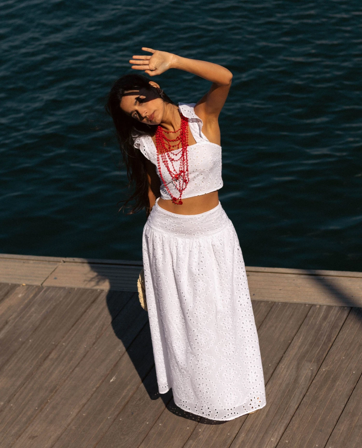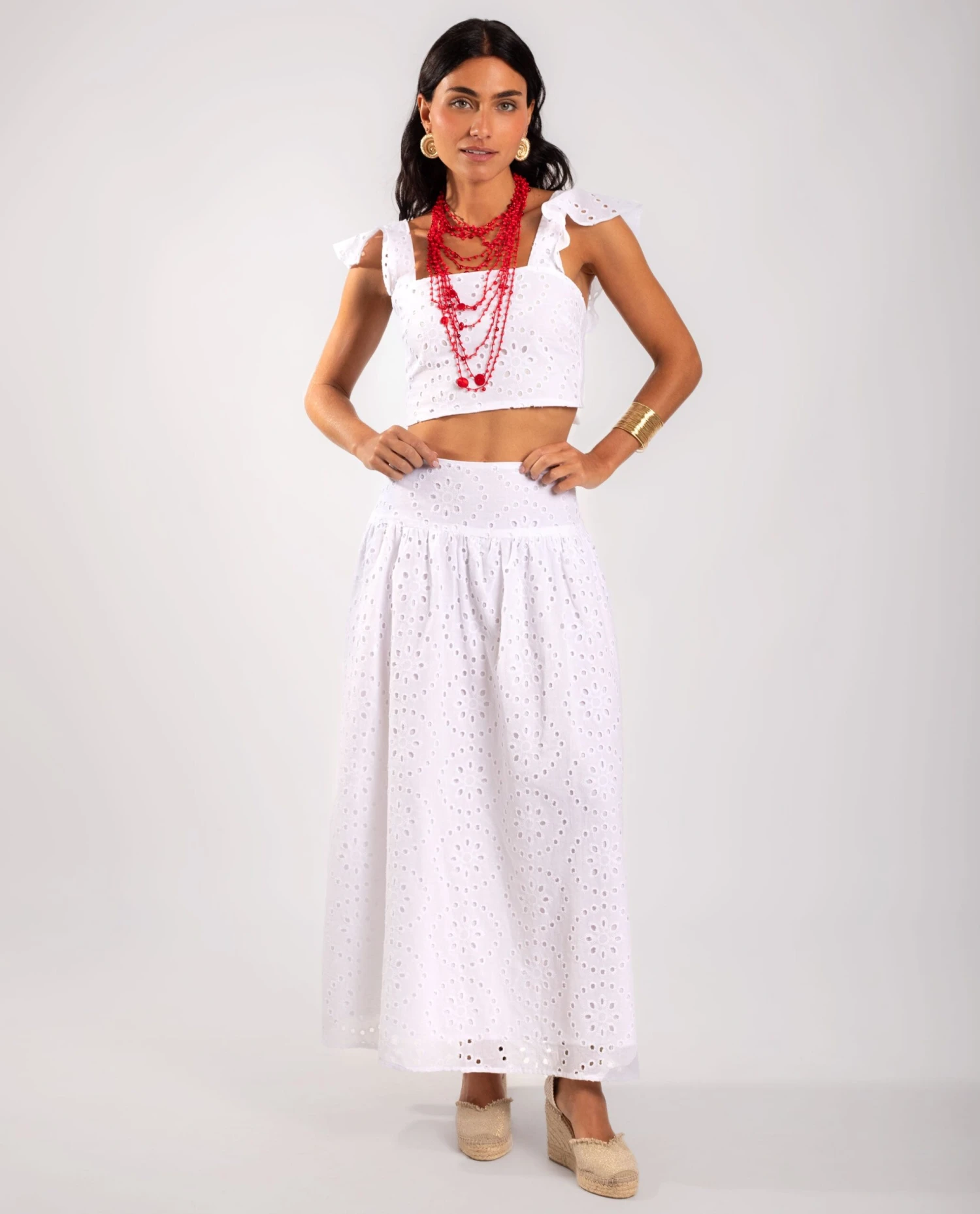 Falda popelín bordada y corte largo.[readmore]Este conjunto de top crop y falda de popelín bordado es puro detalle: el top tiene escote cuadrado, tirantes con volante y lazada en la espalda para ajustarlo como quieras. La falda a conjunto, diseñada con la misma tela, de corte largo, cremallera invisible y con un vuelo que queda genial. Tiene un forro de algodón para que te sientas más cómoda. ¡El combo perfecto para cualquier plan especial este verano!
