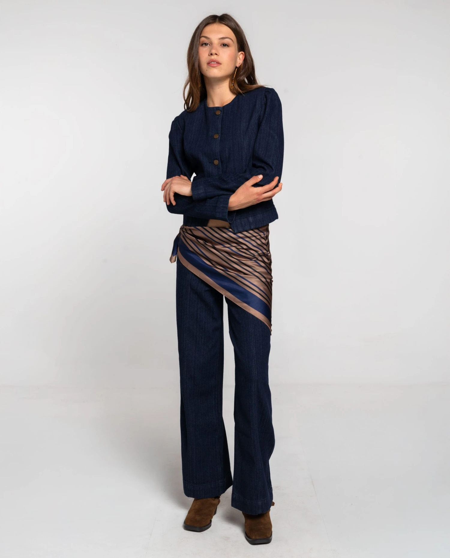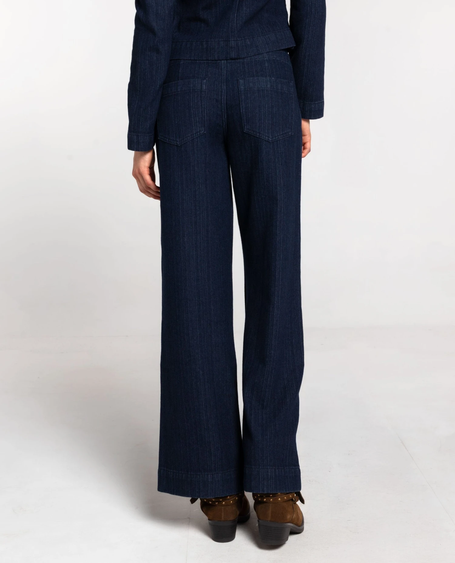 Jeans rectos con talle bajo.[readmore]Empieza a hacer hueco en el armario. Estos pantalones a conjunto con la chaqueta Downtown serán tus favoritos en cuanto te los pruebes. El look de las cool girls de esta temporada. Pantalón de corte recto, en denim con jacquard de rayas.[sizes]