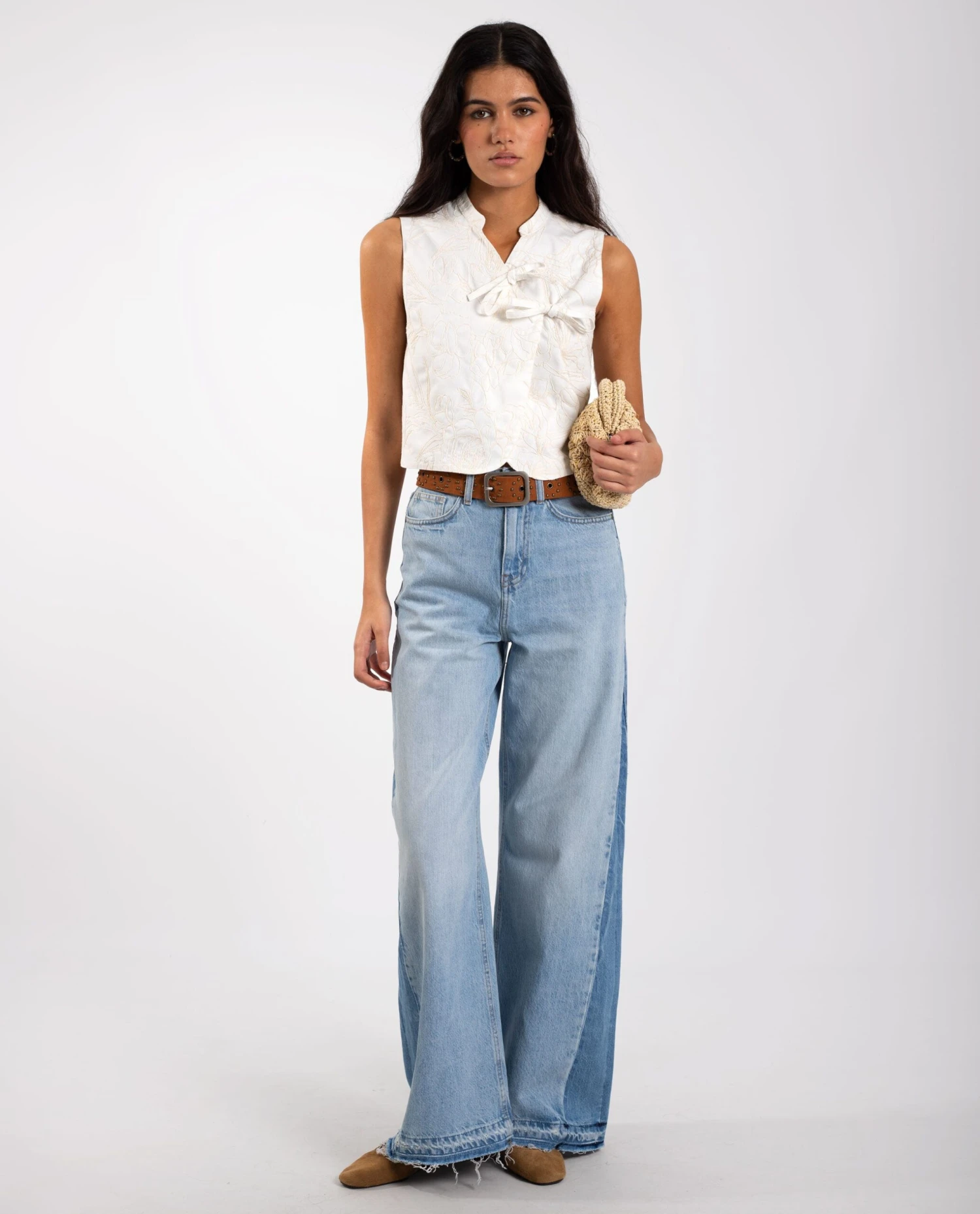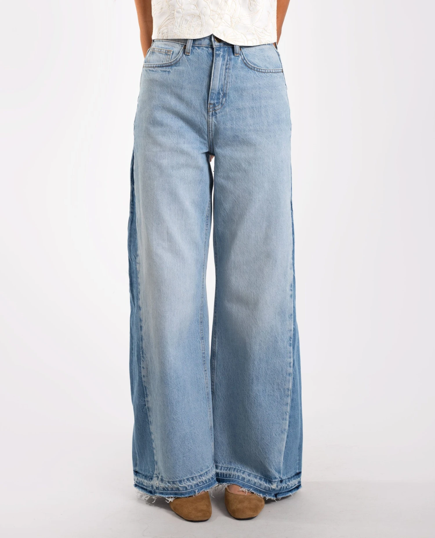 - Corte wide leg con detalle en la pernera.