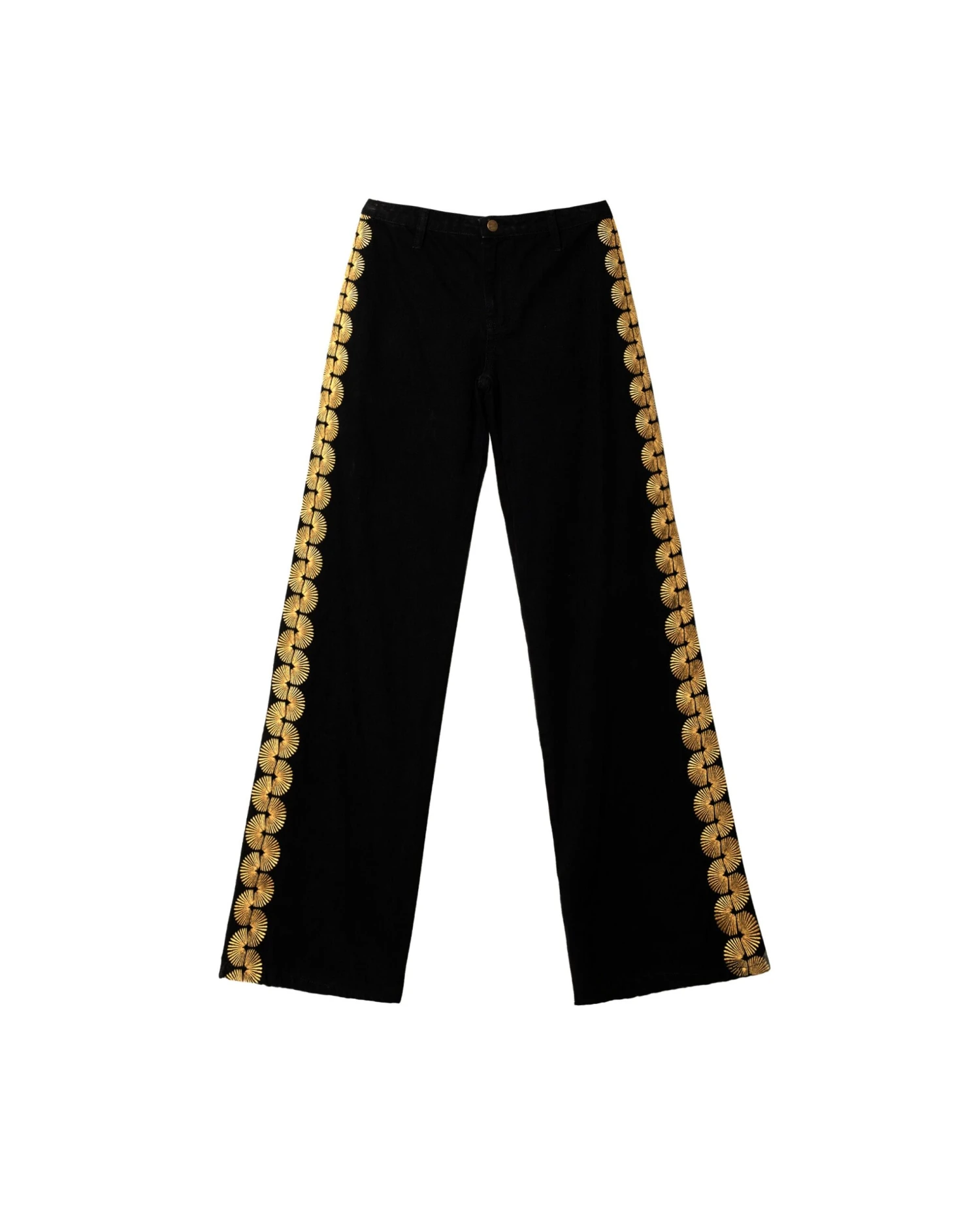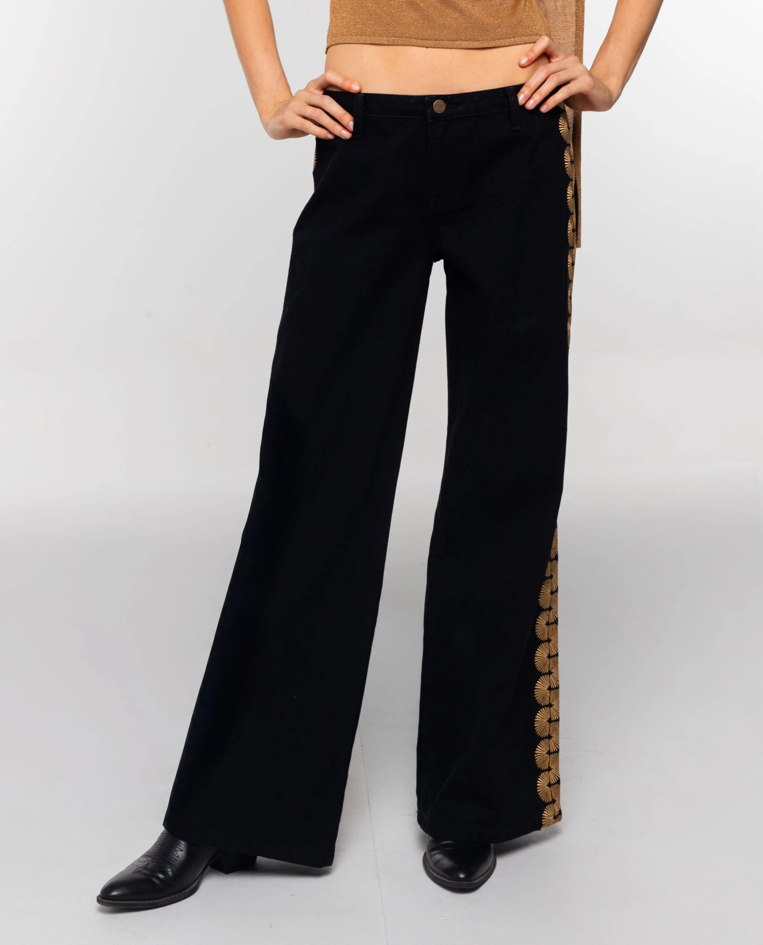 Jeans negros con detalle bordado en los laterales.[readmore]Los jeans estrella de la temporada!. Su diseño clásico de corte recto con pernera ligeramente acampanada se actualiza con un bordado vertical en los costados muy original, que estiliza visualmente la pierna y añade un detalle muy original de estilo a tus outfits. Estos jeans se convertirán en uno de esos vaqueros que no querrás dejar de llevar: versátil, con personalidad y fácil de combinar tanto con básicos como con prendas más especiales. Son la prenda esencial que tu armario necesita!