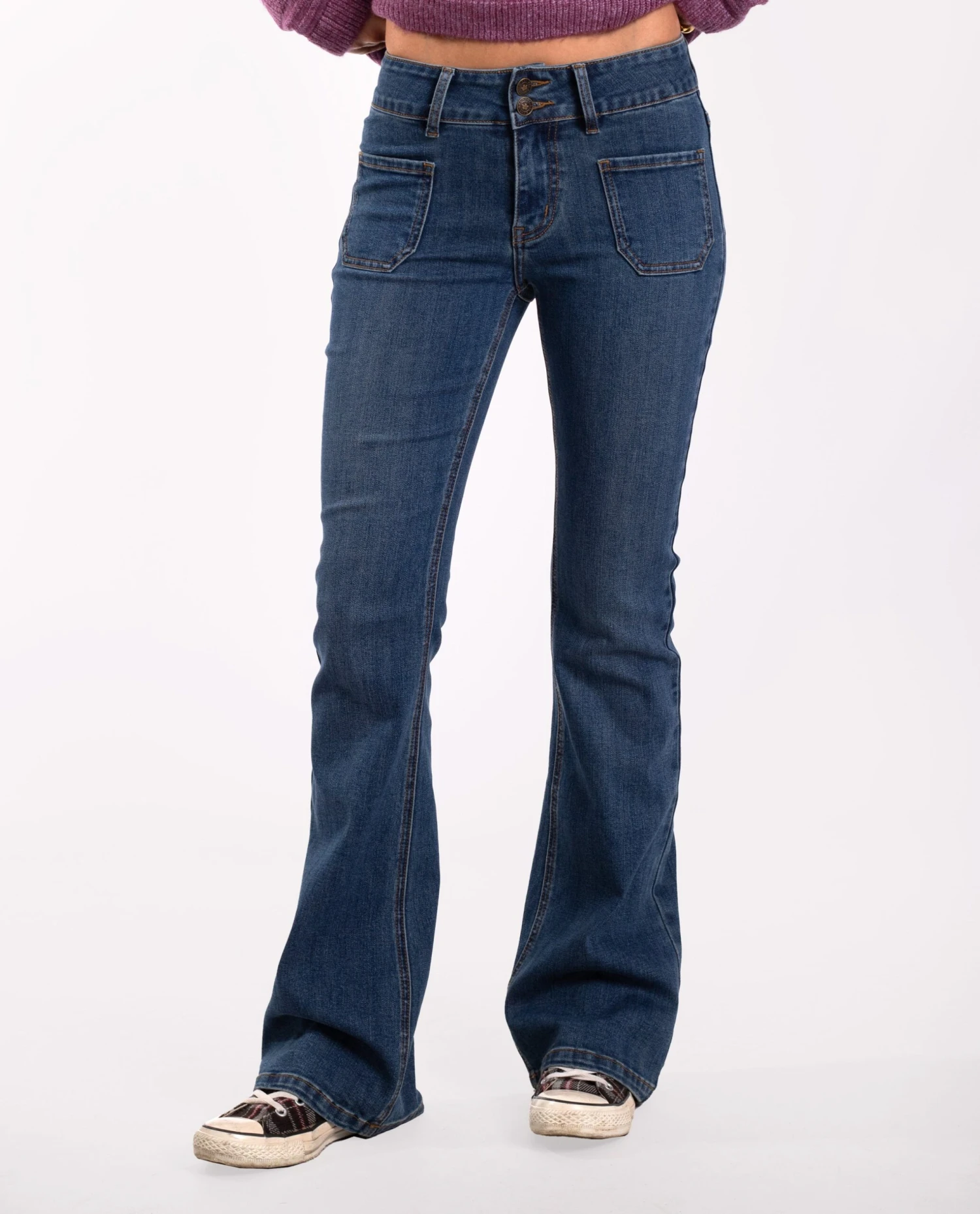 Jeans vaqueros acampanados con bolsillos vistos.[readmore]Unos pantalones acampanados en color azul que, además de combinar con todo, favorecen muchísimo la silueta gracias a su diseño. Tiene la cintura media, con dos bolsillos vistos delanteros y dos traseros. Son un poco elásticos por lo que se adaptan genial al cuerpo y el detalle del bajo acampanado es una tendencia que si o si tienes que añadir ya a tu colección! Apuesta por ellos porque en cuanto te los pongas, no te los vas a querer quitar!