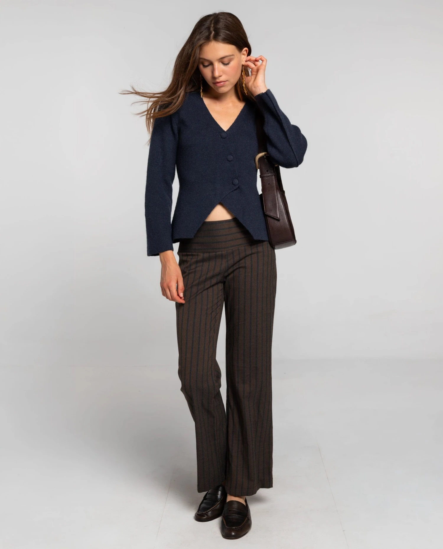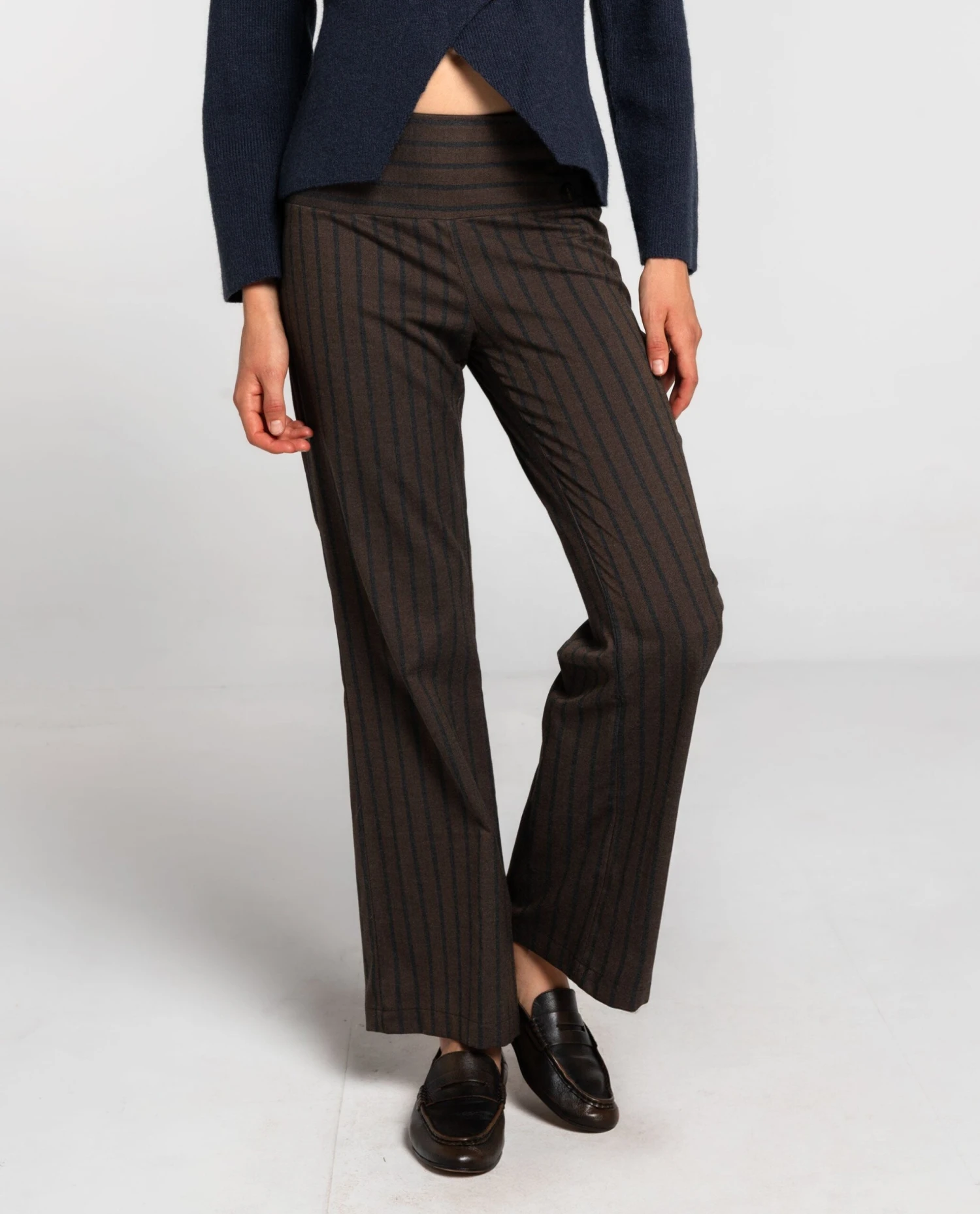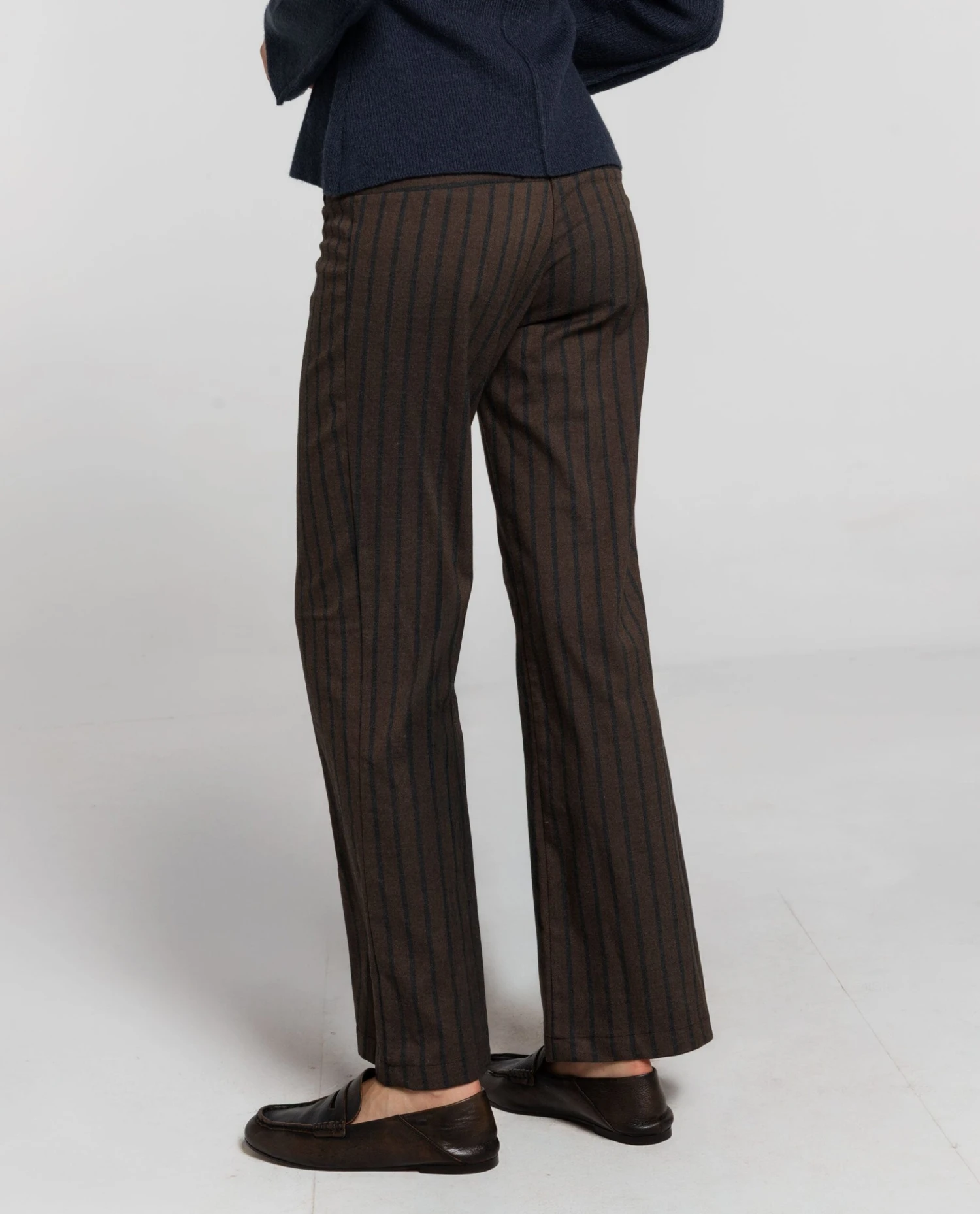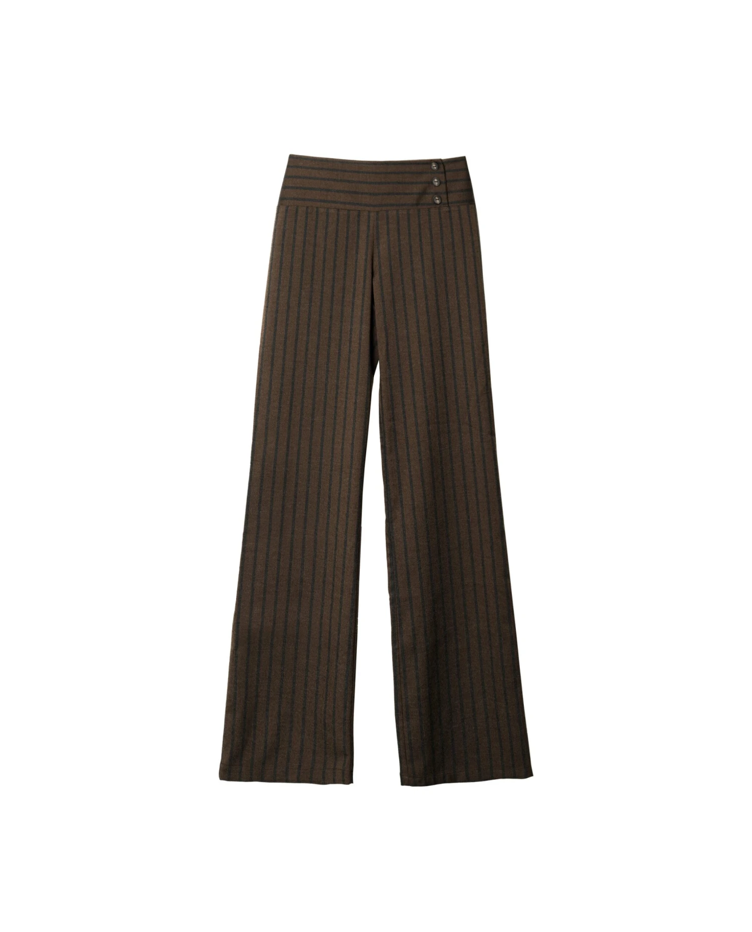 Pantalón largo de rayas marrón y gris.[readmore] Pantalón de raya en marrón y gris con pernera recta y amplia. La cinturilla ancha con tres botones y cremallera invisible aporta un ajuste limpio y cómodo. Llévalo con camisa y blazer o con top y zapatillas.