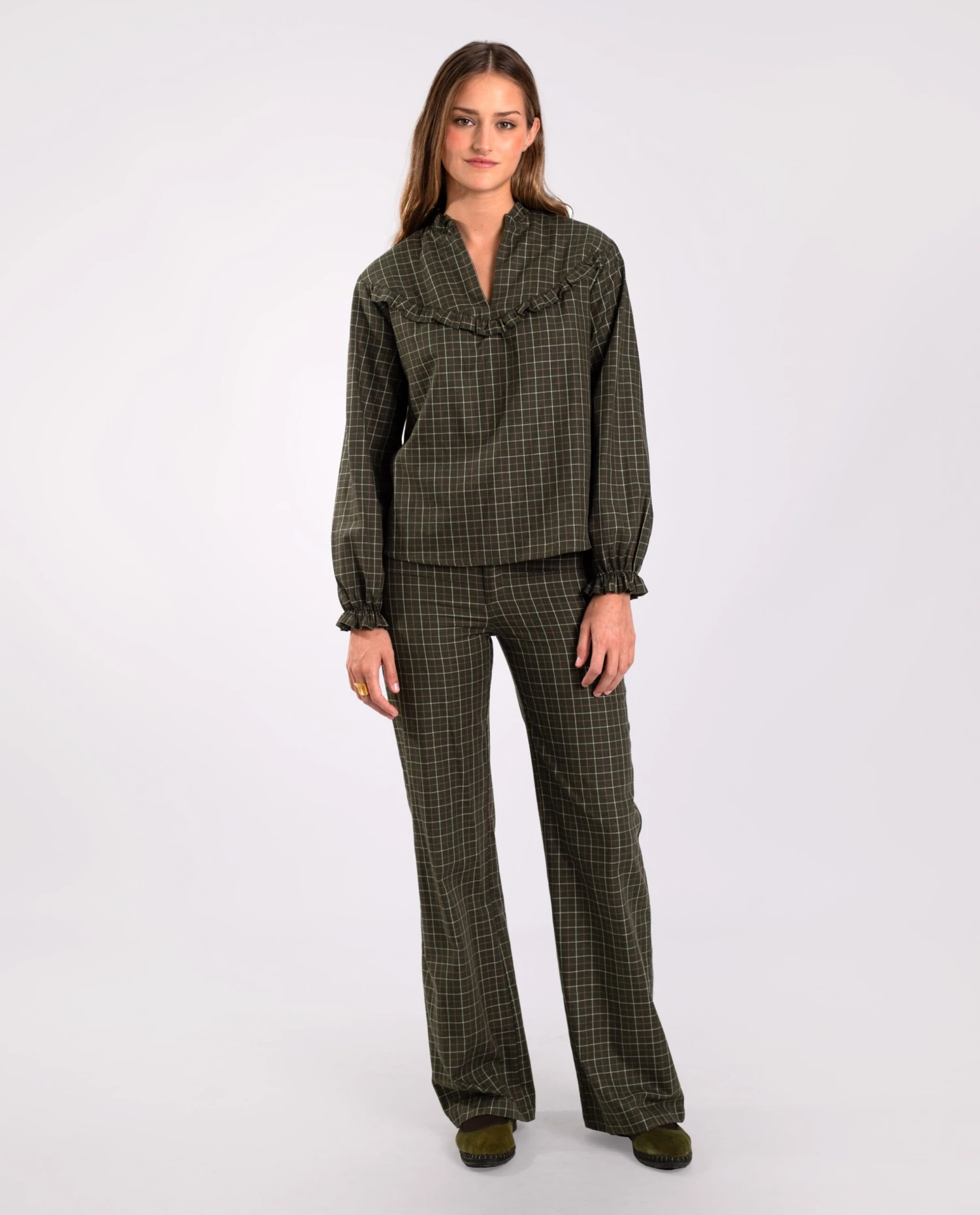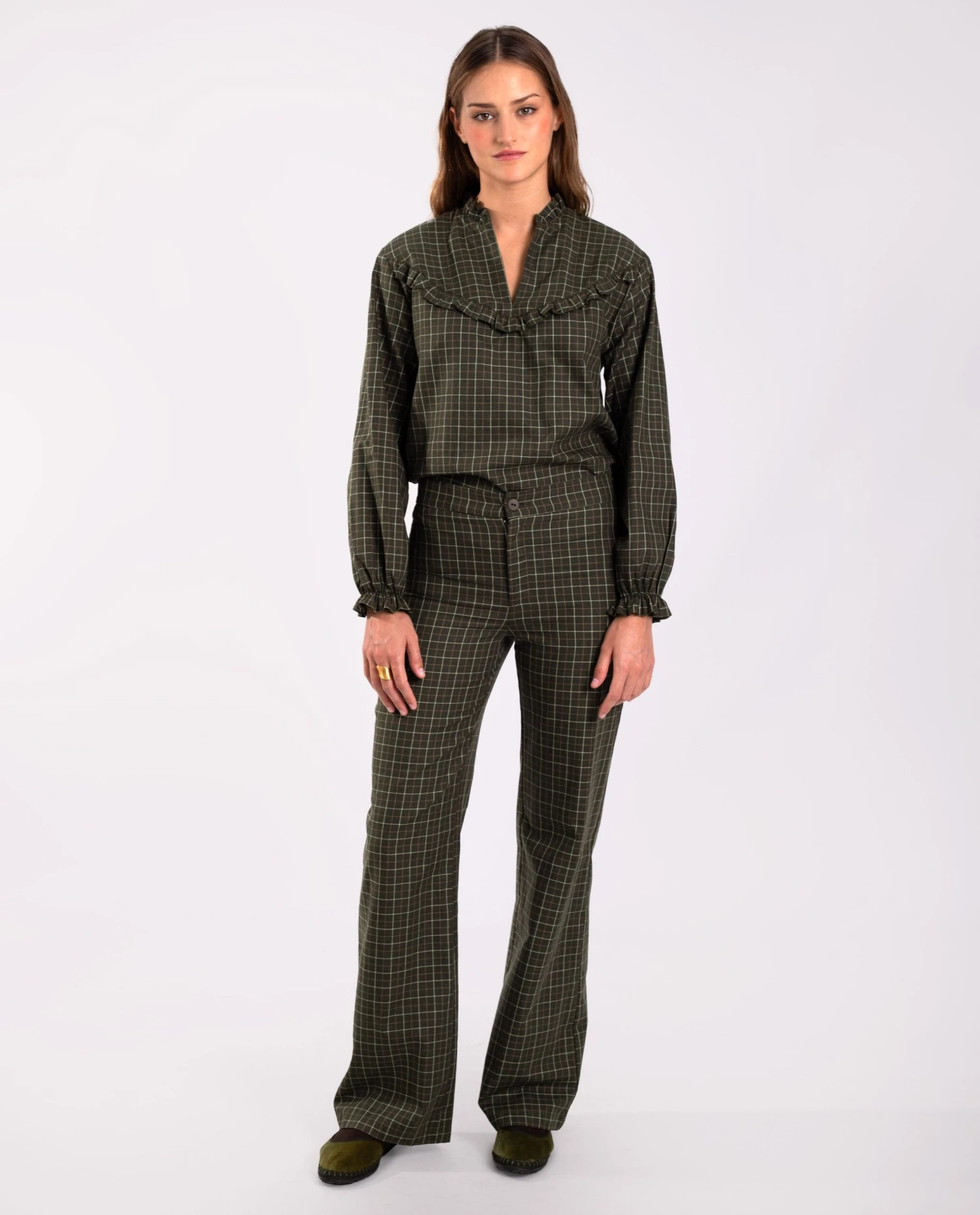 Pantalón largo de cuadros verde corte recto.[readmore]Uno de esos conjuntos que sabemos que vas a llevar toda la temporada, tanto junto como por separado. Está confeccionado con un algodón muy agradable de cuadros verdes, un estampado que vuelve pisando fuerte este otoño. El pantalón es de talle medio y corte recto. Son muy cómodos para llevar en el día a día y gracias a su diseño sientan como un guante. Ya sea que lo lleves con la blusa a conjunto, una camiseta básica o una sudadera a tono, este pantalón nos parece la mejor opción para elevar cualquier look.