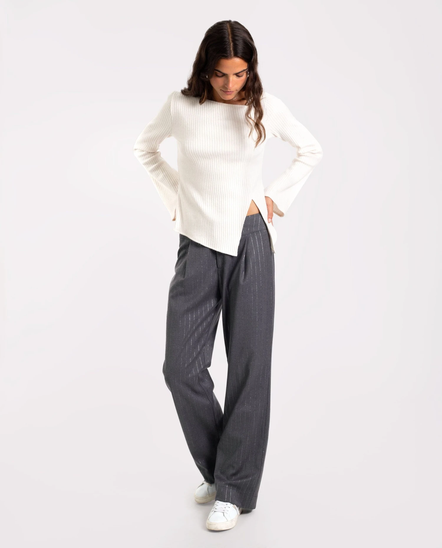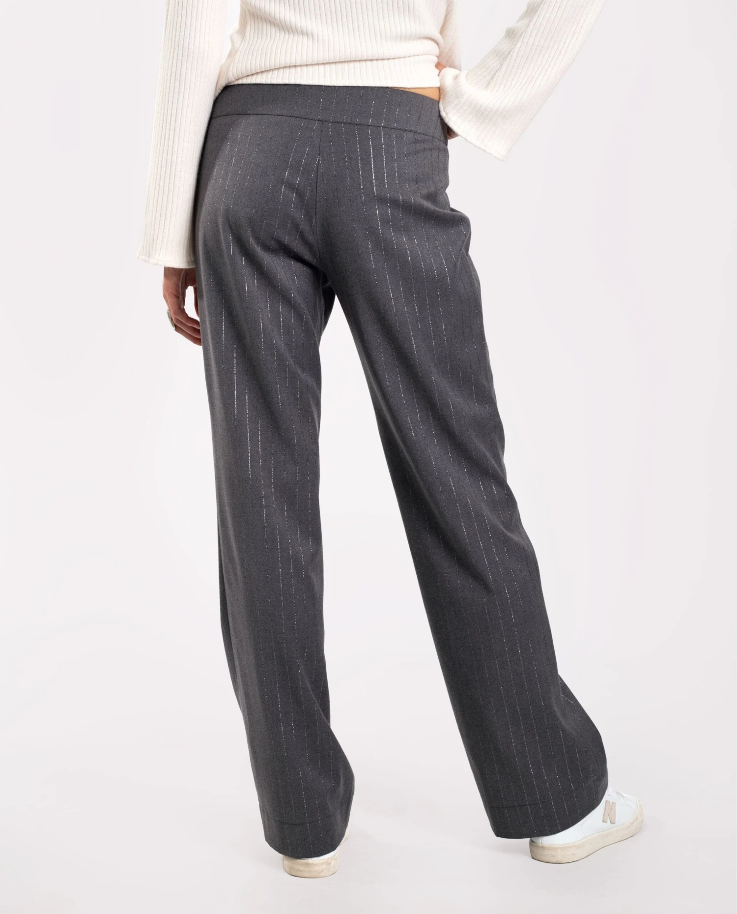 Pantalón de traje mujer gris con raya diplomática.[readmore]Este traje es una de esas prendas especiales que puedes usar a diario y llevarlo más o menos informal. El tejido combina las rayas diplomáticas grises con hilos de lurex que aportan brillo al look. El pantalón largo, de talle medio/bajo, se ajusta perfectamente a ti gracias a su cintura elástica. Es de corte recto, cómodo y versátil para cualquier ocasión. Combínala con la Americana Urban Harvest para conseguir el look completo. ¡Atrévete a llevar la tendencia de los trajes dos piezas!