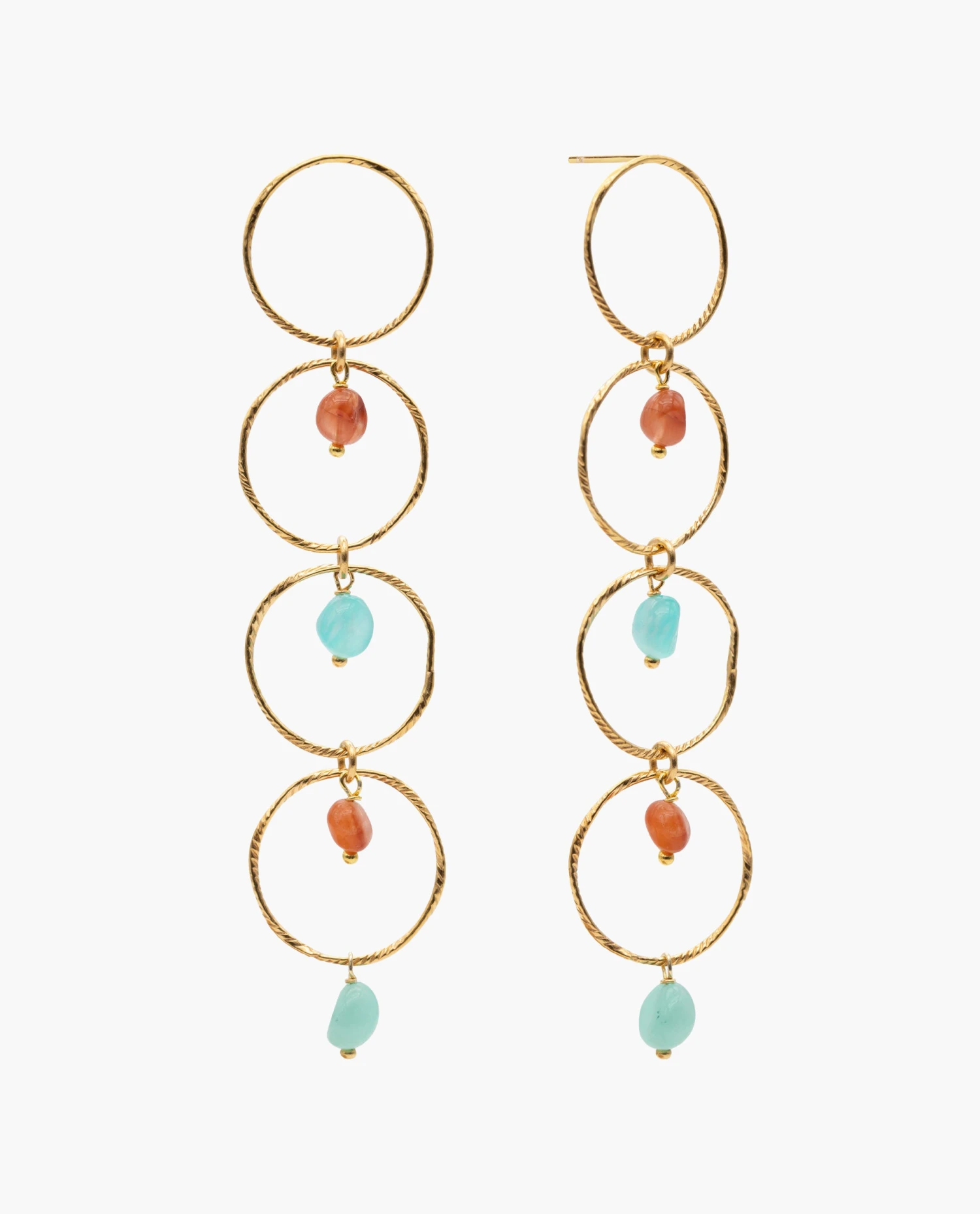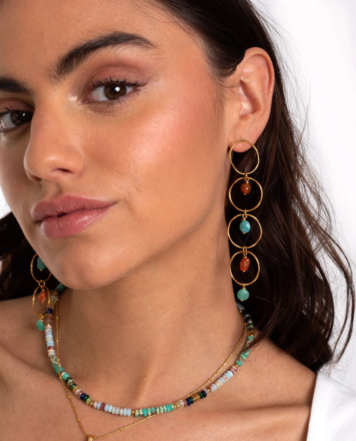 Pendientes largos con círculos y piedras de colores.[readmore]Los colores turquesa y coral de las piedrascombinan con los aros dorados, resaltando el color de tus ojos, sea cual sea. Es una pieza especial cuyo largo es perfecto para llevar siempre contigo. Combínalo con otros accesorios en dorado y aporta un poco color a tu look con estos pendientes tan especiales.