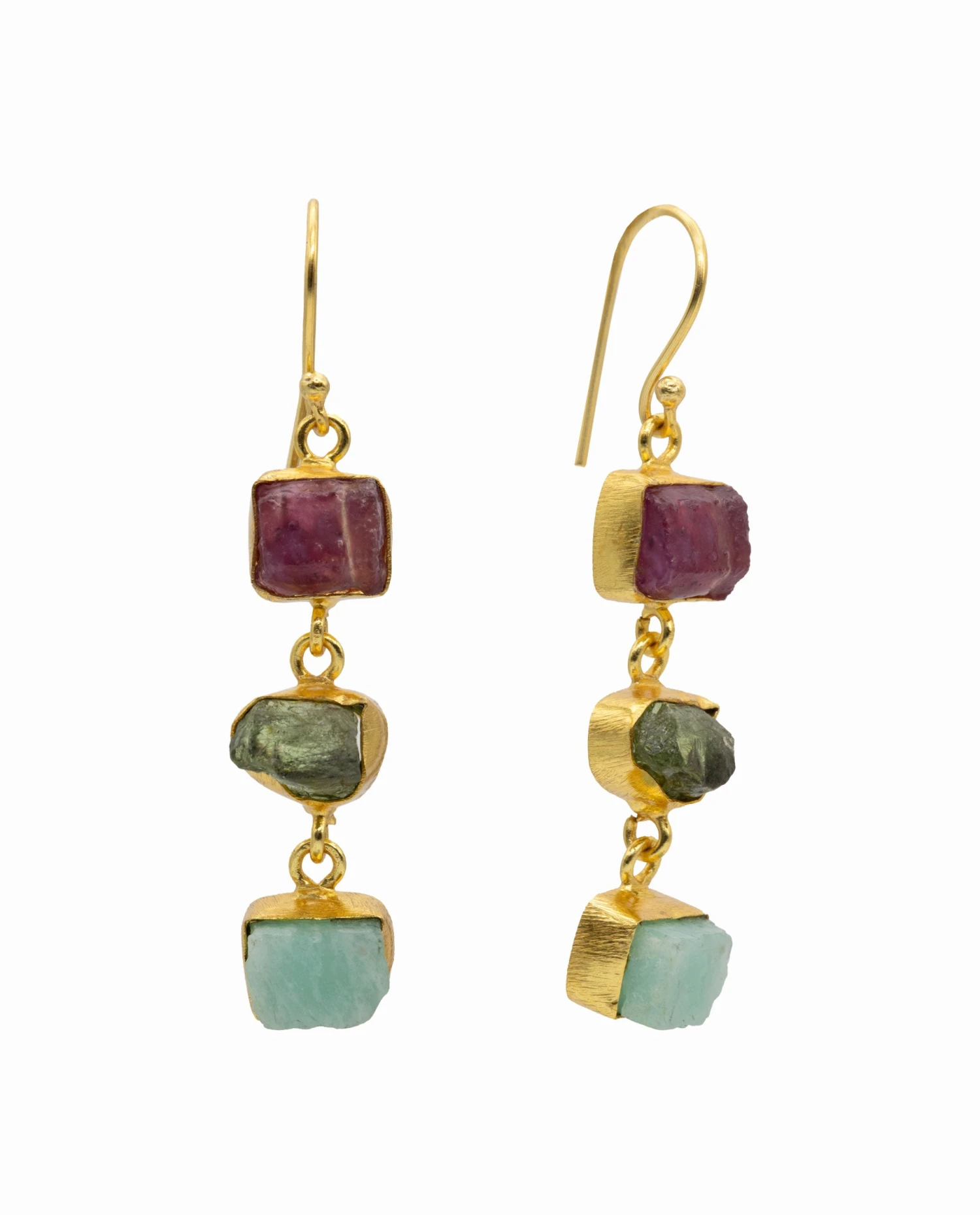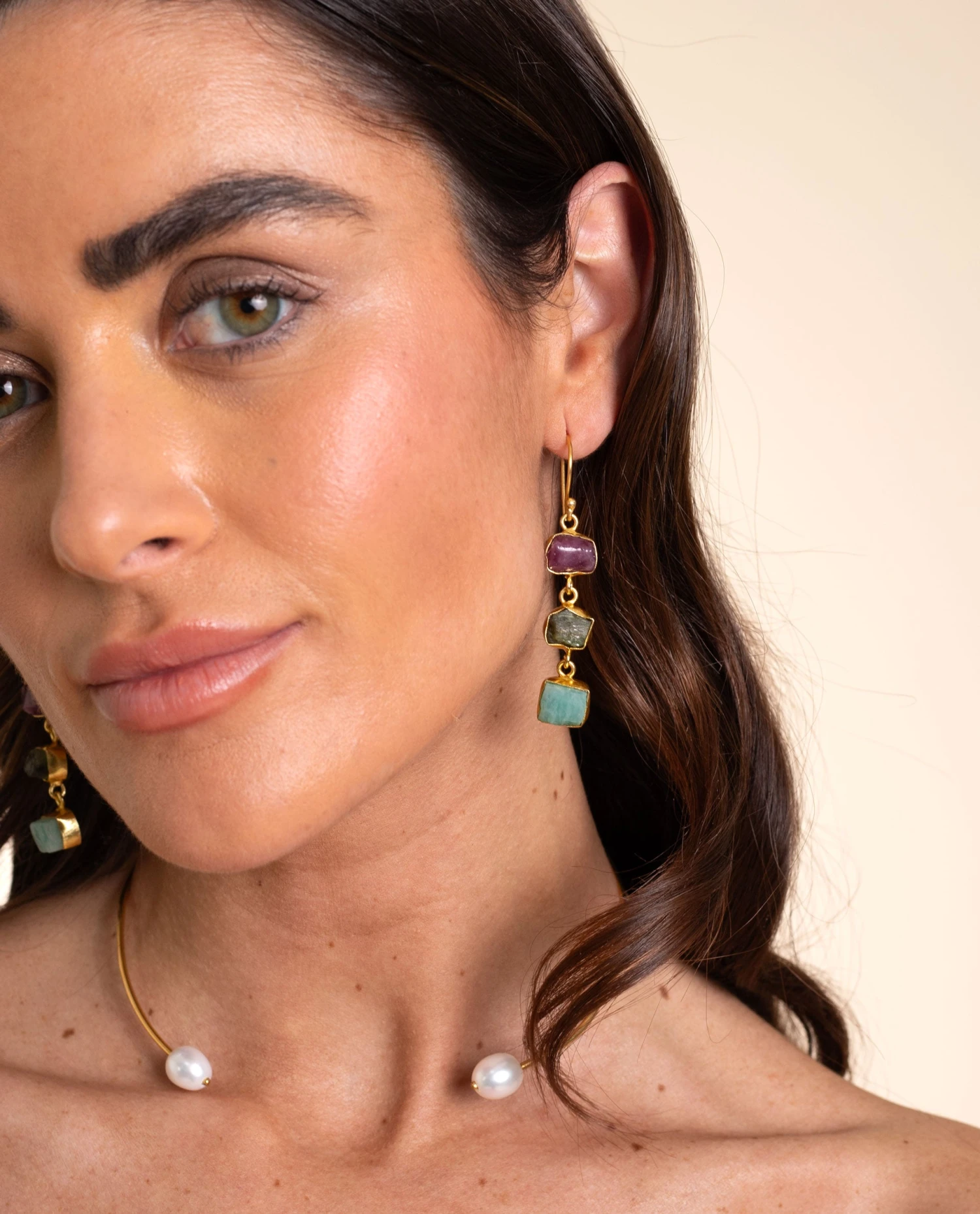 Pendientes largos con 3 piedras naturales.[readmore]Con un diseño original y una combinación de colores que combinan con todo, estos pendientes de invitada se han convertido en uno de nuestros favoritos. Está formado por 3 piedras naturales colgantes: Ruby, Peridoto y Amazonita. El baño de oro de 18kt hace que tengan un brillo más especial. Al ser una pieza con piedras naturales, ningún pendiente va a ser igual, las piedras pueden variar de tamaño y color.