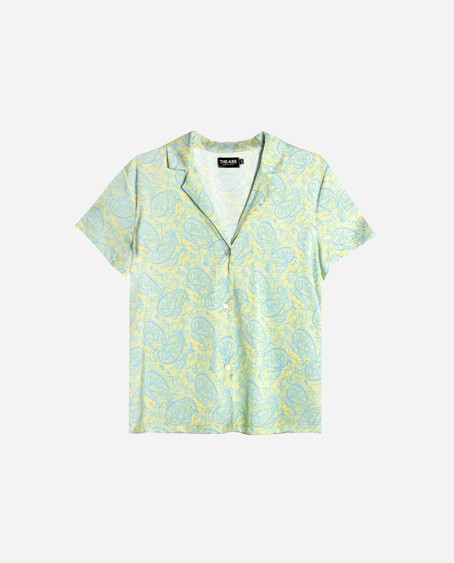 Pijama estampado paisley amarillo y cian colección THE-ARE x @mariafrubies.[readmore]Camisa de pijama manga corta con estampado paisley amarillo y cian. Combínala con el Pantalón Corto del Pijama Yellow Disorder.