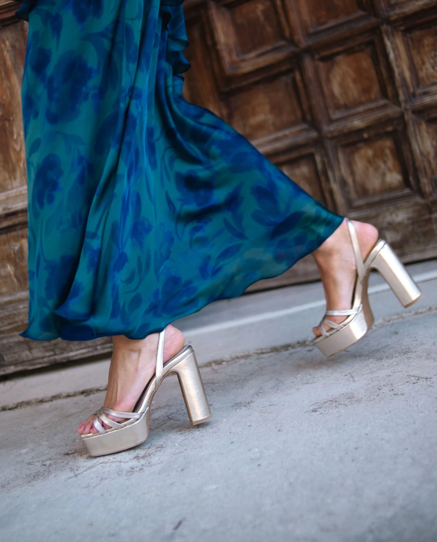 Sandalia dorada de tacón alto 100% piel.[readmore]Diseñadas para ser el complemento perfecto para vuestros looks de invitada. Estas sandalias destacan por su diseño propio y su confección 100% hecha en España.