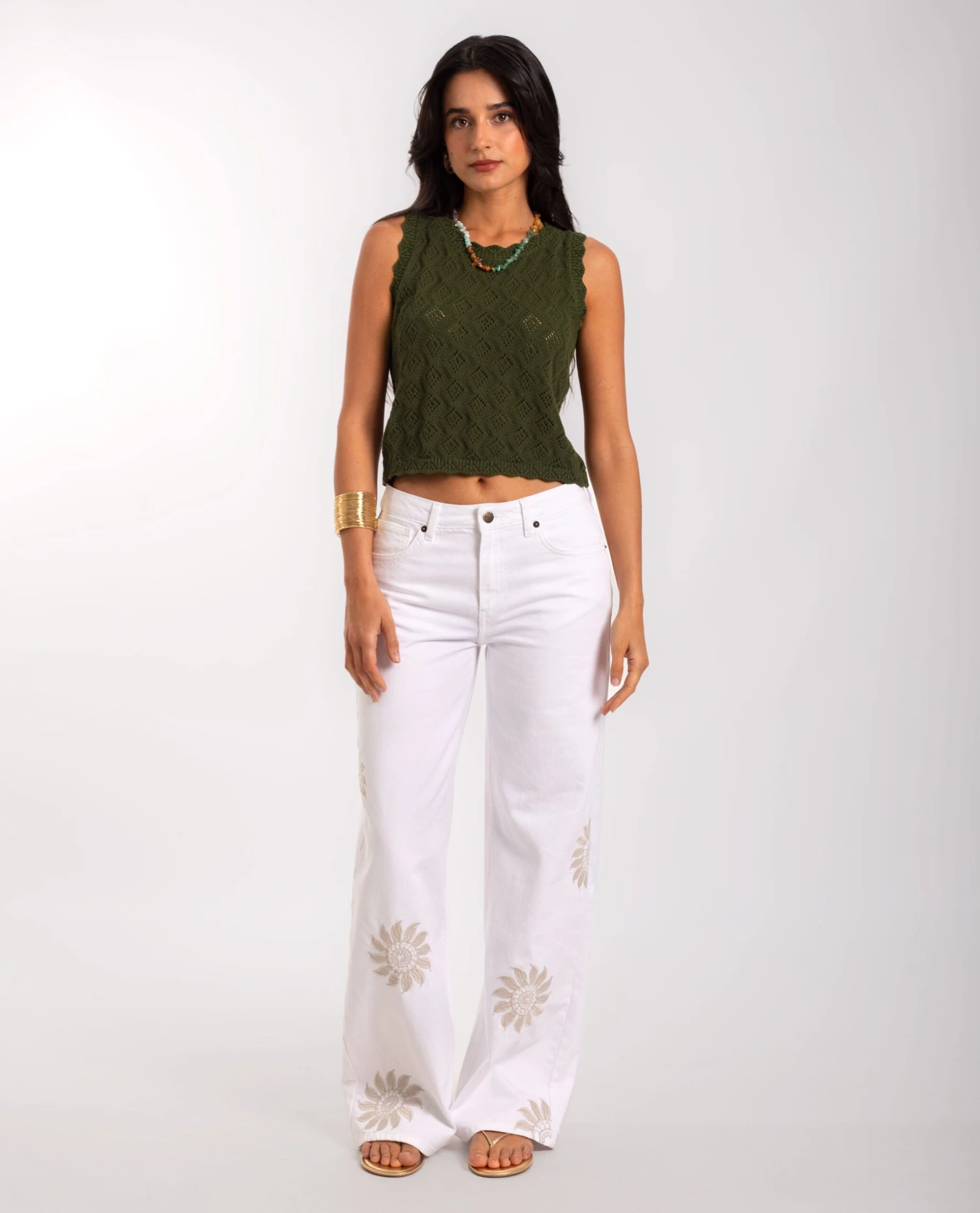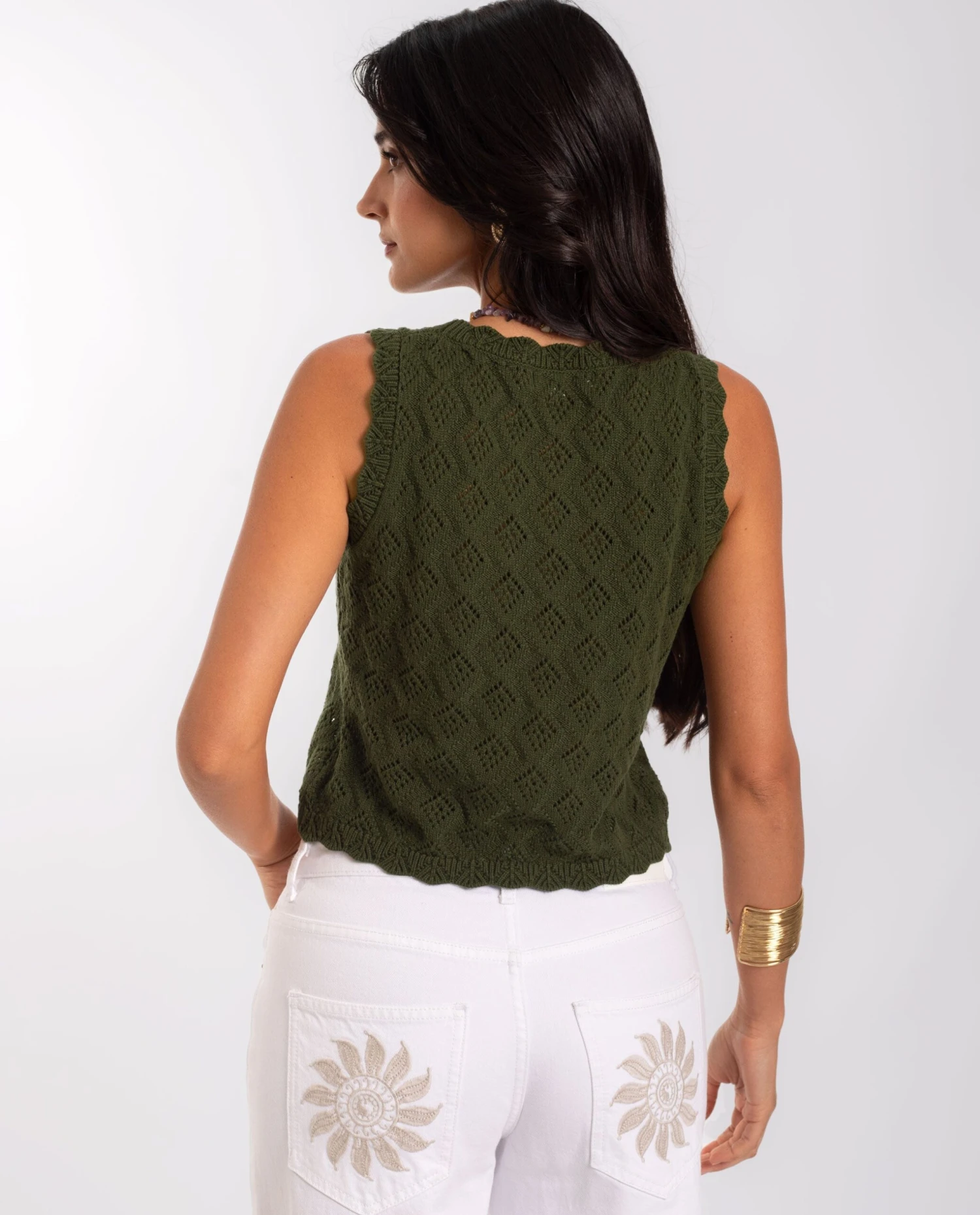 Top crop de crochet en algodón.[readmore]Un básico especial, fresco y con estilo para tus looks de verano. Este top crop de crochet tiene tirantes anchos y un cuello redondo que aporta comodidad y un toque casual. Las terminaciones en ondas en tirantes, bajo y cuello le dan un detalle especial sin perder sencillez. El punto fino lo hace ligero y agradable para los días más calurosos. Combínalo con pantalones o faldas para un outfit desenfadado y cómodo. ¡Se convertirá en una de tus piezas claves para el verano!