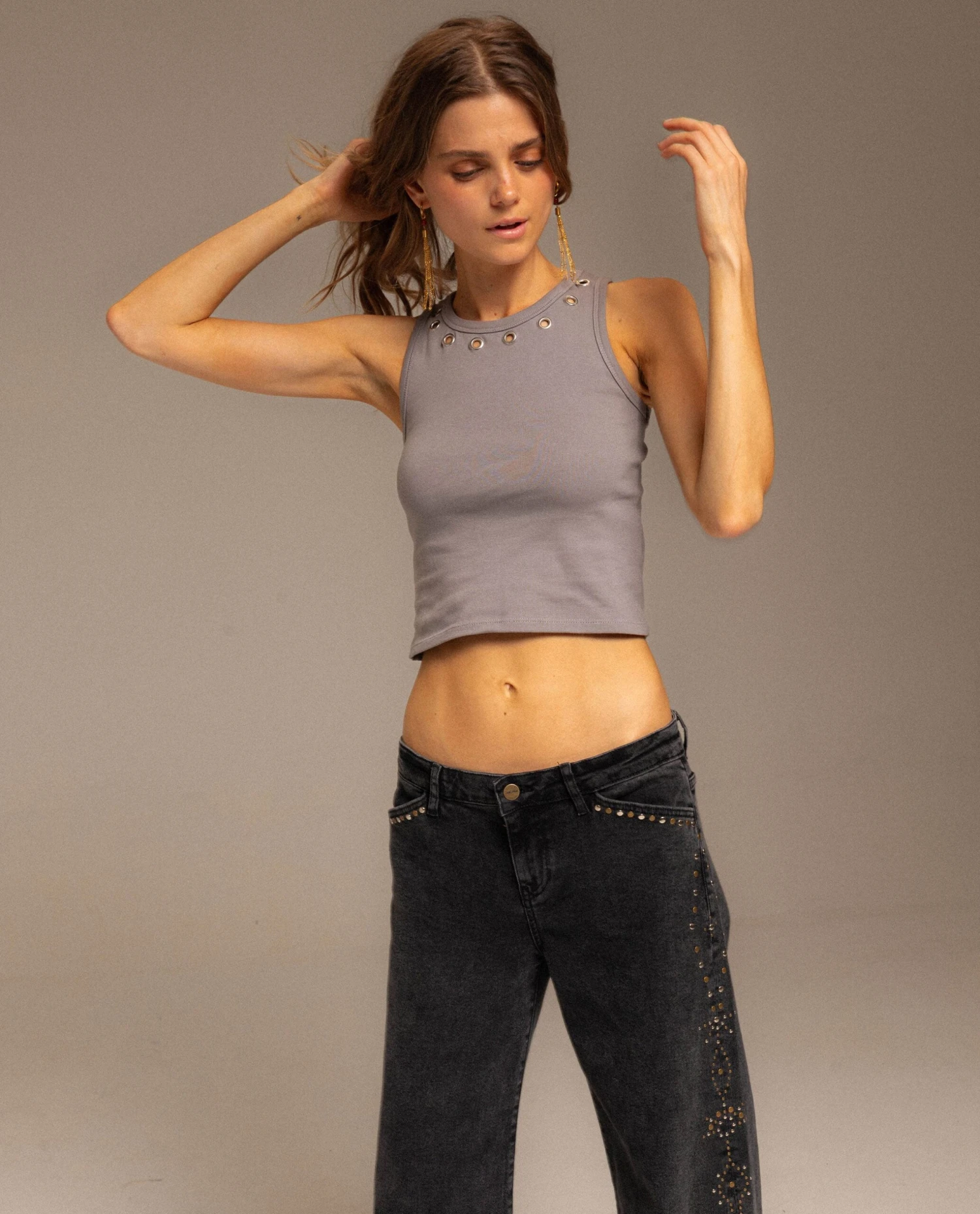 Top crop de tirantes con detalles metálicos.[readmore]Este top tiene ese equilibrio perfecto entre sencillez y estilo. El detalle de los ojales metálicos en el escote, aporta una vibra diferente que transforma por completo su diseño. Está pensado para llevar con vaqueros, pantalones fluidos o incluso una falda si quieres arriesgar más. Una prenda versátil, con un aire actual y urbano que se adapta a ti. Te encantará!
