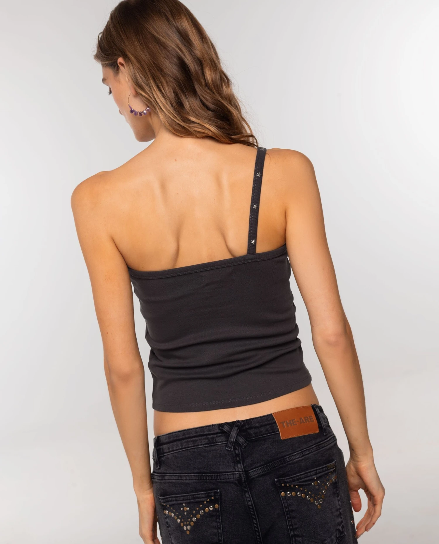 Top crop asimétrico con tirante y estrellas metálicas en el escote.[readmore]Este top crop hará brillar tu look!. Su diseño asimétrico con un solo tirante y detalle de tachuelas metálicas con forma de estrella en el escorte, rompen con lo clásico y será una de esas prendas que te pondrás mil y una vez. Juvenil, diferente y con ese punto especial de estilo que lo convierte en una de esas prendas que todas tus amigas te pedirán prestada!.