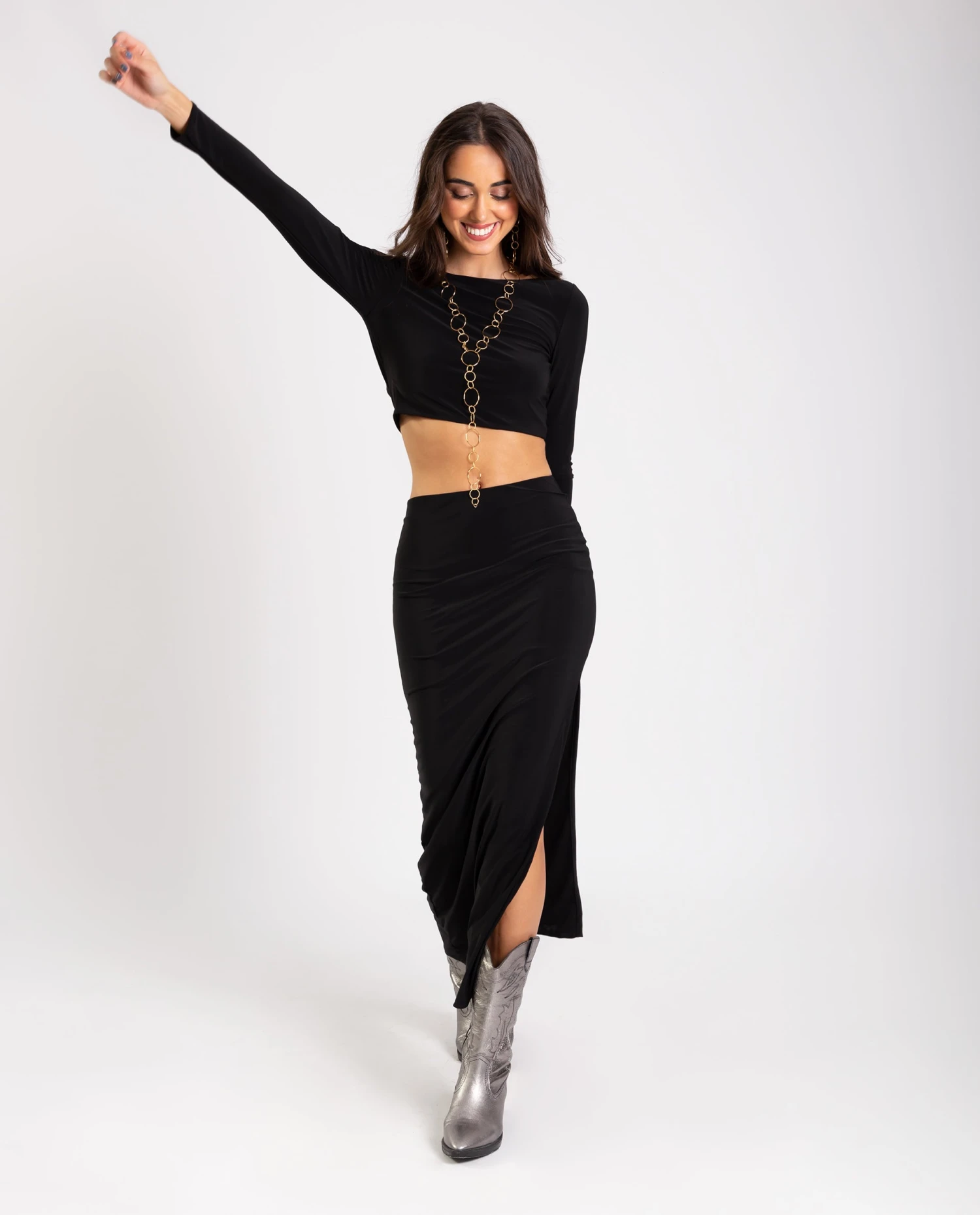 Top negro con espalda abierta y manga larga.[readmore]Te presentamos el conjunto de top y falda con el que siempre arrasarás! Nuestra diseñadora ha pensado en cada detalle para que sea el conjunto que mejor siente: top con espalda abierta y lazada, falda larga de tubo y tejido de punto elástico que se adapta a todo tipo de siluetas. Es un conjunto con que el que te sentirás espectacular, atrevido y elegante al mismo tiempo! Ya te imaginamos saliendo de fiesta con tus amigas!🤞🏼