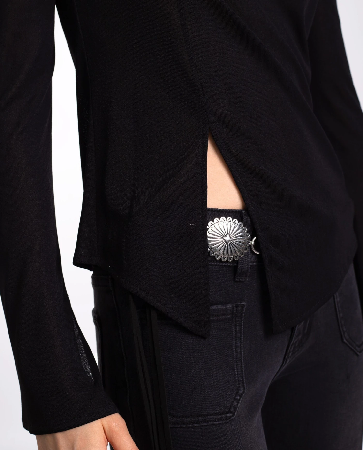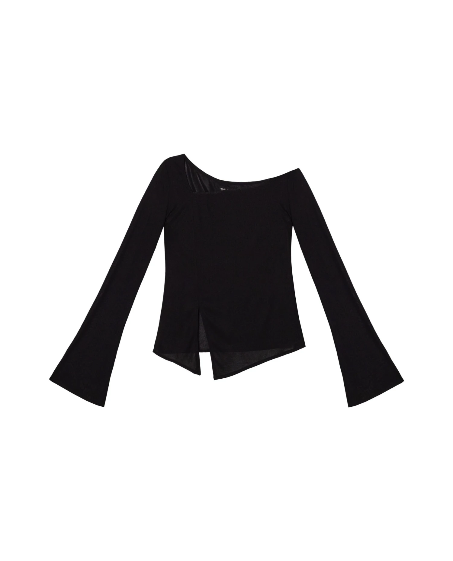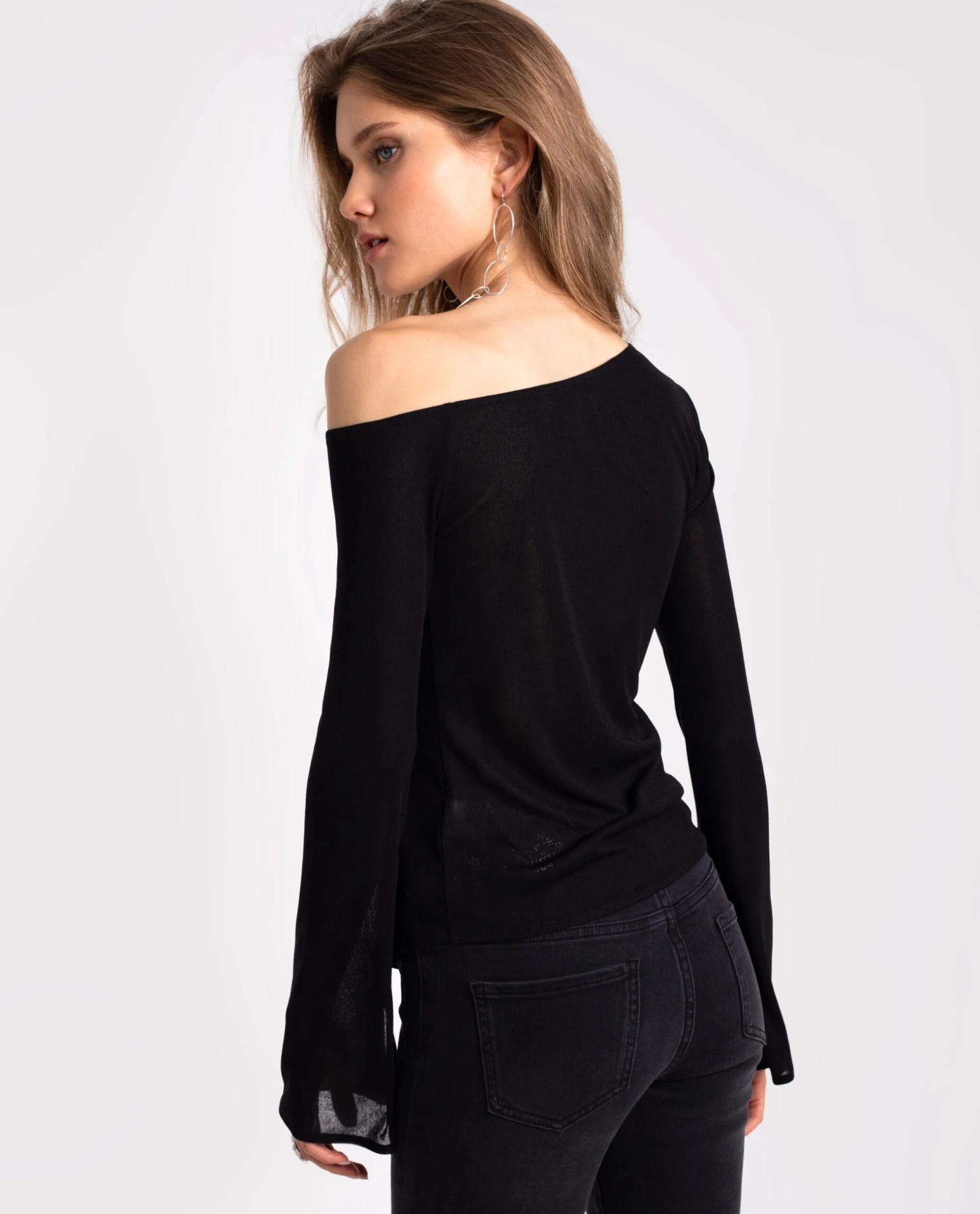 Top negro de punto con manga y hombro asimétrico descubierto.[readmore]Este top es la opción perfecta para darle un toque original a cualquier look con unos jeans. El tejido es de punto elástico que se adapta a ti y destaca por su diseño asimétrico tanto en el escote como en el bajo. Tiene las mangas acampanadas, mientras que el escote asimétrico deja uno de los hombros al descubierto, aportando un toque sexy y elegante. El detalle del bajo abierto en dos picos le añade ese extra de estilo.
