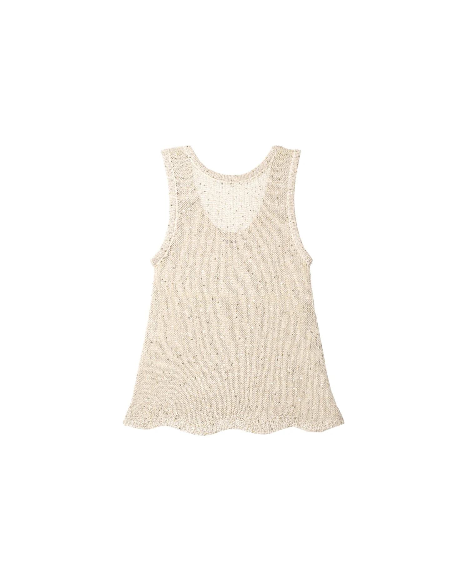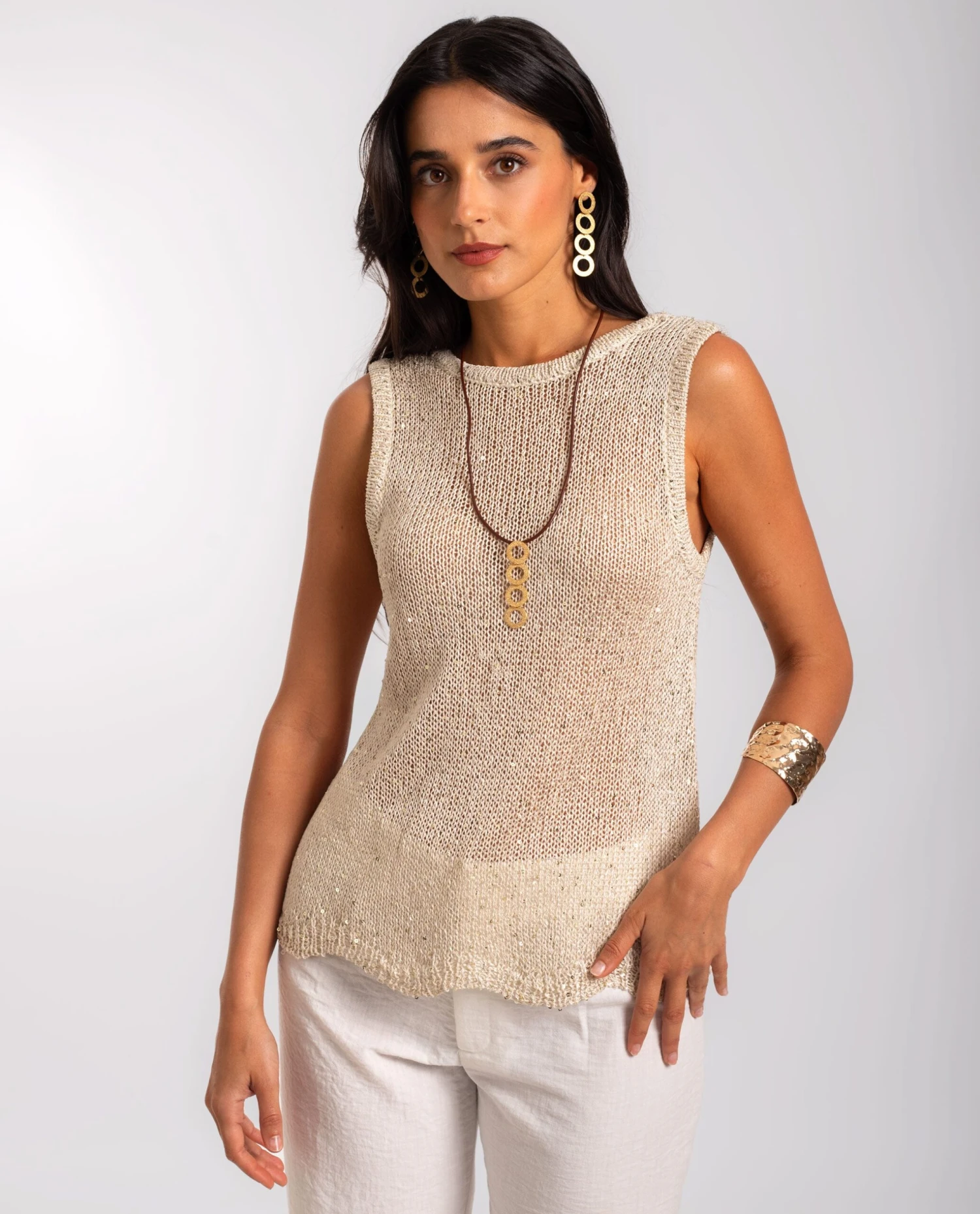 Top dorado de punto con tirantes anchos[readmore].¡Necesitas este top para verano! Su tejido es uno de los más especiales, ligero, de un punto muy agradable y con brillo dorado gracias a las mini lentejuelas integradas. El top tiene diseño decuello redondo y tirantes anchos. Es una prenda muy fácil de combinar que le dará el toque especial y más elegante a tus looks de verano.