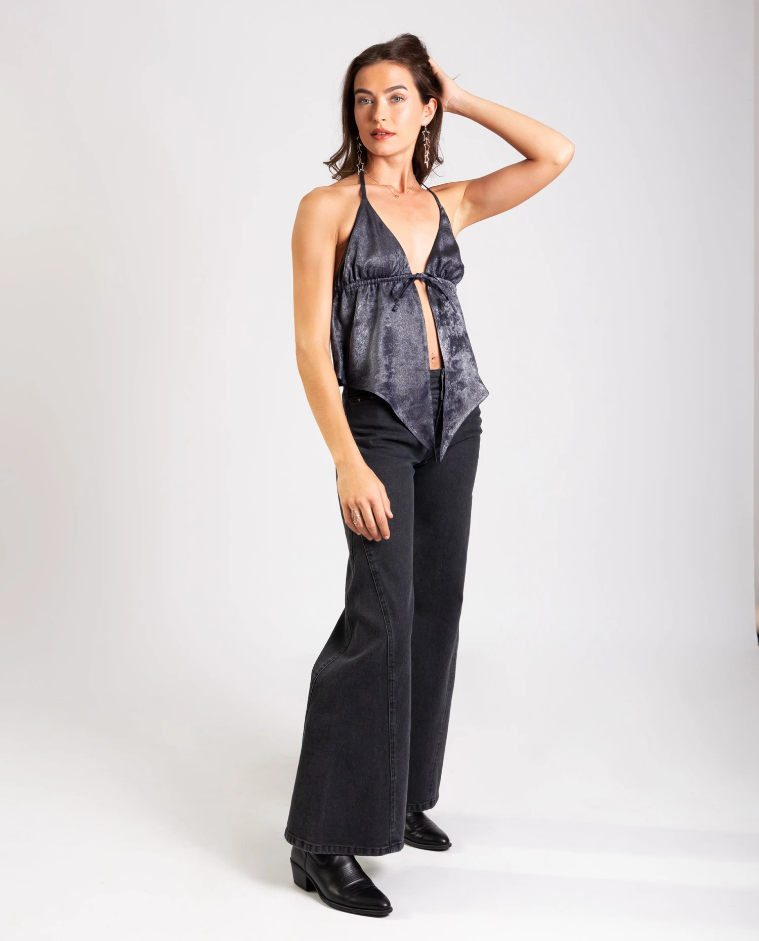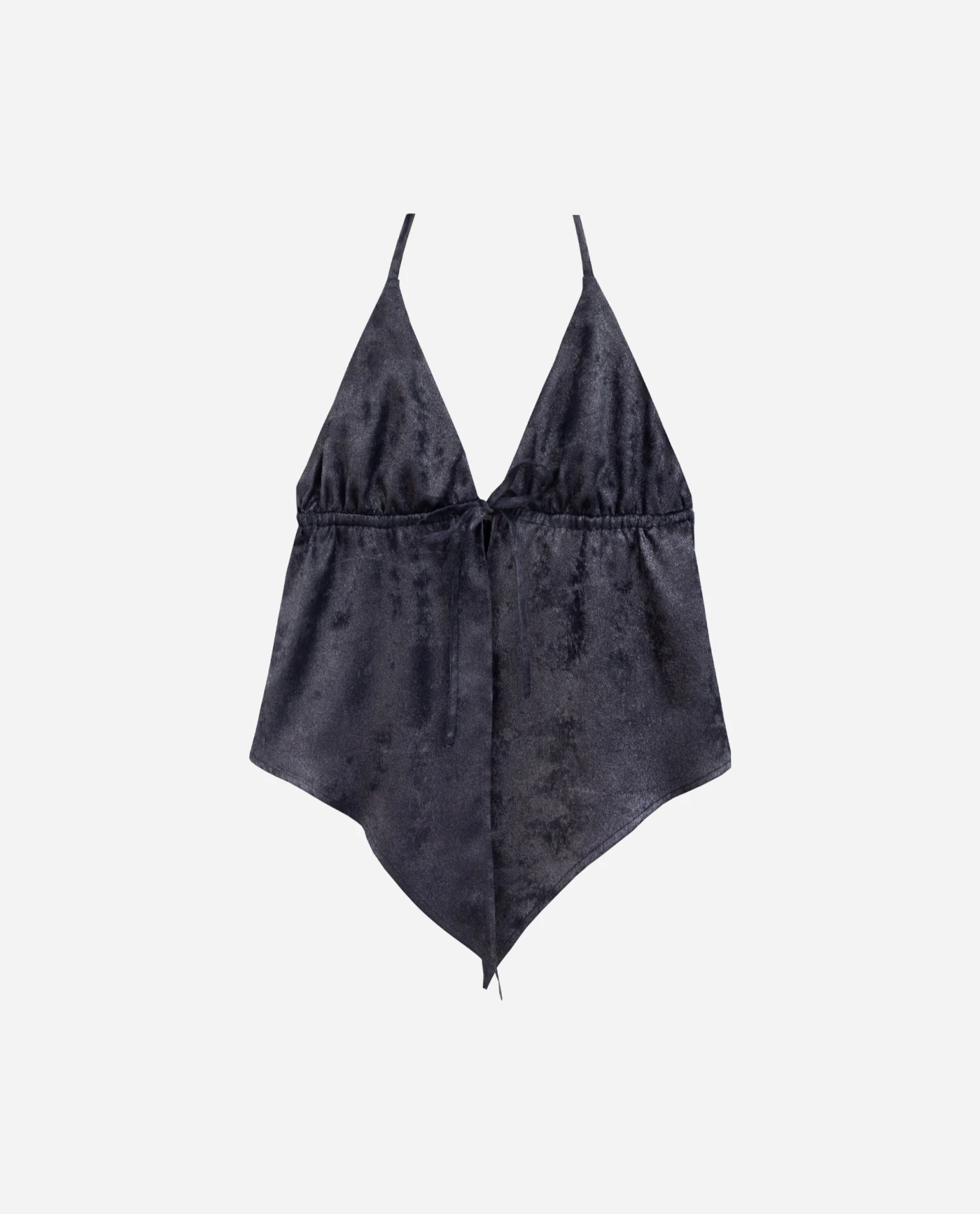 Top triángulo metalizado con espalda descubierta.[readmore]Este top te va a encantar especialmente por su tejido metalizado con lurex y la espalda al descubierto, con él no pasarás desapercibida! El escote triángulo es abierto y totalmente regulable, por lo que lo puedes llevar más abierto o cerrado. Va anudado al cuello con una lazada, así que sienta perfecto. Atrévete con este look, lo llevarás en todas tus fiestas!