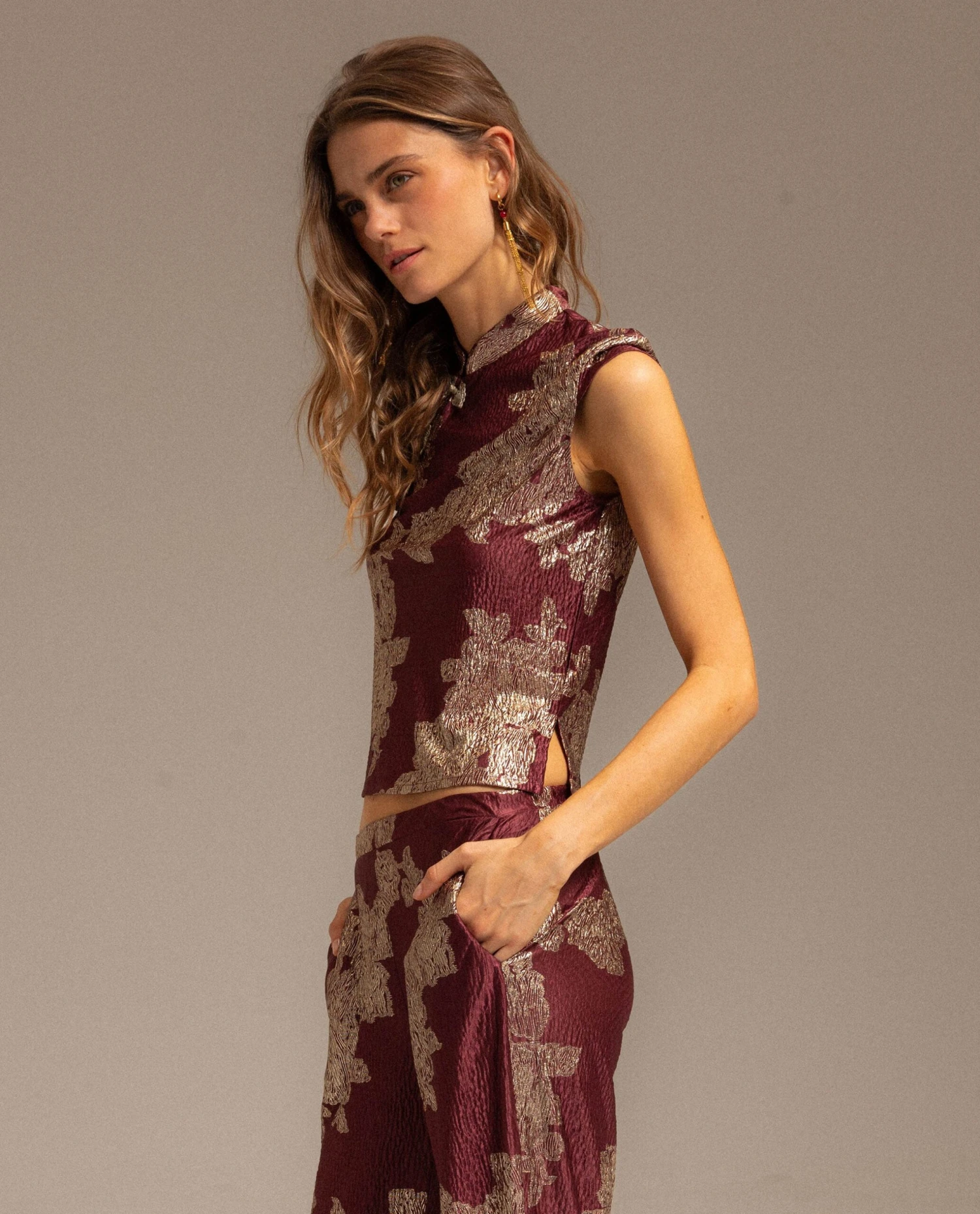 Top burdeos con estampado jacquard.[readmore]Si buscas un look especial, este conjunto de top y pantalón lo tiene todo. Confeccionado con tejido jacquard satinado con motivos orientales que le da un toque especial, y el escote cerrado con abertura lateral de alamares del top es el toque de estilo perfecto. Los pantalones tienen el corte perfecto para combinar comodidad y estilo: recto, fluido y con goma en la cintura. Sin duda es el conjunto perfecto para ser la más cool de la fiesta. Combínalo con complementos en dorado para conseguir el look perfecto.
