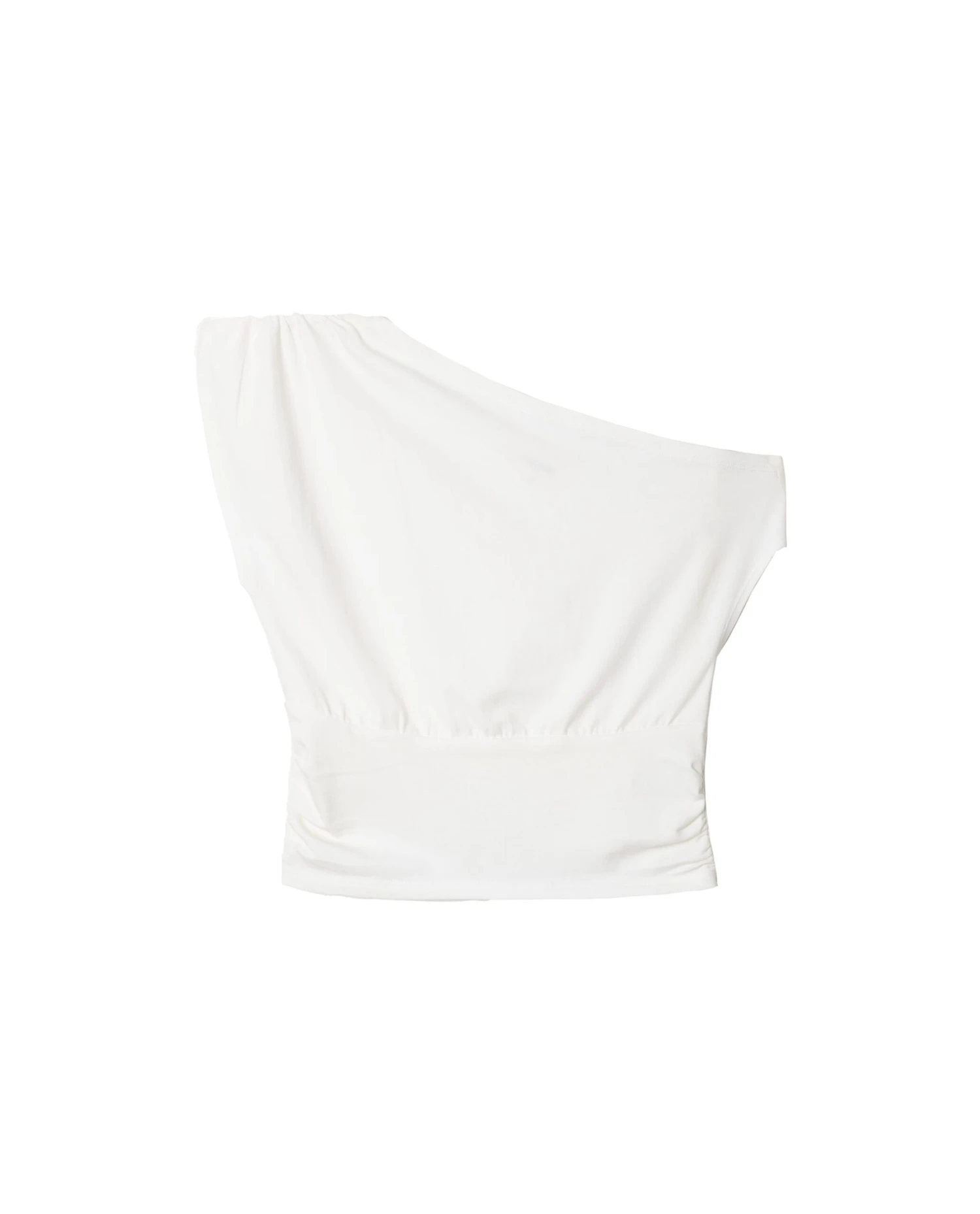 Top asimétrico con cuerpo ajustado.[readmore]Minimal, pero con rollazo. Este top blanco asimétrico es de esas prendas que se cuelan en todos tus planes: desde una cena con amigas hasta un evento más especial. El corte crop y el cuerpo entallado se ajustan al tronco creando una silueta definida, mientras que la asimetría en el escote aporta ese punto moderno que lo cambia todo. Está confeccionado en un tejido elástico de algodón que se adapta perfectamente, así que es cómodo y sienta bien. ¡Te proponemos combinarlo con unos pantalones wide leg o una falda fluida!