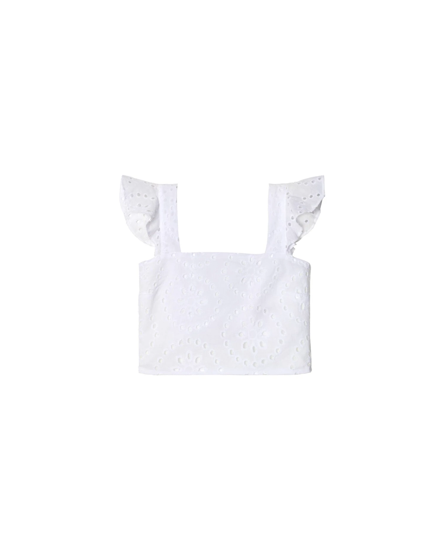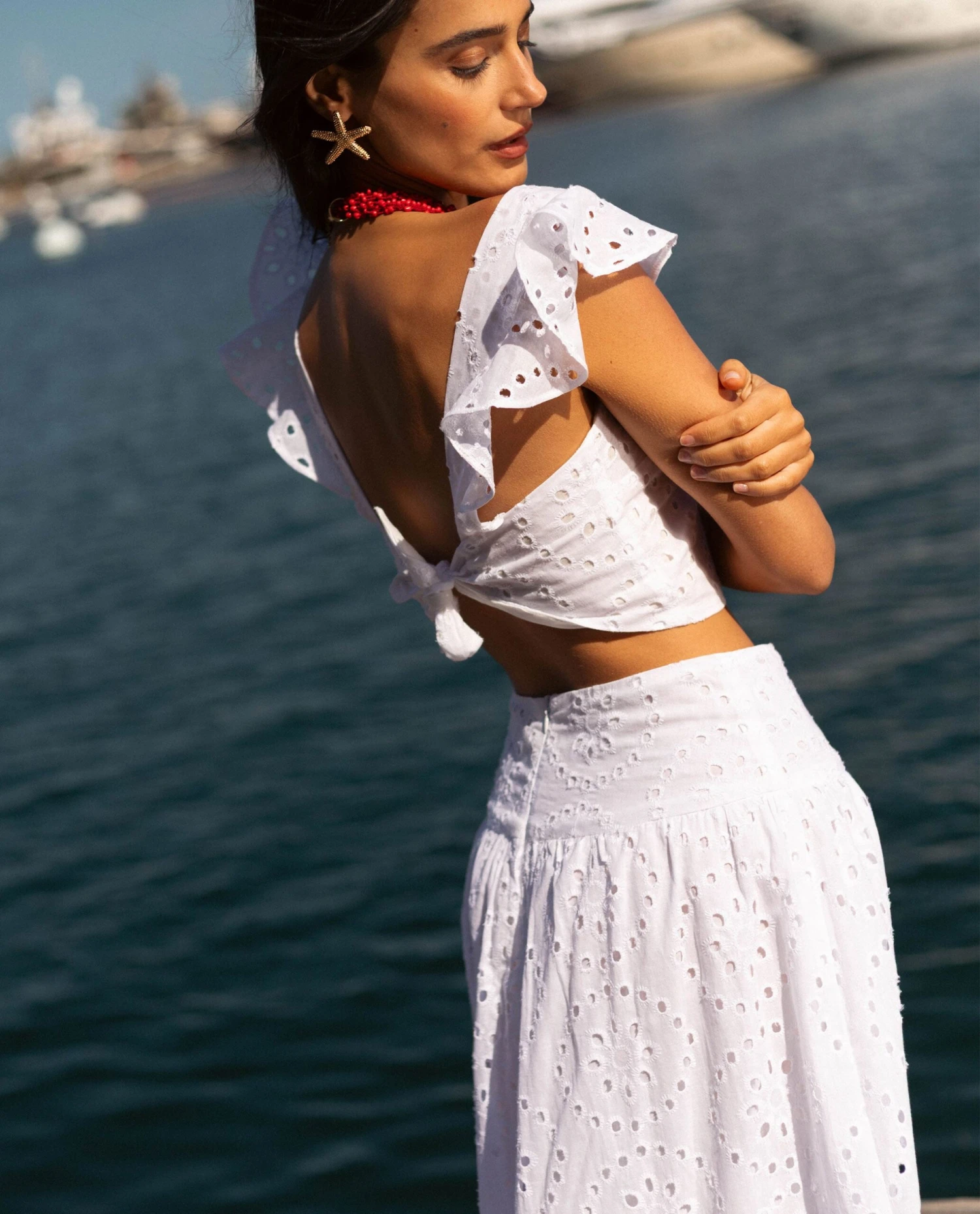 Top de popelín bordado y corte crop.[readmore]Este top crop de popelín bordado es puro detalle: escote cuadrado, tirantes con volante y lazada en la espalda para ajustarlo como quieras. Está diseñado para para que lo lleves con su falda a conjunto, hecha con la misma tela, de corte largo y con un vuelo que queda genial. ¡El combo perfecto para cualquier plan especial este verano!