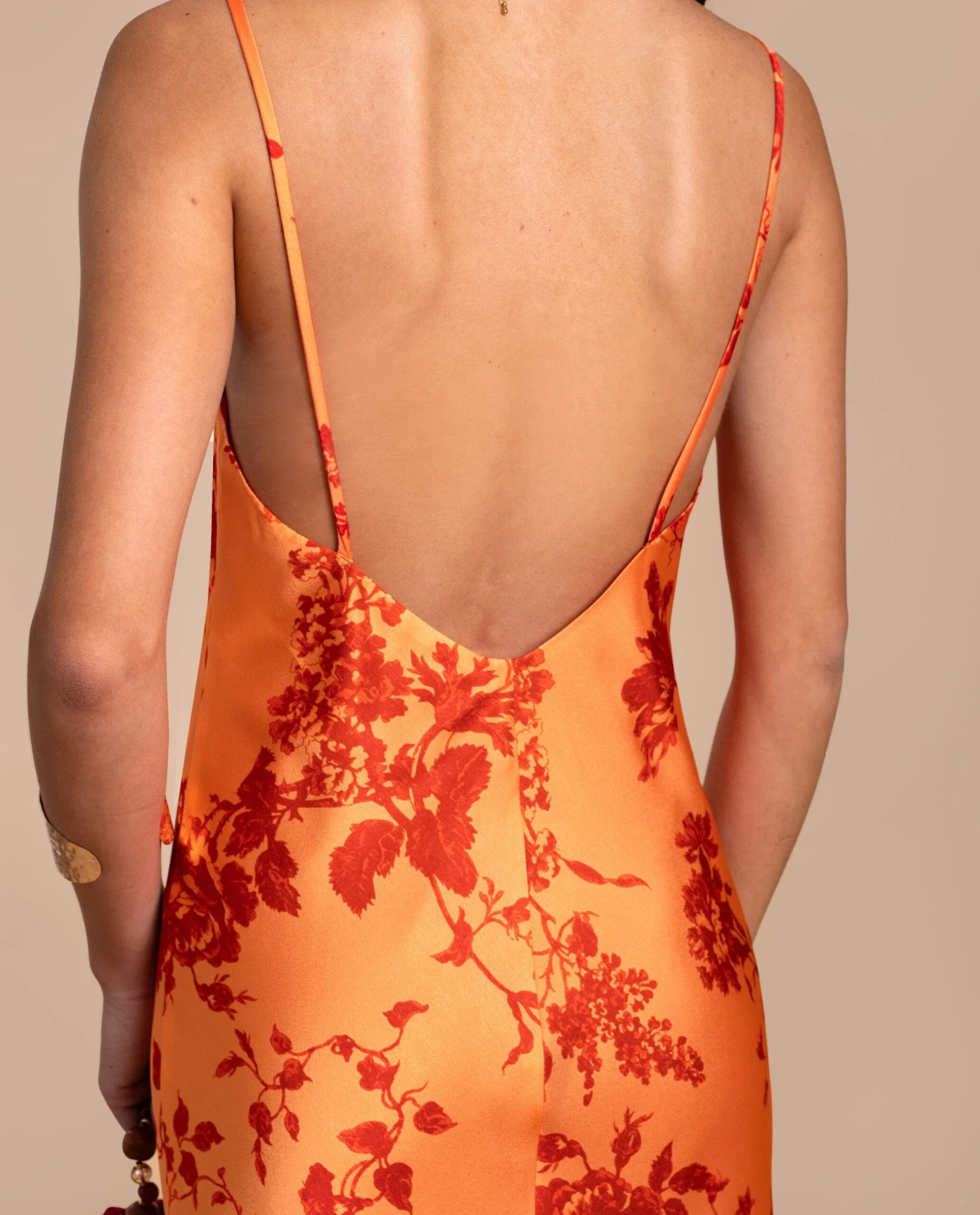 Vestido lencero de flores con tirantes ajustables y espalda abierta.[readmore]Si buscas un vestido especial y versátil, este diseño lencero es perfecto para ti. Está cortado al bies para adaptarse al cuerpo con una caída espectacular. Su estampado de flores en tonos naranjas sobre fondo liso crea una combinación ideal para cualquier ocasión. Los tirantes finos son regulables para adaptarlos a tu medida, dejan la espalda descubierta dándole un toque atrevido. Es uno de esos vestidos que podrás llevar tanto en eventos como en un día especial de primavera-verano.