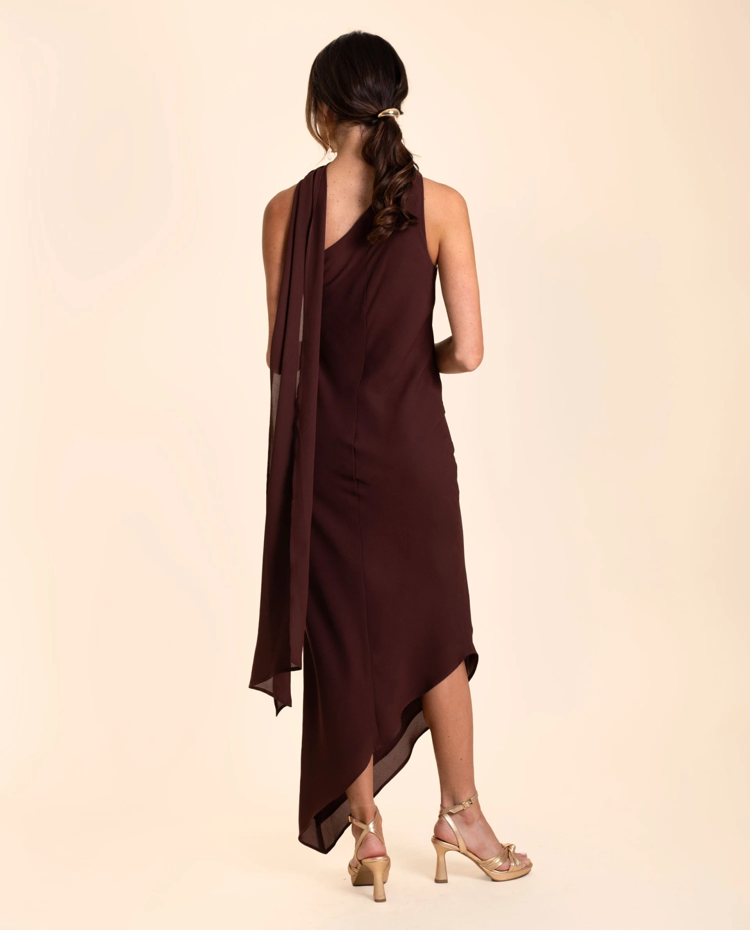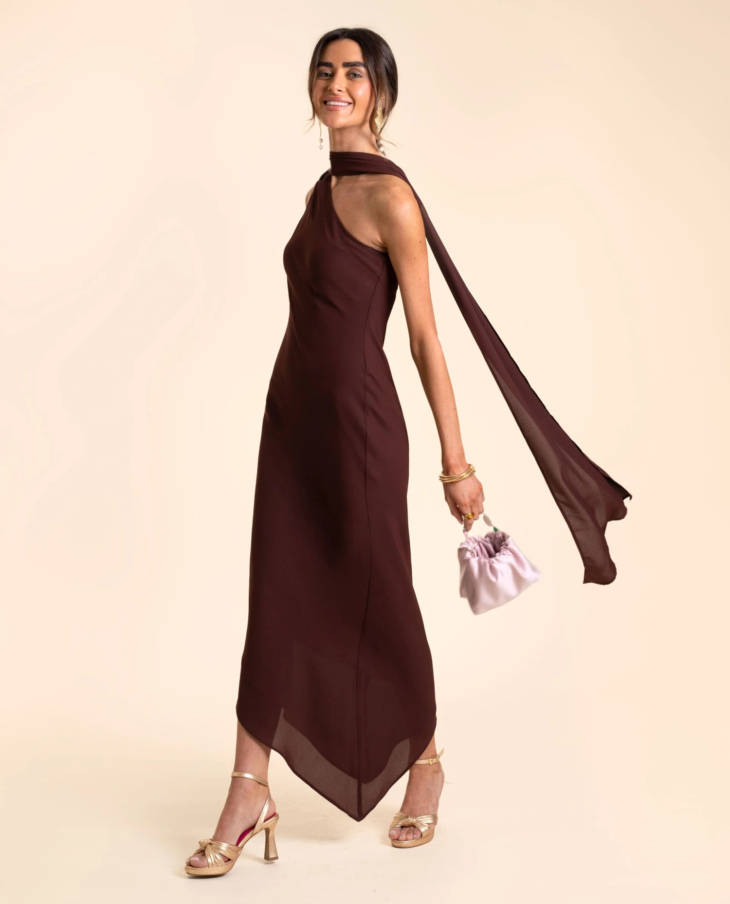 Vestido midi marrón con escote y bajo asimétrico.[readmore]Un vestido con el que triunfarás en cualquier evento de la temporada es este vestido midi asimétrico con lazada al cuello y confeccionado en un color chocolate que sienta espectacular a todo tipo de pieles. El tejido es una doble gasa con mucha caída y gracias a su bajo asimétrico y fular al tono este vestido tiene un movimiento increíble al caminar. El color combina a la perfección con unas sandalias platino y complementos en dorado. Es uno de esos diseños con los que te verás muy estilizada y elegante.