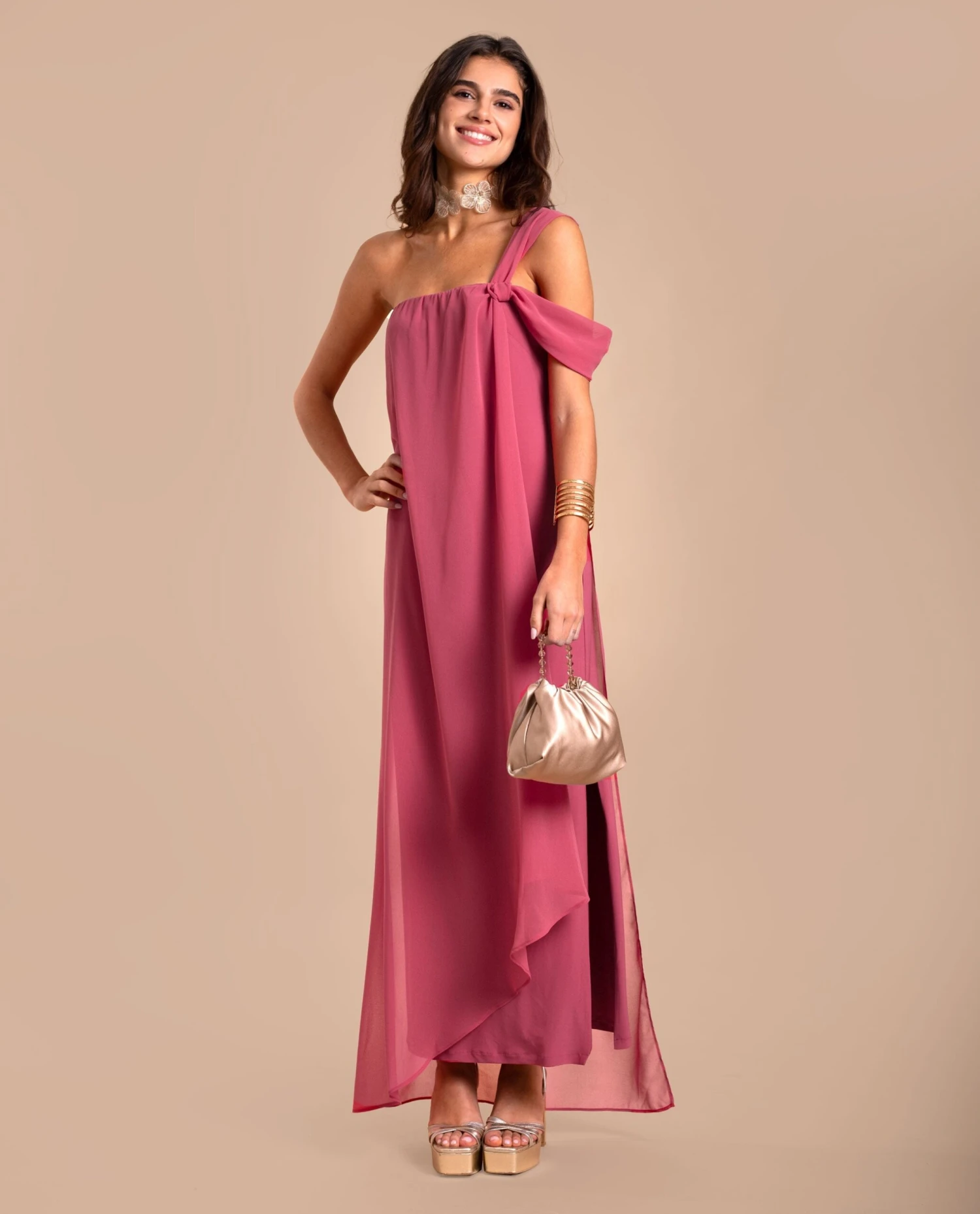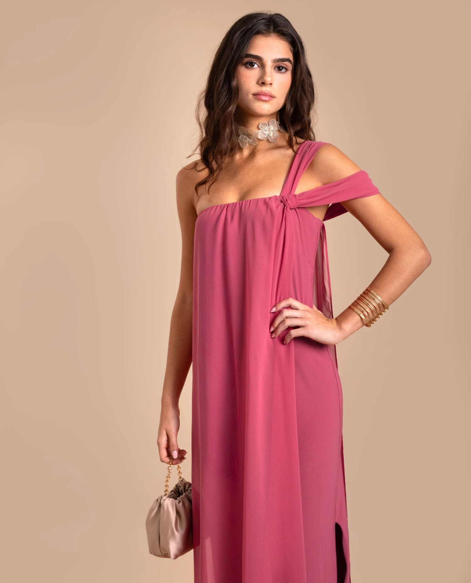 Vestido largo con escote palabra de honor y capa de gasa.[readmore]Si buscas un look elegante y original para tu próximo evento, este vestido es para ti. Su diseño combina un vestido largo de palabra de honor en rosa con una capa a tono de gasa que añade movimiento y un toque sofisticado. La caída de la capa sobre el hombro crea un tirante asimétrico con detalle de nudo, dándole un acabado especial. El toque de color lo hace perfecto para cualquier evento y su corte favorece muchísimo. No te quedes sin él, ¡es uno de los favoritos de la colección!