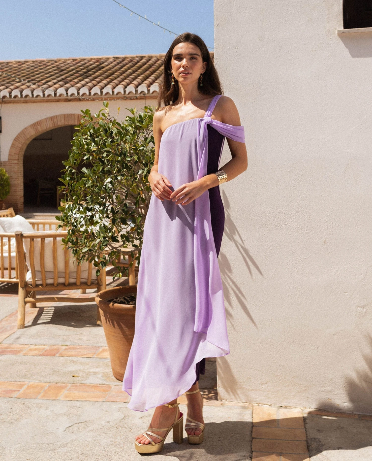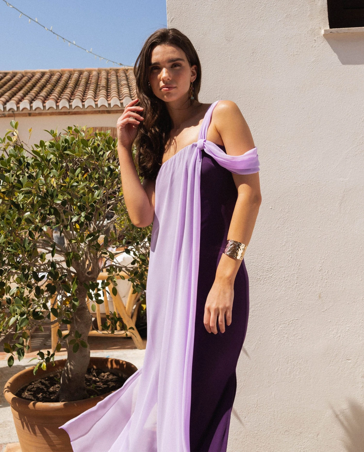 Vestido largo escote palabra de honor de invitada.[readmore]El Vestido Almería es un diseño para esas invitadas que buscan un look elegante, sencillo y original con el que sorprender en su próximo evento. Compuesto por un vestido largo de palabra de honor morado y una capa lila de gasa que contrasta a la perfección y aporta movimiento. La combinación de colores hace que sea un vestido perfecto tanto para eventos de día como de noche, además de que por su diseño favorece la silueta. La capa cae sobre el hombro creando un tirante asimétrico con el detalle de un nudo. Es uno de los favoritos de la colección, así que hazte con él antes de que se agote tu talla!🤞🏼