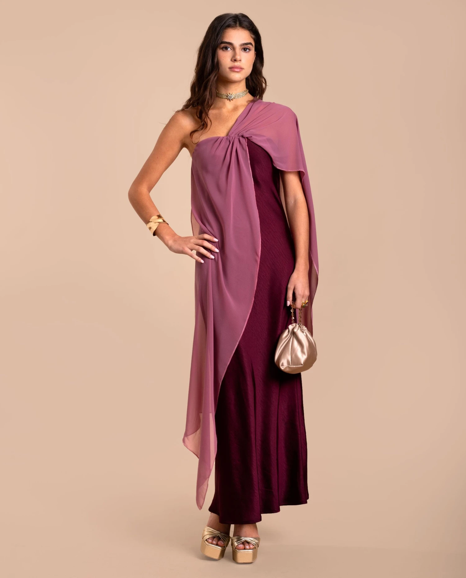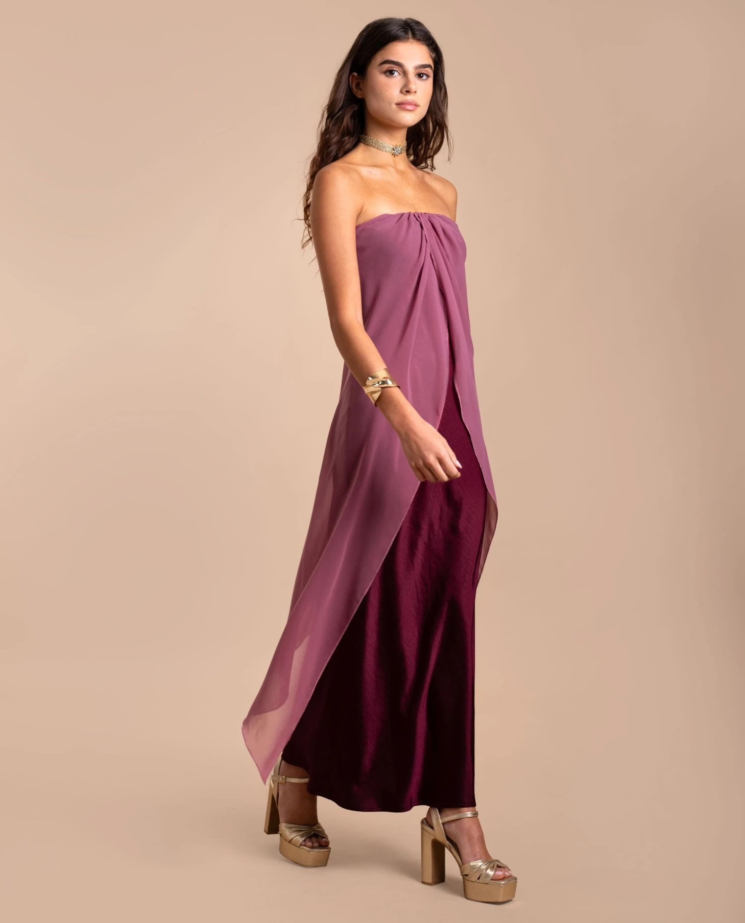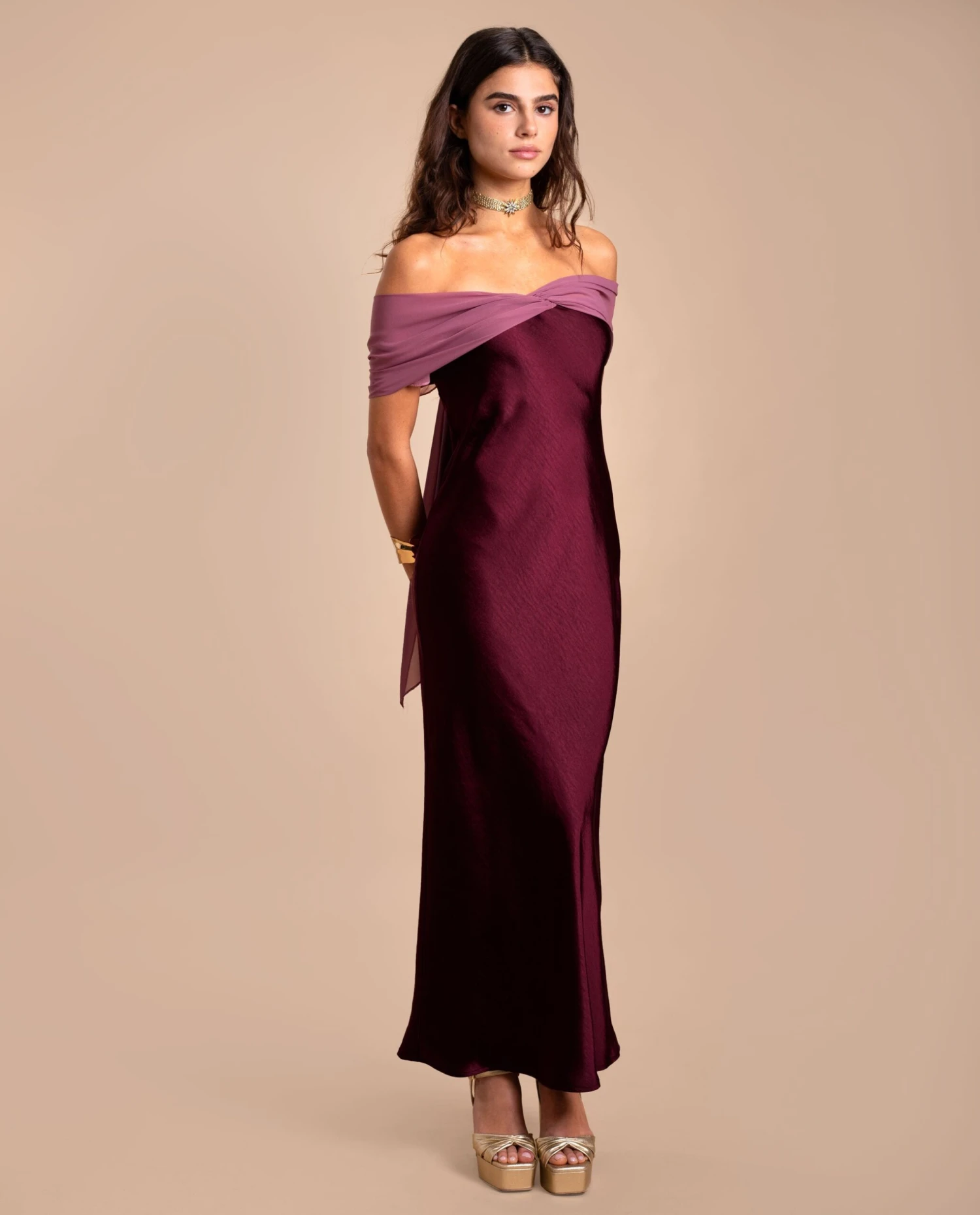 Vestido largo satinado con escote palabra de honor y capa de gasa.[readmore]Si buscas un vestido especial para tu próximo evento, este diseño lo tiene todo. Su base es un vestido midi satinado con escote palabra de honor que crea una silueta fluida y una capa de gasa en contraste. Esta capa se superpone en el escote y cae con un drapeado ligero en el centro, aportando movimiento y un toque original. El contraste de tejidos y texturas hace que sea una opción versátil tanto para eventos de día como de noche. ¡Hazte con él antes de que vuele tu talla!.