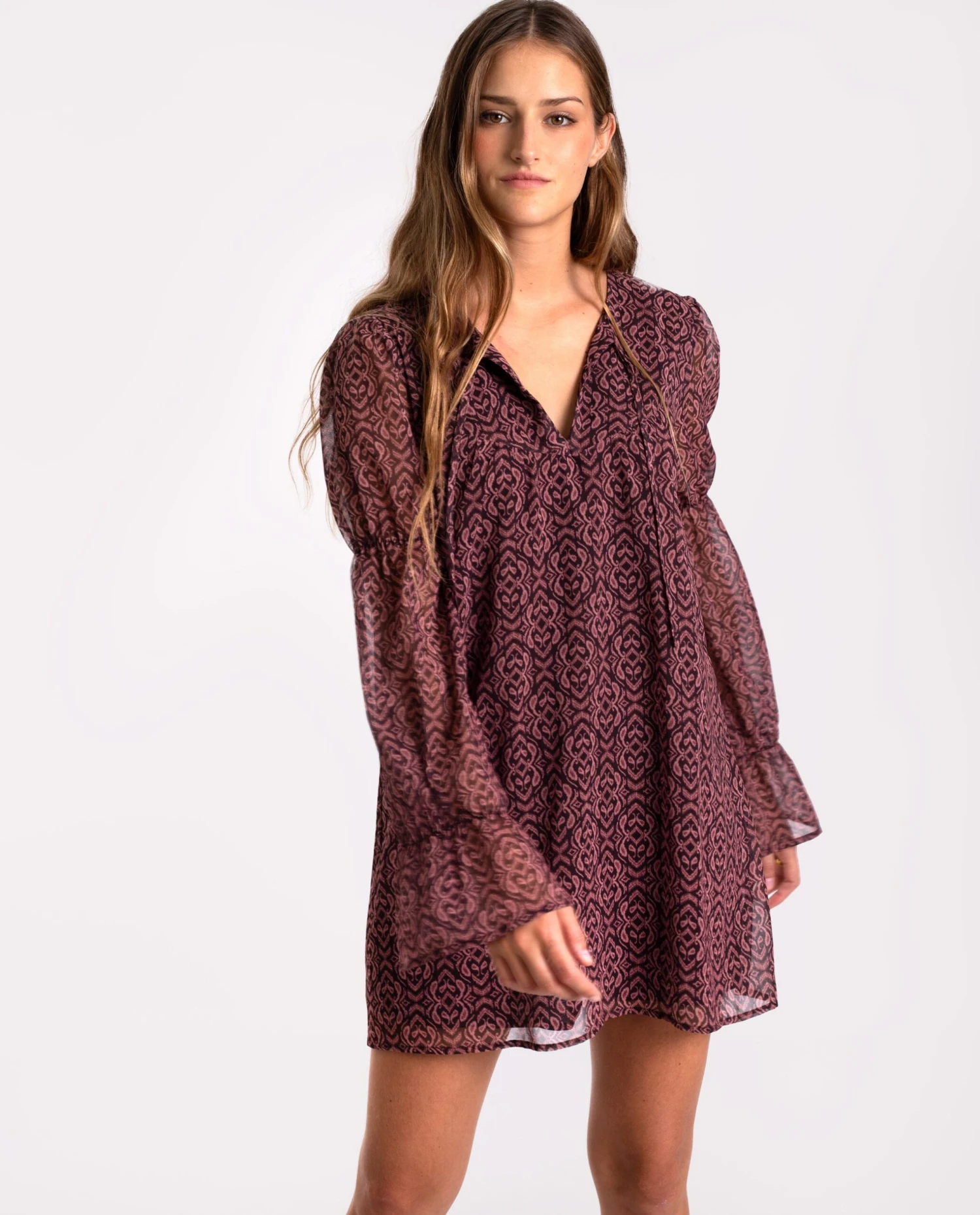 Vestido corto manga larga estampado étnico marrón.[readmore]Nos encantan los vestidos cortos que te pondrías para todo y sabemos que a vosotras también. Es un vestido corto muy cómodo gracias a su diseño fluido y forro de pantalón. Tiene el detalle de mangas engomadas y escote en pico con canesú y lazadas para darle el toque boho. Perfecto para un look casual o un día más especial, ¡no puede faltar en tu armario!
