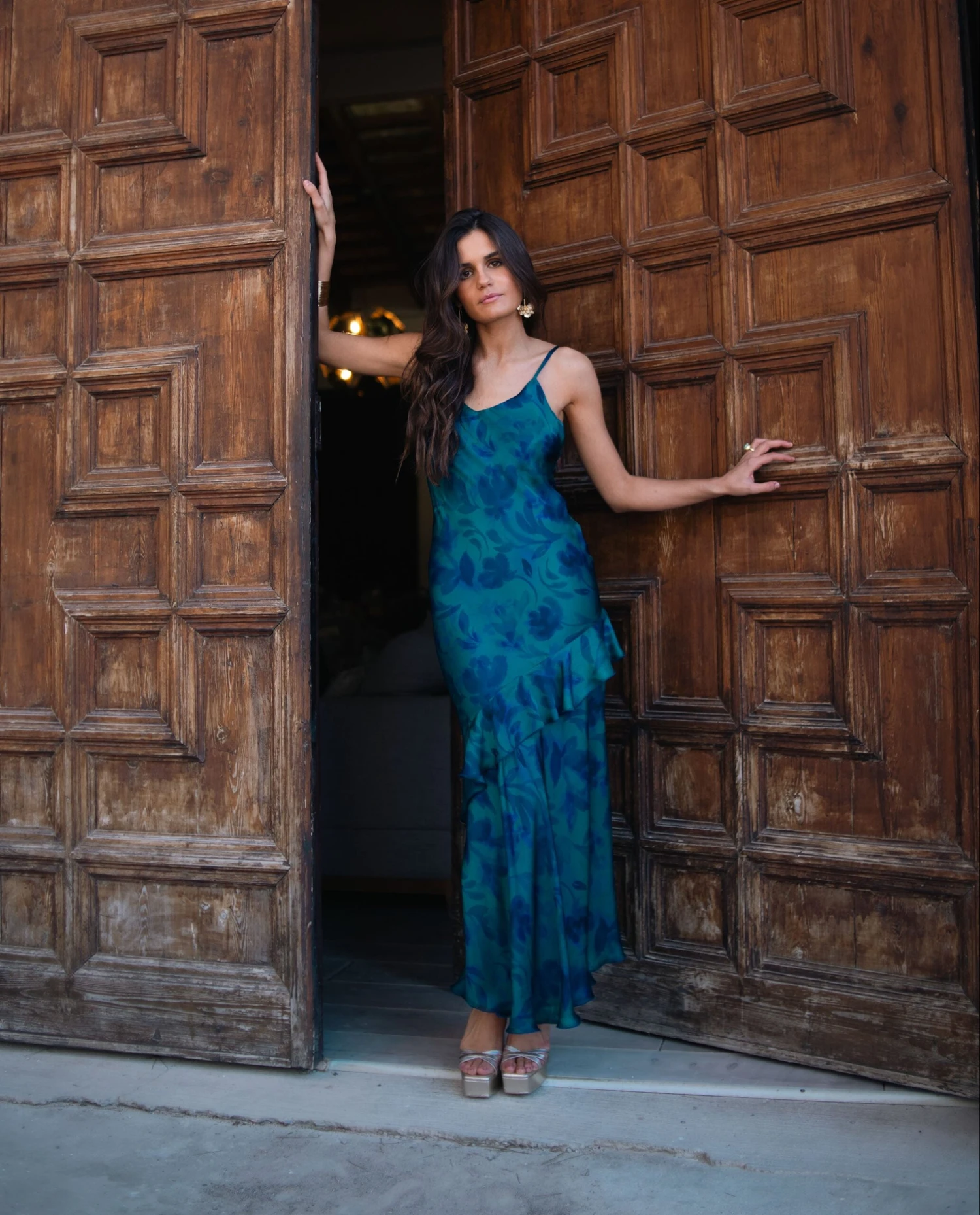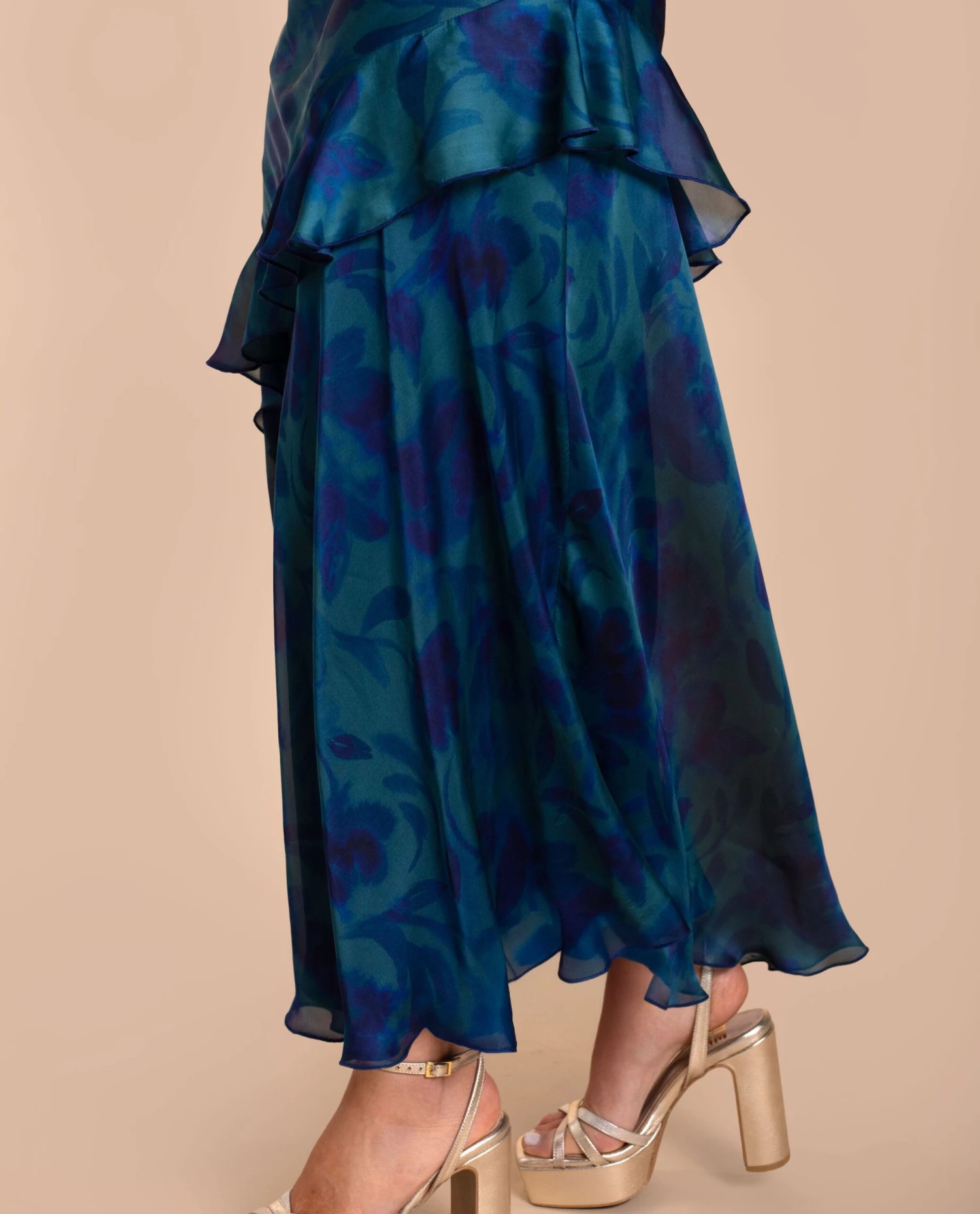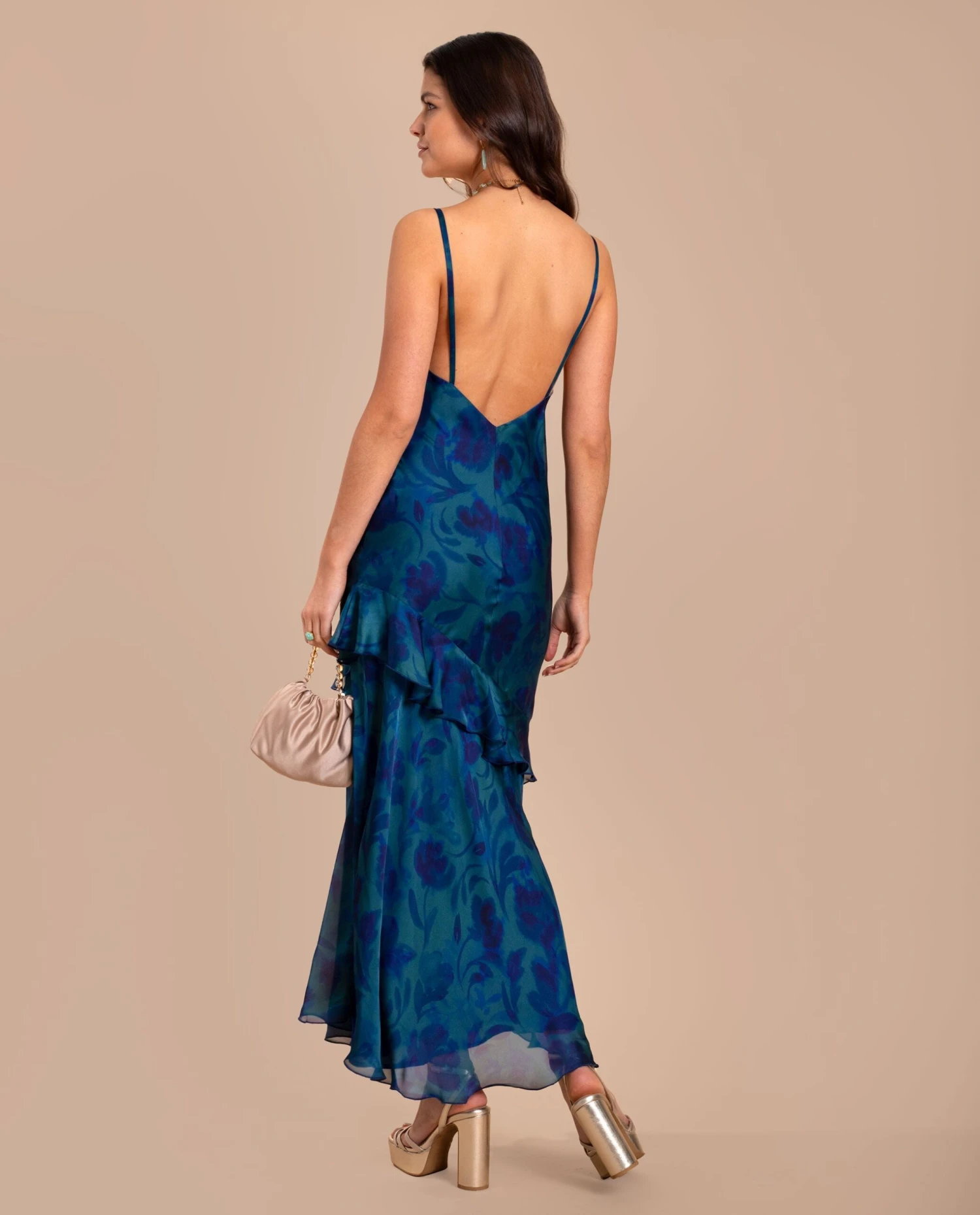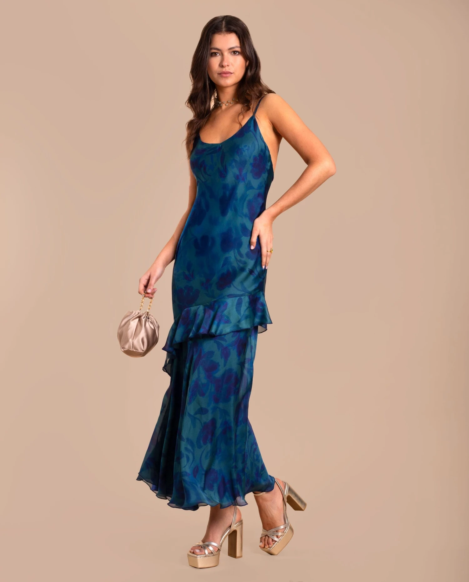 Vestido largo lencero con volantes.[readmore]Este vestido es la definición de elegancia. Su diseño lencero, con tirantes finos y escote en pico, estiliza la silueta. La falda larga con volantes aporta movimiento, creando un vuelo precioso en cada paso. El estampado floral en tonos azules y verdes sobre su tejido de gasa lo convierte en una pieza única, perfecta para cada ocasión especial. Su espalda abierta añade un toque sofisticado al look. Combínalo con sandalias en tonos platino y accesorios discretos: este vestido lo dice todo por sí solo.