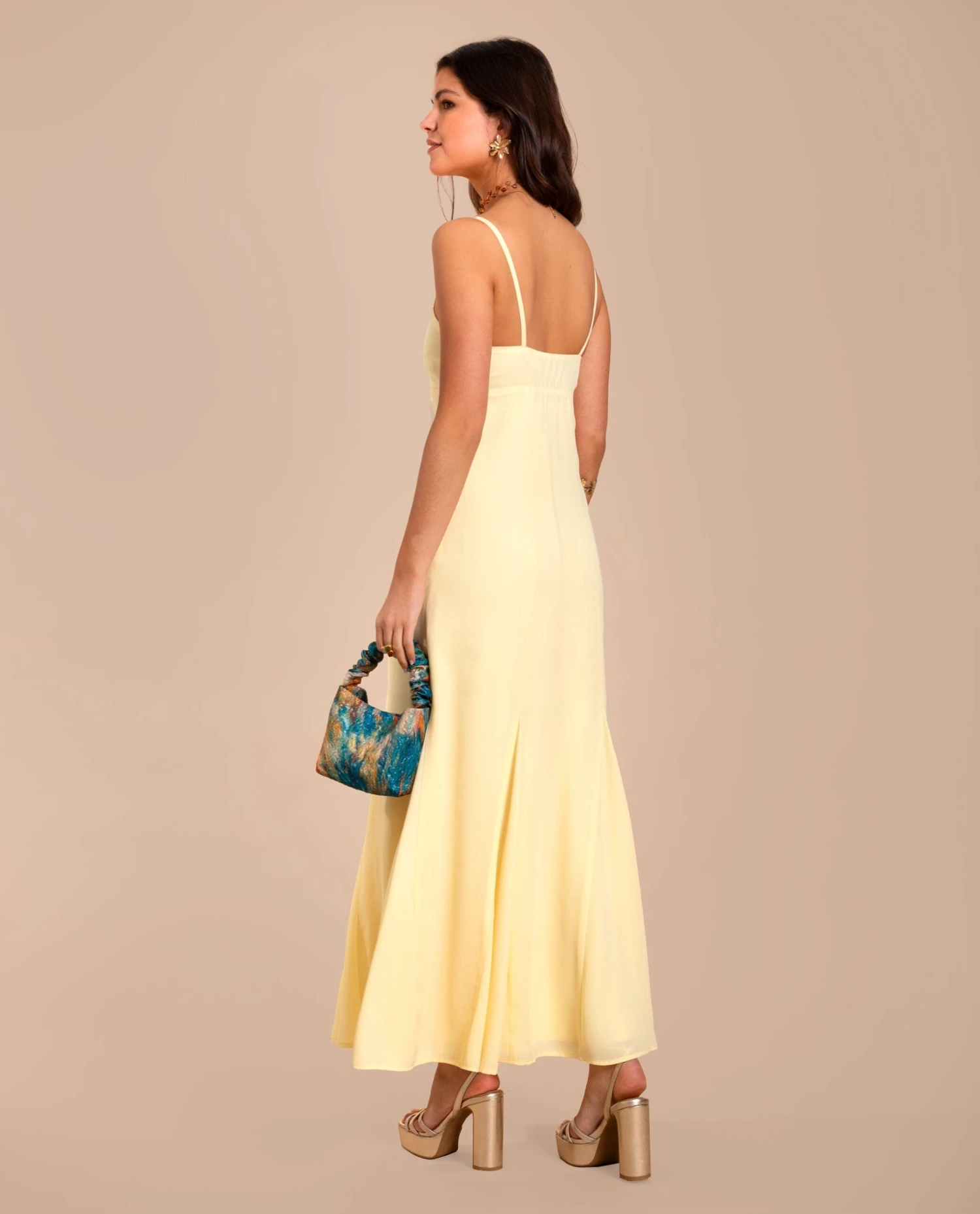 Vestido midi de tirantes amarillo corte imperio.[readmore]Un diseño elegante que te acompañará en los momentos más especiales. Es de corte imperio para estilizar la silueta, con tirantes finos y una falda larga evasé con paneles godet en contraste que añaden movimiento al caminar. Confeccionado en un tejido fluido de gasa, el suave tono amarillo pastel lo convierte en una opción original y sofisticada. Combínalo con una de nuestras capas y accesorios coloridos para destacar en cualquier evento.
