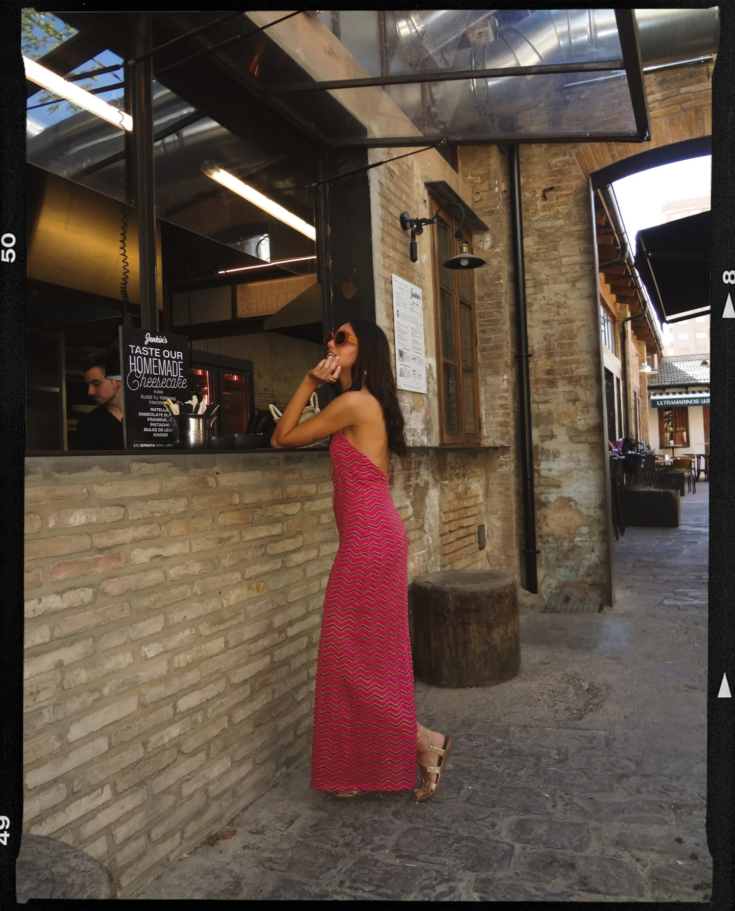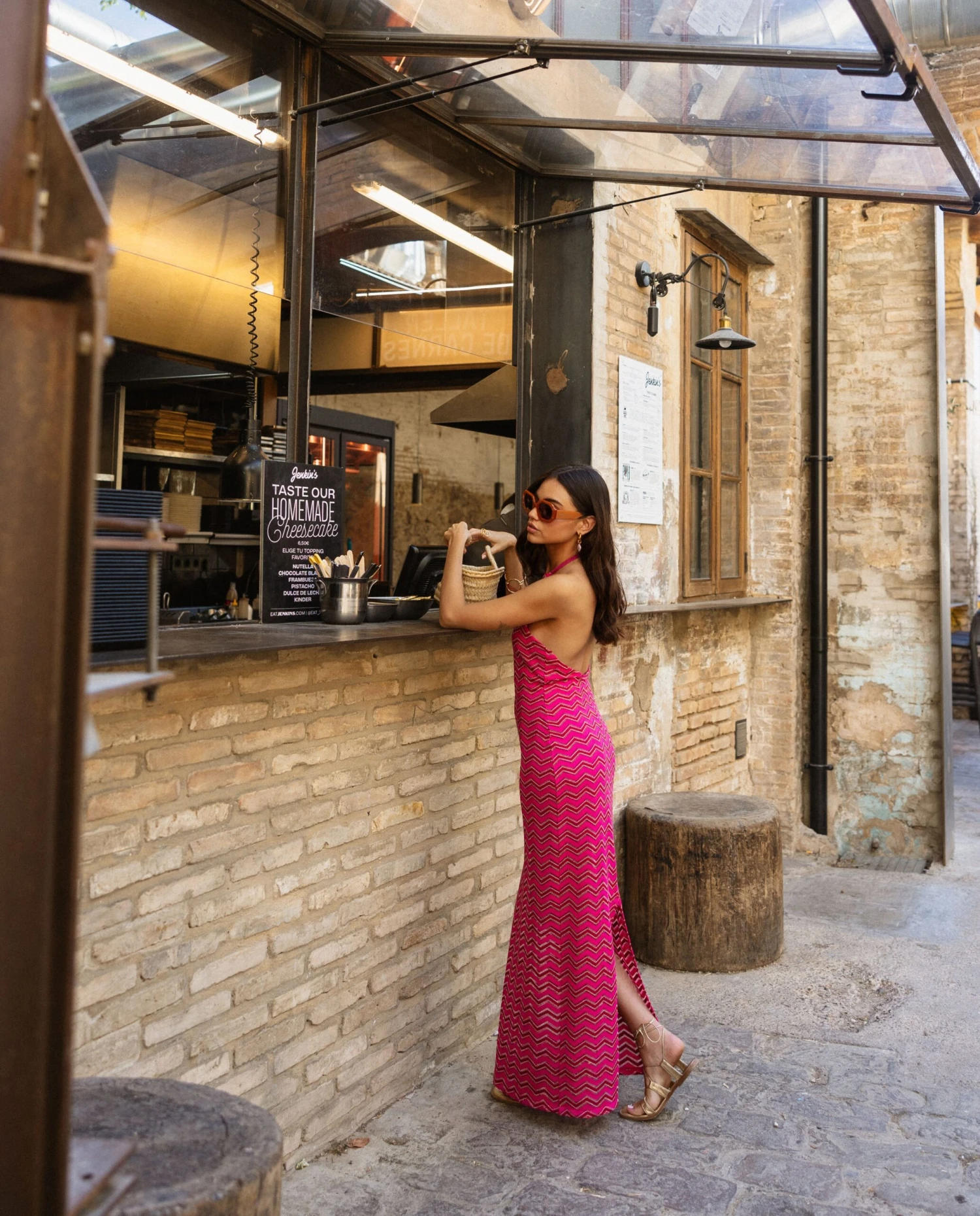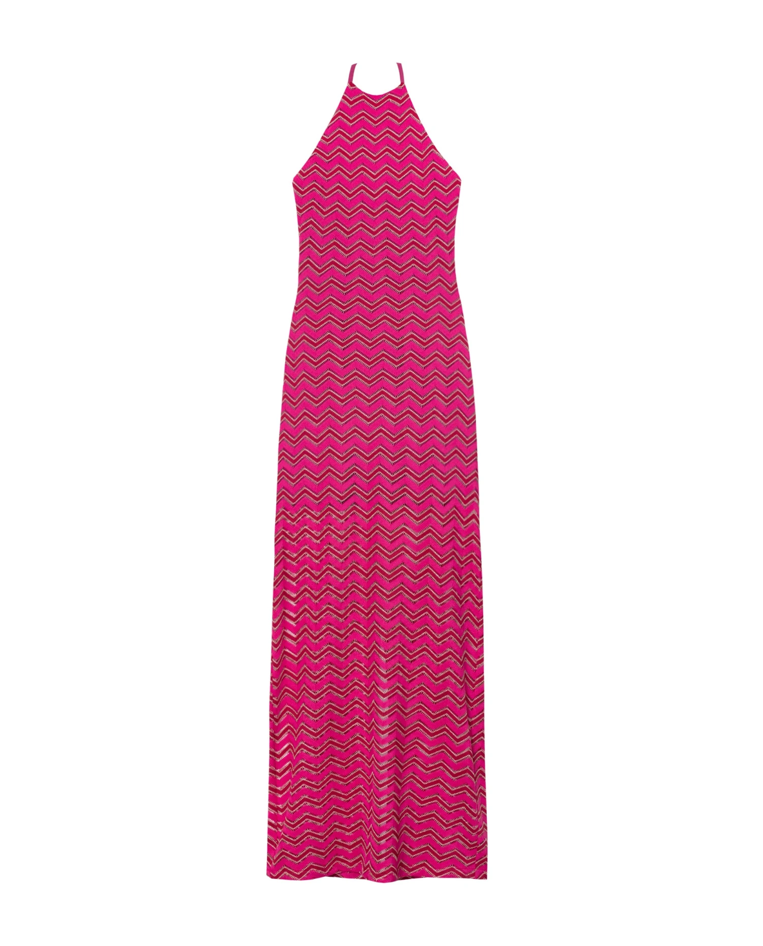 Vestido largo de punto zigzag con brillo.[readmore]Si te quieres marcar un loozako este verano apuesta por este vestido! Tiene la espalda al descubierto y puedes regular su escote halter con la lazada al cuello. Es un vestido de punto con un estampado zigzag que sienta increíble, en tonos fucsias con el detalle de brillos. Lleva una abertura trasera en la falda para que al caminar lo lleves muy cómodo y forro de vestido corto para que transparente lo justo. Ya te imaginamos con él este verano!🤞🏼